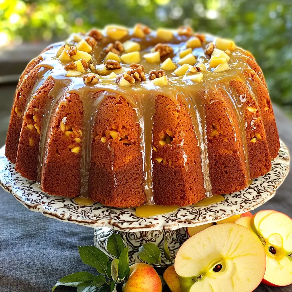 Serve the cake on a pretty stand for a nice look. Drizzle the glaze over the top just before serving. Add some apple slices for a special touch. Each slice shines with flavor.