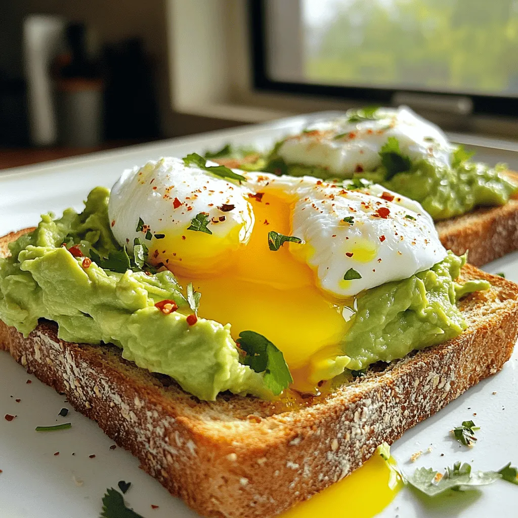 - 2 ripe avocados - 4 slices of whole grain bread - 4 large eggs - 1 tablespoon fresh lemon juice - Salt and pepper to taste - Optional: red pepper flakes for heat - Fresh herbs for garnish To make avocado toast with poached egg, gather these fresh ingredients. Start with ripe avocados. They should feel slightly soft but not mushy. Whole grain bread gives a nice texture and is healthy, too. Eggs are key to this dish; use large eggs for a satisfying poach. Lemon juice adds brightness to the avocado spread. Salt and pepper enhance the flavors, while red pepper flakes can add a bit of heat if you like. Finally, fresh herbs make your dish look and taste wonderful. You can choose cilantro, chives, or parsley, depending on your preference. Check out the Full Recipe to see how these simple ingredients transform into a tasty meal! Start by toasting the whole grain bread. You can use a toaster for quick results. Alternatively, heat a dry skillet over medium heat and add the bread slices. Toast until they turn golden brown and crispy. This gives your toast the perfect base. While the bread toasts, grab your ripe avocados. Cut them in half and scoop the flesh into a bowl. Use a fork to mash the avocado; it should be creamy but still a bit chunky. Stir in fresh lemon juice and a pinch of salt and pepper. This adds flavor and keeps the avocado bright. Fill a medium saucepan with about 3 inches of water. Bring it to a gentle simmer. Crack each egg into a small bowl first. This helps keep them intact. Gently slide each egg into the water, one by one. Poach them for about 3-4 minutes. If you want firmer yolks, cook them a bit longer. Once the bread is toasted, take a slice and spread a generous layer of the avocado mix on top. Place a poached egg carefully on each slice. Make sure the yolk stays intact for that delightful runny experience. This layering creates both flavor and visual appeal. For a little extra heat, sprinkle some red pepper flakes over the poached eggs. This is optional, but it adds a nice kick. Finish by adding fresh herbs like chopped cilantro or chives. They provide a pop of color and freshness. Serve your toast right away to enjoy the great mix of textures and flavors. For the full recipe, check out the instructions above. To poach eggs well, start with fresh eggs. Fresh eggs hold their shape better. A common mistake is using water that boils too hard. This can break the eggs. Instead, let the water simmer gently. Add a splash of vinegar to help the egg whites stay together. If you want tools, consider using a poaching pod or a small mesh strainer. These tools make it easier to transfer eggs into the water. When picking avocados, look for ones that yield slightly to gentle pressure. This means they are ripe and ready. Avoid avocados with dark spots or large dents. The best varieties for flavor are Hass and Bacon. Hass avocados have a creamy texture and rich taste, while Bacon avocados are milder and lighter. Both make your toast tasty and delightful. You can toast bread in many ways. Use a toaster, skillet, or even an oven. For a crunchy texture, try broiling the bread for a short time. Keep an eye on it to avoid burning. To enhance your toast, add toppings like cheese, herbs, or spices. A sprinkle of garlic powder or a slice of mozzarella can elevate the flavor. Try different combinations to find your favorite! {{image_4}} You can add fun toppings for more flavor. Try sliced tomatoes or radishes for crunch. Smoked salmon gives a nice salty taste. Cheese options are also great. Feta or goat cheese can add creaminess and tang. The bread you choose changes the taste and feel. Whole grain gives a nutty flavor. Sourdough adds a bit of tang. For gluten-free eaters, use gluten-free bread. Each type adds its own special touch. Spices can make your toast even better. Cumin adds warmth, while paprika gives a slight kick. Fresh herbs like basil or dill can brighten the dish. Experimenting with these can enhance your avocado toast experience. Want to learn more? Check the Full Recipe for more ideas! To keep your leftover avocado fresh, use these tips. First, cover the avocado tightly with plastic wrap. Press the wrap directly onto the flesh to limit air exposure. You can also store it in an airtight container. Adding lemon juice can help slow down browning. If you have half an avocado, use it within one day for the best taste. For longer storage, consider freezing avocado. Cut it into chunks and toss it with lemon juice. Place the pieces in a freezer bag. They will last up to six months. Just remember, frozen avocado is best used in smoothies or spreads. Once you've cooked your poached eggs, store them in the fridge. They can last for about two days. Place them in a container with a lid to keep them fresh. When you are ready to eat them, gently reheat them in warm water to avoid overcooking. You can also use the eggs in salads or sandwiches. For the avocado spread, store it in the fridge as well. It can last about three days. If you notice browning, simply stir it before use. You can also use it as a dip for chips or veggies. This way, you can enjoy your delicious leftovers in various ways! To keep your poached eggs intact, follow these tips: - Use fresh eggs. Fresh eggs hold their shape better. - Crack each egg into a small bowl first. This helps you control the drop. - Create a gentle whirlpool in the water. Stir the water with a spoon before adding the egg. - Poach in simmering, not boiling, water. This helps prevent the eggs from breaking. These steps lead to beautiful poached eggs every time. Yes, you can prep some parts ahead of time! Here’s how: - Toast the bread just before serving for crispness. - Mash the avocado but add lemon juice to slow browning. - Store the avocado mix in an airtight container. Press plastic wrap on the surface to keep it fresh. - Poach the eggs right before serving for the best texture. Prepping ahead saves time, but fresh is always best! If you love avocado 