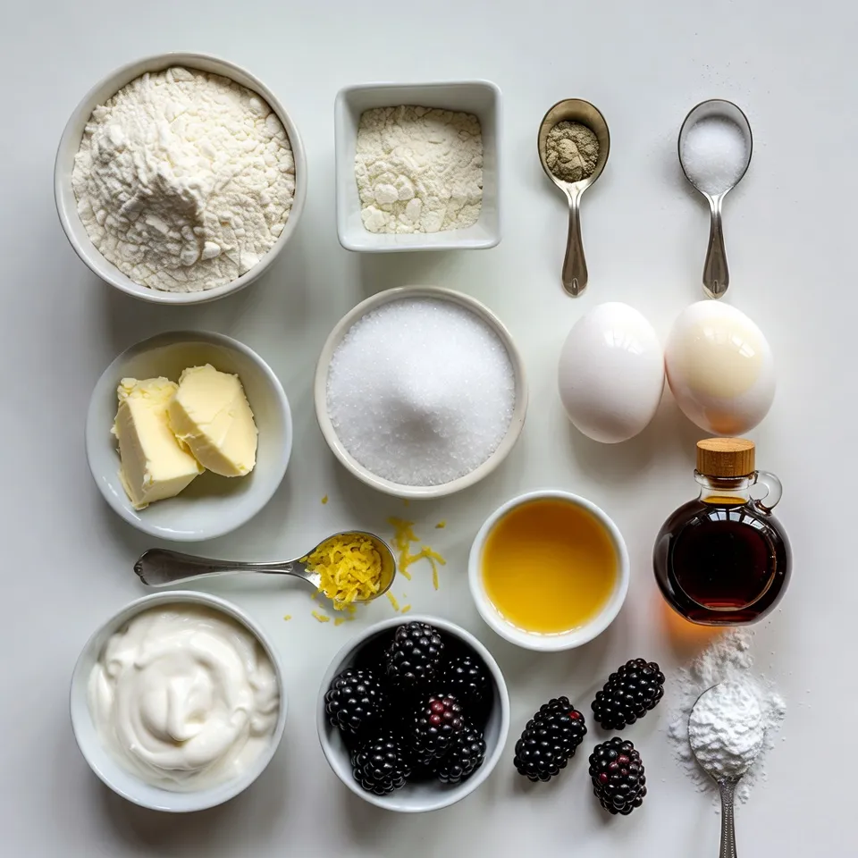 To make the best blackberry lemon coffee cake, start with these key ingredients. The all-purpose flour gives the cake structure. Baking powder and baking soda help it rise. Salt enhances the sweet flavors. Unsalted butter keeps the taste smooth and rich. Granulated sugar adds sweetness and moisture.