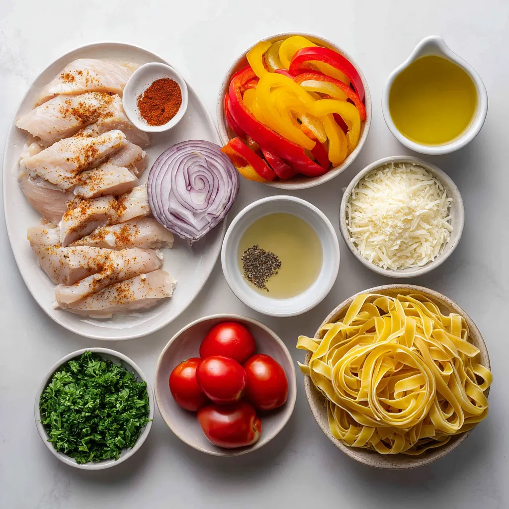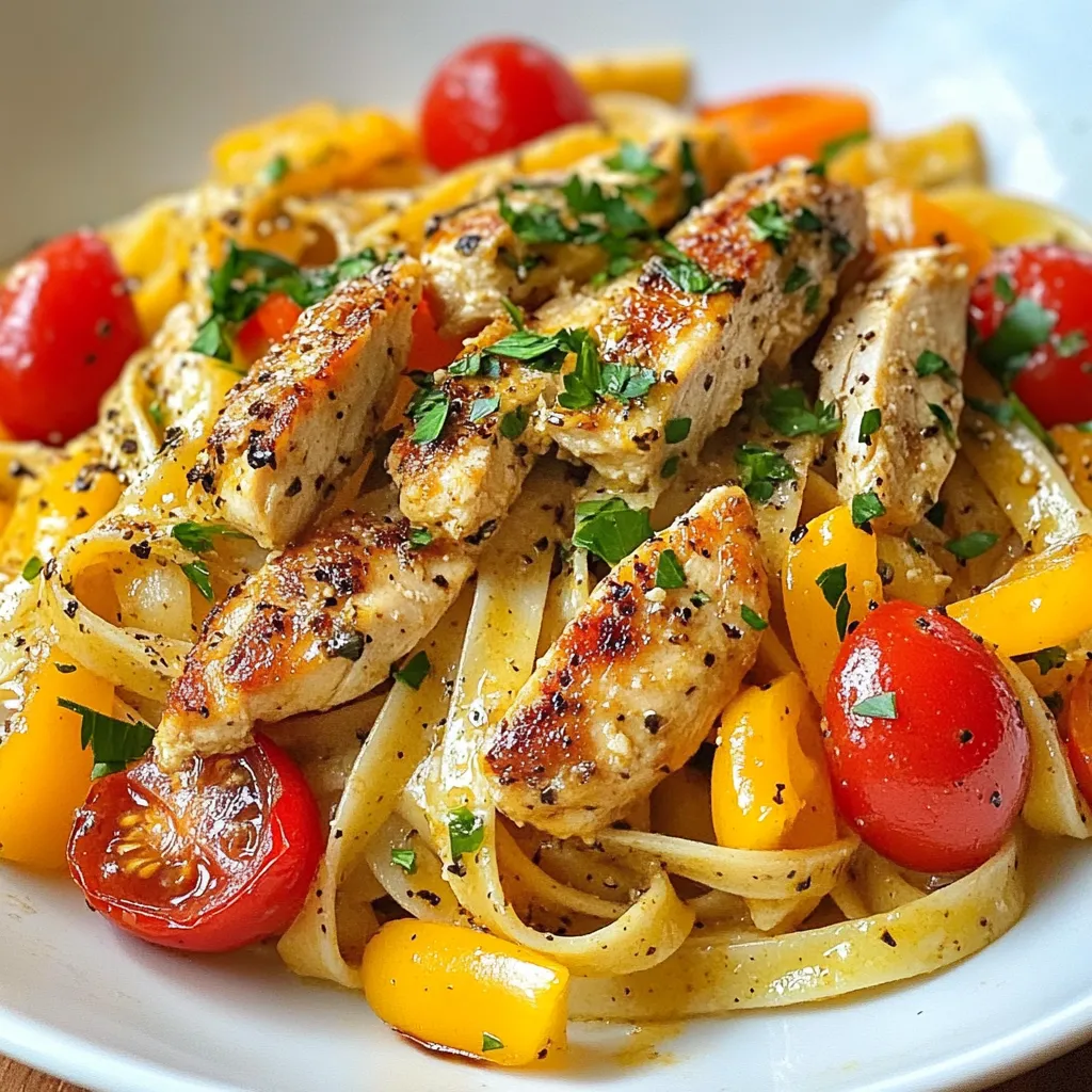 The bell pepper adds a nice crunch, and garlic brings a warm, rich flavor. Heavy cream and chicken broth create a creamy sauce that ties everything together. The cherry tomatoes add a fresh burst of sweetness. Lastly, sprinkle fresh parsley and Parmesan cheese for a beautiful finish.