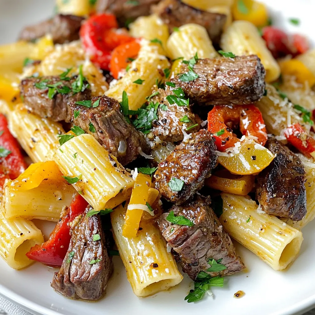 - Add the seared steak tips back into the skillet, followed by the drained rigatoni pasta. Toss everything together gently, making sure that the pasta is evenly coated with the luscious sauce and the steak is well distributed throughout.
