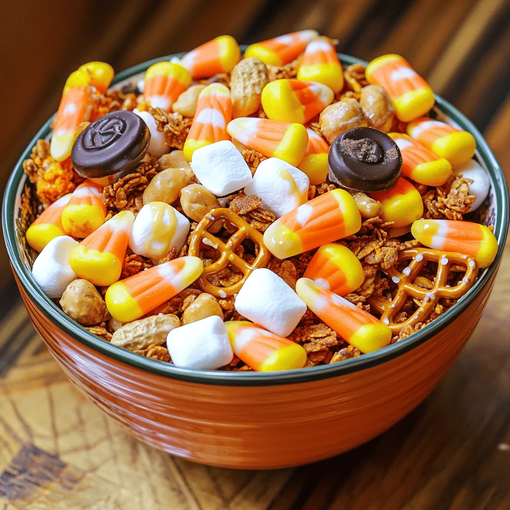 This mix brings together sweet, salty, and crunchy flavors. You need candy corn for that festive fall taste. Pretzel sticks add a nice crunch that balances the sweetness. Roasted peanuts give a nutty flavor that complements the other ingredients.