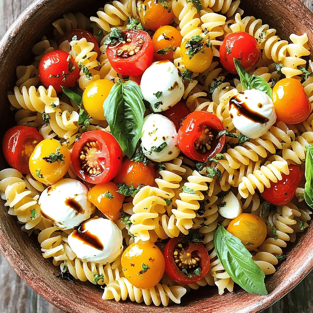 - 8 oz. fusilli pasta - 2 cups cherry tomatoes, halved - 1 cup fresh mozzarella balls (bocconcini) - 1 cup fresh basil leaves, torn into smaller pieces - 3 tablespoons extra-virgin olive oil - 1 tablespoon balsamic glaze (preferably thickened) - 2 cloves garlic, finely minced - 1 teaspoon dried oregano - Salt and freshly ground black pepper to taste For a great meal, this recipe serves four. Each serving is a filling portion. You can use a large bowl for mixing and a shallow dish for serving. A shallow dish shows off the colors well. Drizzle on extra balsamic glaze for a nice finish. Pair the salad with crusty bread for a complete meal. First, grab a large pot. Fill it with water and turn on the heat. Bring the water to a rolling boil. Once it boils, add a good amount of salt. This will help flavor the pasta. Now, drop in 8 ounces of fusilli pasta. Cook it for about 8 to 10 minutes. You want it al dente, which means tender but still firm. After cooking, drain the pasta in a colander. Rinse it under cold water to stop the cooking process. Next, find a large mixing bowl. In that bowl, combine the cooled fusilli pasta, 2 cups of halved cherry tomatoes, 1 cup of fresh mozzarella balls, and 1 cup of torn basil leaves. Use a spatula to mix these ingredients gently. You want to keep the mozzarella intact while mixing. Now, let’s make the dressing. In a separate small bowl, whisk together 3 tablespoons of extra-virgin olive oil, 1 tablespoon of balsamic glaze, 2 minced garlic cloves, and 1 teaspoon of dried oregano. Add a pinch of salt and pepper. Whisk until smooth. Drizzle this dressing over your pasta mixture. Gently fold everything together. Be sure each piece gets coated with the dressing. Once mixed, it’s time for a little patience. Cover the salad bowl with plastic wrap or a lid. Place it in the fridge for at least 30 minutes. This step lets the flavors blend together. When you’re ready to serve, take the salad out of the fridge. Give it a light toss to mix everything again. For a lovely finish, add a few fresh basil leaves on top for color and aroma. Enjoy your Caprese Pasta Salad Delight! For the full recipe, check out the ingredients and instructions! Cooking pasta al dente is key for a great texture. Al dente means the pasta is firm but not hard. This way, it holds up well in your salad. When cooking fusilli, boil it until tender but still slightly chewy. This will give your salad a nice bite. Mixing is another important step. You want to combine everything without breaking the fresh mozzarella. Use a spatula and be gentle. This keeps the cheese intact and adds a creamy texture. You can change the flavor by using different dressings. A lemon vinaigrette can add brightness, while a creamy pesto can bring richness. Each dressing creates a unique taste. If you want to try a homemade dressing, whisk together olive oil, vinegar, and herbs. This way, you control the flavor. Using seasonal vegetables can elevate your Caprese pasta salad. In summer, add colorful bell peppers for crunch. In fall, roasted squash adds warmth. Adapting your salad to the season keeps it fresh and exciting. You can also swap out the basil for other herbs. Try parsley or arugula for a fun twist. {{image_4}} You can easily boost the protein in your Caprese pasta salad. Grilled chicken adds a nice touch. Simply slice it thin and mix it in. Shrimp is another great option. Cook and toss it with the salad for a seafood twist. If you're looking for vegetarian protein, consider chickpeas or white beans. Both add protein and a lovely texture. Need a gluten-free option? Use gluten-free pasta made from rice or quinoa. These work well and taste great. For a dairy-free version, swap fresh mozzarella with avocado. This keeps the creaminess and adds healthy fats. You can also try vegan mozzarella, made from nuts or soy. You can serve Caprese pasta salad as a side dish or a main meal. It pairs well with grilled meats or fish. For a fun twist, serve it in small cups at gatherings. This gives guests a cute, easy way to enjoy the salad. To present it beautifully, use a large, shallow bowl. Drizzle some balsamic glaze on top for a pop of color. Adding fresh basil leaves on top makes it look even more inviting. Check out the full recipe to try these ideas! To keep your Caprese pasta salad fresh, cool it to room temperature first. Do not let it sit out for more than two hours. Next, place it in an airtight container. Glass containers work well because they do not absorb odors. You can also use plastic containers, but make sure they seal tightly. Label the container with the date before putting it in the fridge. When it comes to reheating, I recommend serving it chilled. The flavors really shine when it's fresh. If you prefer it warm, add a little olive oil to a pan. Heat it gently on low, stirring often to avoid sticking. Be careful not to overcook the salad, as this can change its texture. Caprese pasta salad usually lasts about three to four days in the fridge. Always check for spoilage before eating. Signs include a sour smell, discoloration, or mushy tomatoes. If you notice any of these, it's best to throw it out. Enjoy your salad at its freshest! You can find the full recipe earlier in the article to make more whenever you like. Caprese pasta salad is a fresh, vibrant dish. It combines pasta, tomatoes, mozzarella, and basil. The flavors are bright and balanced. The cherry tomatoes add sweetness, while mozzarella brings creaminess. The fresh basil adds a fragrant touch. Extra-virgin olive oil and balsamic glaze enhance the taste. The dish is quick to prepare and filled with color. You can serve it warm or cold, making it versatile. Yes, you can make Caprese pasta salad ahead of time. Prepare the salad and let it chill in the fridge. This allows the flavors to blend well. Aim to make it at least 30 minutes before serving. You can even make it the day before. Just remember to toss it lightly right before serving. This keeps ever