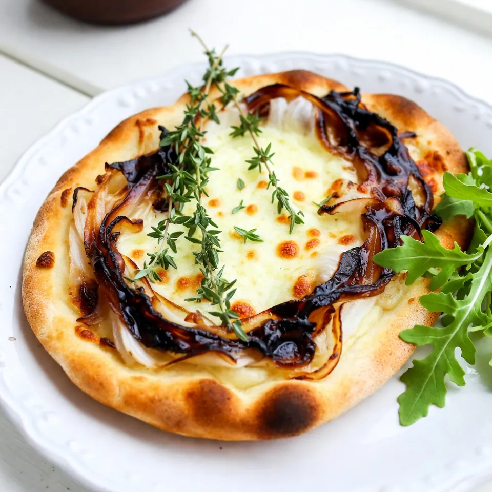 Each ingredient plays a role in making this dish special. The flatbread serves as a sturdy base, while the onions bring sweetness and depth. Olive oil helps caramelize the onions, enhancing their flavor. Balsamic vinegar adds a tangy kick, balancing the sweetness. Gruyère cheese melts beautifully, providing a rich, creamy texture. Fresh thyme adds a lovely aroma. Finally, the optional toppings brighten the dish and add visual appeal.