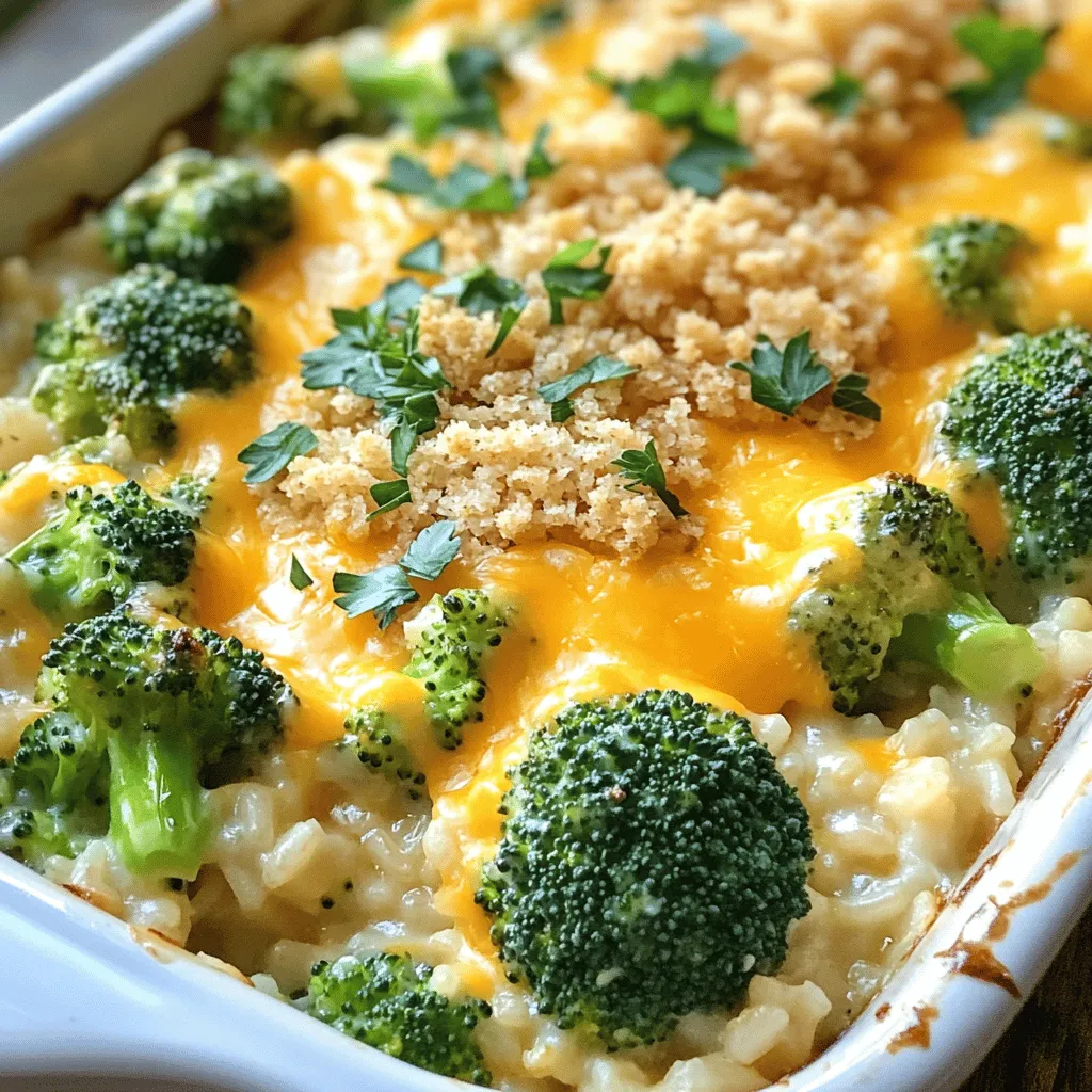 ![- 2 cups cooked white or brown rice - 2 cups fresh broccoli florets, steamed until tender - 1 cup sharp cheddar cheese, shredded - 1 cup cream of mushroom soup - 1 cup milk - 1 teaspoon garlic powder - 1 teaspoon onion powder - Salt and freshly ground black pepper to taste - 1/2 cup breadcrumbs (for a crispy topping) - 2 tablespoons olive oil - Preheat oven to 350°F (175°C) - Combine rice and broccoli in a mixing bowl - Add soup, milk, spices, and cheese; mix thoroughly - Transfer to a greased baking dish and top with breadcrumbs and cheese - Cover with foil; bake for 25 minutes - Remove foil; bake for an additional 15-20 minutes Making Cheesy Broccoli Rice Casserole is simple and fun. You start with the main ingredients, mixing cooked rice with steamed broccoli. This gives you a great base. The cheddar cheese adds a rich, creamy taste. The cream of mushroom soup and milk make the mix smooth. Next, we add some seasoning. Garlic powder and onion powder give the dish a nice flavor. Salt and pepper allow you to adjust the taste just how you like it. For a crunchy topping, breadcrumbs mixed with olive oil work great. Once you have everything mixed, pour it into a greased baking dish. This keeps it from sticking. Spread it out evenly. Then comes the fun part—topping it with more cheese and breadcrumbs! Now, cover the dish with foil. This keeps the moisture in while it cooks. Bake it for 25 minutes, then remove the foil. Bake for another 15-20 minutes until the cheese is melted and the top is golden. You can find the complete recipe [Full Recipe] for more detailed steps if needed. Enjoy this tasty, warm casserole. It’s perfect for dinner or as a side dish! To boost the taste of your Cheesy Broccoli Rice Casserole, I recommend using homemade cream of mushroom soup. It adds freshness and depth that store-bought versions can't match. You can easily make it by sautéing mushrooms with butter and mixing in some cream. Another fun tip is to experiment with different cheeses. Try gouda or pepper jack for a unique twist. Each cheese brings its own flavor, making each bite exciting. To make your casserole look beautiful, garnish it with fresh parsley or chives. The green color brightens the dish and gives it a fresh taste. For an extra touch of flavor, drizzle some balsamic glaze over the top just before serving. This adds a sweet and tangy contrast that pairs well with cheesy goodness. Make sure your broccoli is steamed evenly. This ensures every piece is tender and not overcooked. If some pieces are hard, they won't blend well with the rice. After baking, let the casserole rest for about five minutes. This simple step helps it set and makes slicing easier. You will have perfect portions for serving! You can easily switch the main veggies in this dish. Swap broccoli for cauliflower or spinach. Both options taste great and add different flavors. You can also try brown rice or quinoa instead of white rice. This makes the meal healthier and adds more fiber. If you need a gluten-free option, use gluten-free breadcrumbs. This keeps the crispy topping but makes it safe for gluten-sensitive folks. For a vegan version, substitute cheese and milk with plant-based choices. Almond milk and vegan cheese work well here. Want to add more taste? Cooked chicken or turkey is a great protein boost. This makes the meal heartier. You can also sprinkle in spices like paprika or cayenne for some heat. These little changes make a big difference in flavor. {{image_4}} After enjoying your cheesy broccoli rice casserole, store any leftovers in an airtight container. This keeps the flavors fresh for up to 4 days. I recommend letting it cool down before sealing. This way, it won’t steam and get soggy. You can freeze the casserole before baking it. This method lets you enjoy it later without losing taste. Just wrap it well in plastic wrap or foil and store it in the freezer for up to 3 months. When you are ready to bake, thaw it in the fridge overnight. Adjust the baking time since it will be cold. To reheat, the oven is your best bet. It helps keep the texture nice and creamy. Just cover it with foil and heat at 350°F (175°C) until warmed through. You can also use the microwave for a quicker option. It’s great for busy days when you want a tasty meal fast. Yes, you can prepare the casserole and refrigerate or freeze it before baking. This makes it easy to have a warm meal ready when you need it. Just remember to let it thaw before baking if frozen. You can use homemade cream soup or a different canned soup option, like cream of chicken or celery. This gives you flexibility based on what you have at home. To lighten it up, use reduced-fat cheese. You can also substitute whole milk with low-fat or unsweetened almond milk. These changes still keep the dish creamy and tasty. Absolutely! It stores well and can be portioned for easy meal prepping. Just make sure to use airtight containers for freshness. Enjoy it throughout the week! - 2 cups cooked white or brown rice - 2 cups fresh broccoli florets, steamed until tender - 1 cup sharp cheddar cheese, shredded - 1 cup cream of mushroom soup (store-bought or homemade) - 1 cup milk - 1 teaspoon garlic powder - 1 teaspoon onion powder - Salt and freshly ground black pepper to taste - 1/2 cup breadcrumbs (for a crispy topping) - 2 tablespoons olive oil 1. Preheat your oven to 350°F (175°C). 2. Mix the cooked rice and steamed broccoli in a large bowl. 3. Add cream of mushroom soup, milk, garlic powder, onion powder, and half the cheese. Season with salt and pepper. Stir well. 4. Grease a 9x13 inch baking dish with olive oil. Transfer the mixture into the dish and spread evenly. 5. In a small bowl, mix breadcrumbs with olive oil. Sprinkle over the casserole. 6. Add the remaining cheese on top of the breadcrumbs. 7. Cover the dish with aluminum foil, shiny side down. Bake for 25 minutes. 8. Remove the foil and bake for another 15-20 minutes. Watch for bubbling cheese and golde