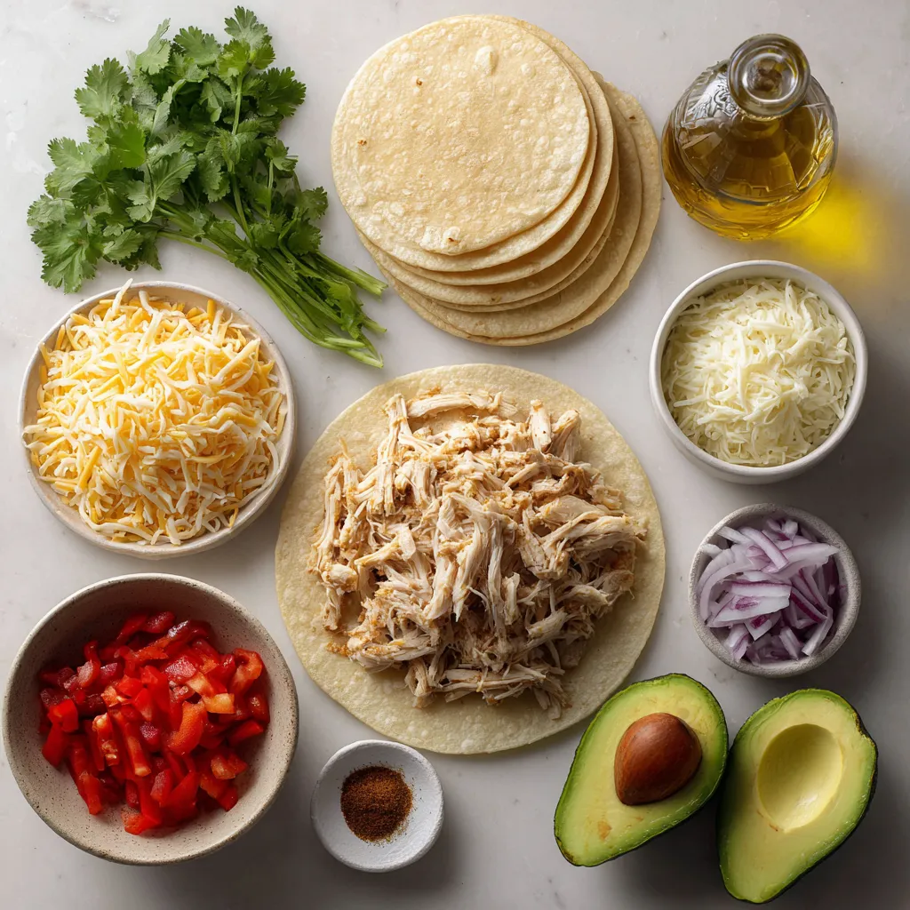 Start by gathering all your ingredients. This will make cooking smooth and fun. You will need cooked chicken, cheese, enchilada sauce, tortillas, red bell pepper, onion, olive oil, spices, and garnishes. Preheat your oven to 375°F (190°C). This ensures it’s ready for baking.