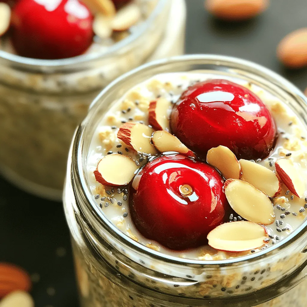 Serving your oats in jars makes them look appealing. Clear jars show off the beautiful layers of cherries and almonds. For a fun touch, add a mint leaf on top. This adds color and freshness. Plus, jars make it easy to grab and go in the morning. Enjoy your tasty treat!