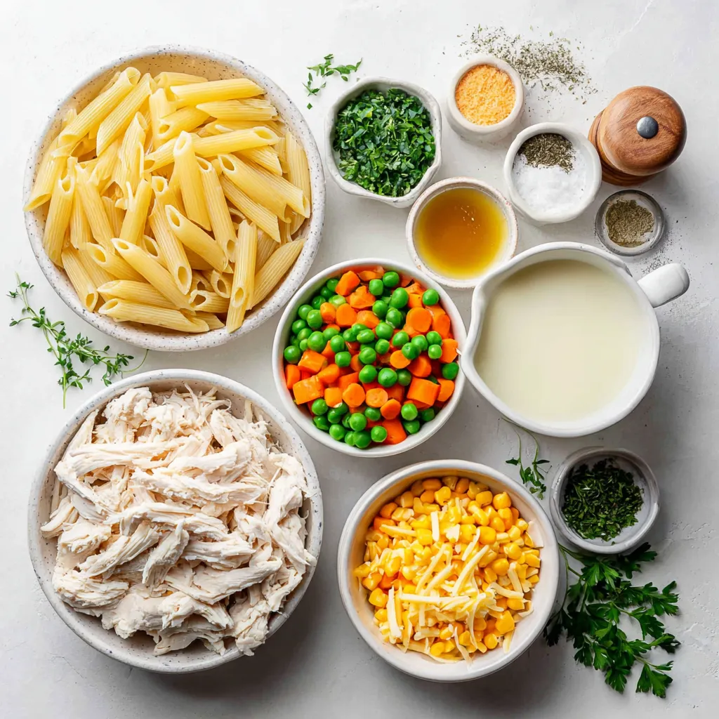 Each ingredient plays a key role. The pasta gives a hearty base. The chicken adds protein and flavor. Mixed veggies bring color and nutrients. Chicken broth and cream make the dish creamy and rich. The spices enhance taste with warm notes. Finally, cheese adds a delicious finish.