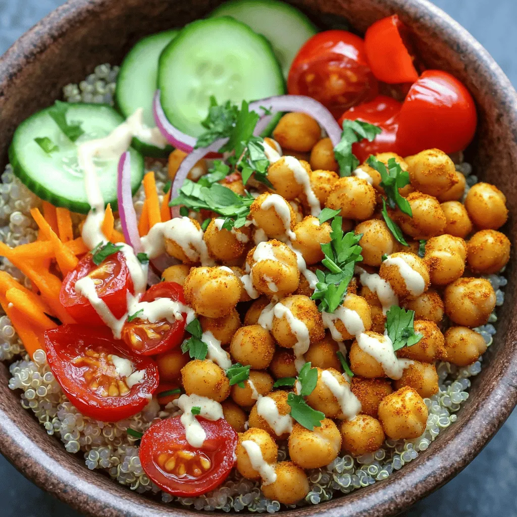 Presentation makes a big difference. Use colorful bowls to make your meal pop. Layer the ingredients neatly for a beautiful display. Start with the quinoa or rice at the base. Add the chickpeas on top, then the veggies. Finish with the tahini drizzle. A sprinkle of fresh herbs adds a nice touch. You can also add lemon wedges for extra brightness. Serve your bowls warm for the best flavor. If you want a crunch, sprinkle some nuts or seeds on top.