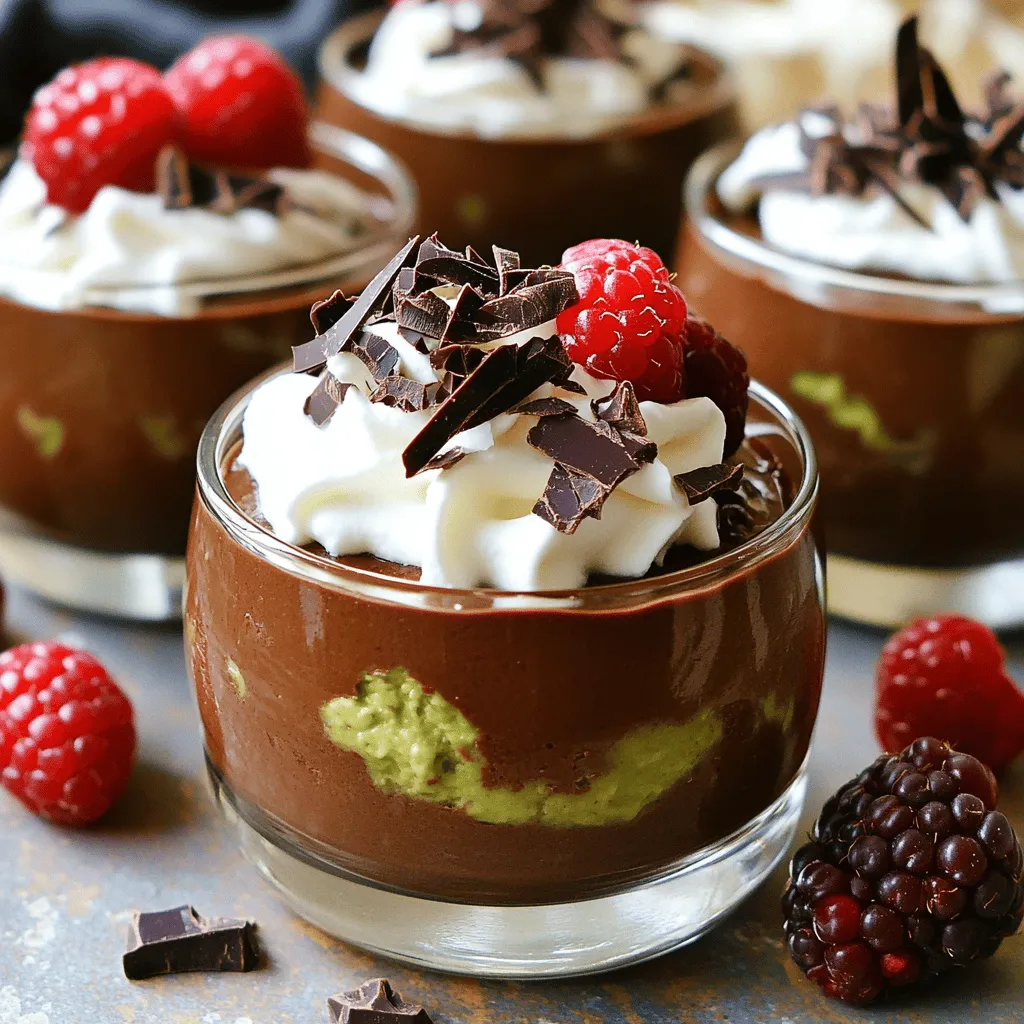 After blending, taste the mousse for sweetness. If you want it sweeter, add a bit more maple syrup and blend again. Once it’s perfect, fill small serving dishes with the chocolate avocado mixture. Cover them and chill in the fridge for at least 30 minutes. This helps the flavors blend and firms up the mousse. For serving, add your favorite toppings. You can use whipped coconut cream, dark chocolate shavings, fresh berries, or chopped nuts. These add great flavor and texture.