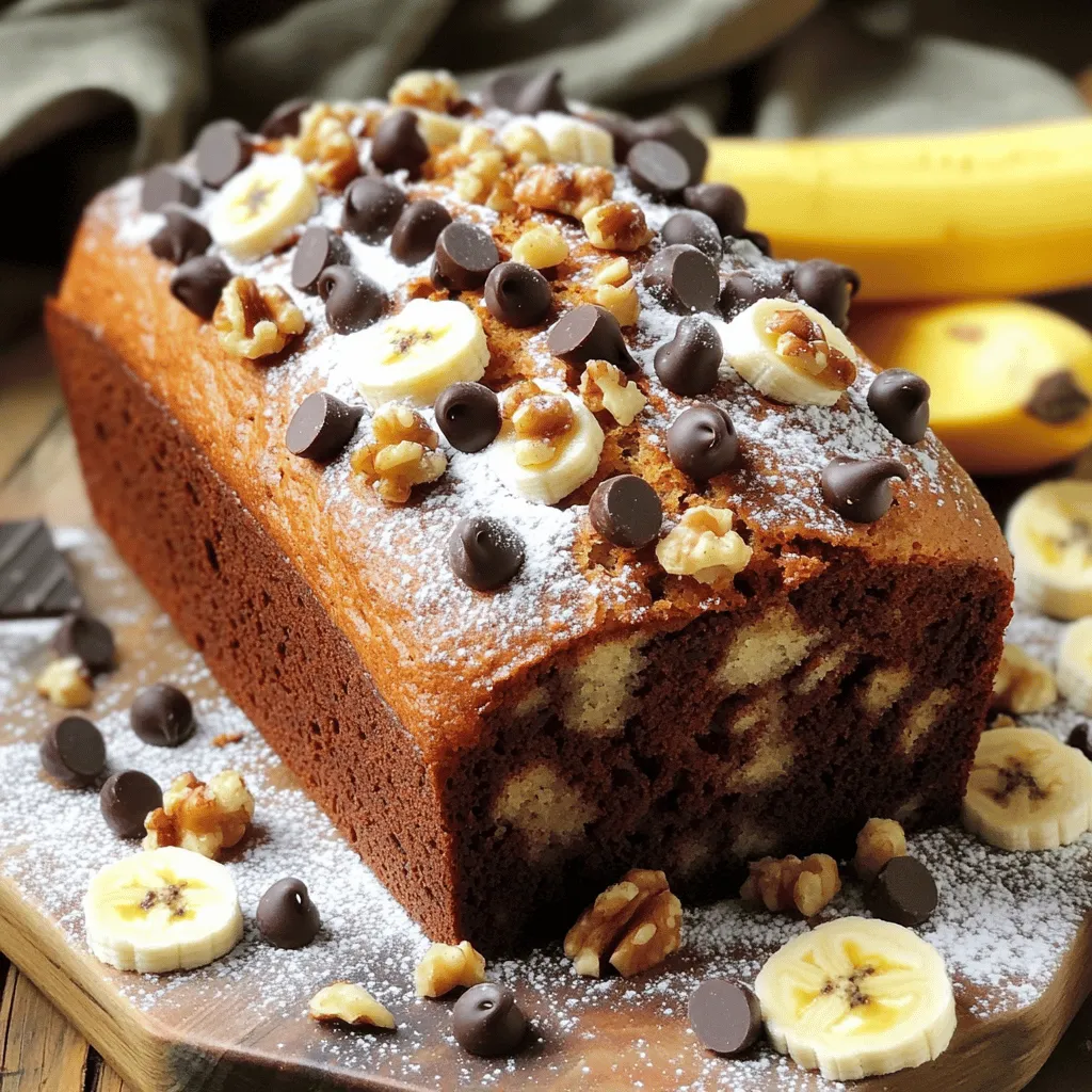 To make the best chocolate chip banana bread, you need these simple ingredients: - 3 ripe bananas, thoroughly mashed - 1/3 cup coconut oil, melted and slightly cooled - 1 teaspoon pure vanilla extract - 1 teaspoon baking soda - A pinch of fine salt - 1/2 cup brown sugar, packed tightly - 1 large egg, beaten - 1 cup all-purpose flour - 1/2 cup semi-sweet chocolate chips - 1/4 cup walnuts, chopped (optional) Using ripe bananas is key. They add natural sweetness and moisture. Coconut oil keeps the bread moist and gives it a lovely flavor. The vanilla extract enhances all the tastes. Baking soda helps the bread rise, while the salt balances the sweetness. Brown sugar adds richness. The egg binds everything together. All-purpose flour gives the bread its structure. Chocolate chips add delicious bursts of chocolate in every bite. If you like nuts, walnuts add a nice crunch and flavor. You can find the full recipe for the chocolate chip banana bread in the next sections. First, set your oven to 350°F (175°C). Grab a 9x5-inch loaf pan. You can grease it with oil or line it with parchment paper. I recommend parchment paper. It helps the bread come out easily. In a large bowl, mash three ripe bananas. Then, add 1/3 cup of melted coconut oil. Mix them well until smooth. Next, add 1 teaspoon of pure vanilla extract. This adds great flavor! Stir everything together until blended. Now it's time for the dry stuff. Add 1 teaspoon of baking soda, a pinch of fine salt, and 1/2 cup of packed brown sugar. Mix these in well. Then, pour in 1 beaten large egg. Stir until it’s all mixed. Next, gently fold in 1 cup of all-purpose flour. Do this until the flour is just mixed in. Be careful not to over-mix. This keeps your bread light and fluffy. Finally, add 1/2 cup of semi-sweet chocolate chips. If you like, toss in 1/4 cup of chopped walnuts for some crunch. Fold them in gently. Now, pour the batter into your prepared loaf pan. Use a spatula to smooth the top. Your batter is ready! To make your chocolate chip banana bread moist, start with ripe bananas. Ripe bananas have more natural sugars and flavors. Look for bananas with brown spots. They blend well and add sweetness. Using coconut oil is another great way to keep your bread moist. It adds a rich flavor and keeps the bread soft. Melt the coconut oil and let it cool slightly before mixing. This helps blend it smoothly with the bananas. The way you mix the batter can affect your bread’s texture. Mix the wet ingredients first until smooth. Then add the dry ingredients. Stir gently when adding flour. Over-mixing can make your bread tough and dense. To check for doneness, insert a toothpick into the center. If it comes out clean, your bread is ready. If it has batter on it, bake for a few more minutes. For an extra flavor boost, consider adding spices like cinnamon or nutmeg. These spices pair well with bananas and chocolate. You can also try adding more chocolate chips or nuts. When serving, presentation matters too. Dust the top with powdered sugar for a sweet touch. Slice the bread and arrange it on a wooden board. Add fresh banana slices and extra chocolate chips for a lovely display. For the full recipe, check out the Choco-Banana Bliss Bread. {{image_4}} To make your chocolate chip banana bread nut-free, simply leave out the walnuts. Instead, you can add seeds for a crunch. Flaxseeds or sunflower seeds work great. They add texture without nuts. You can also add extra chocolate chips for more sweetness and richness. Want to change up the flavor? You can add different types of chocolate. White chocolate or dark chocolate chips will give a unique twist. You can also mix in fruits like blueberries or strawberries. These fruits add freshness and a burst of flavor. Just make sure to adjust the sugar if you add sweet fruits. If you need a gluten-free version, swap the all-purpose flour with gluten-free flour. Many brands offer blends that work well in baking. You can also try almond flour for a nutty taste. Just remember to check your baking time. Gluten-free bread may bake faster or slower. Keep an eye on it! For more details and the full recipe, check out the Choco-Banana Bliss Bread recipe above. Enjoy experimenting with these variations! To keep your chocolate chip banana bread fresh, wrap it tightly in plastic wrap or aluminum foil. This helps to keep moisture in and air out. You can also place it in an airtight container. Store it at room temperature for best results. Avoid putting it in direct sunlight or near heat. If you want to freeze your banana bread, let it cool completely first. Then, wrap it tightly in plastic wrap, ensuring no air gets in. After that, place the wrapped bread in a freezer bag. Make sure to label the bag with the date. To defrost, simply take it out of the freezer and leave it at room temperature for a few hours or overnight. When stored at room temperature, chocolate chip banana bread lasts about 3 to 4 days. If you keep it in the refrigerator, it can stay fresh for about a week. However, refrigeration might change the texture slightly. For the best flavor and moisture, enjoy it within the first few days. For longer storage, freezing is the best option. Yes, you can use frozen bananas in this recipe. First, thaw them completely. Then, mash them up like fresh bananas. The moisture from thawed bananas helps keep the bread moist. Just remember to drain any excess juice before adding them to your mix. If you don't have coconut oil, there are many options. You can use: - Unsalted butter - Vegetable oil - Applesauce (for a healthier twist) - Avocado oil These substitutes will keep your bread moist and tasty, just like coconut oil. Dense banana bread can happen for a few reasons. Here are some common ones: - Over-mixing the batter can lead to density. Mix until just combined. - Using too much flour can weigh it down. Measure carefully. - Not enough ripe bananas can affect the texture. Use fully ripe bananas for the best results. By 