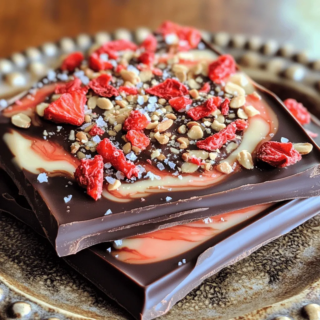 ![- 1 cup dark chocolate chips - 1 cup white chocolate chips - 1 cup freeze-dried strawberries, crushed - 1/2 cup roasted almonds, roughly chopped (optional) - Sea salt, for a finishing sprinkle To make chocolate covered strawberry bark, you need simple ingredients. Dark chocolate chips form the base, giving a rich taste. White chocolate chips add sweetness and a lovely contrast. Freeze-dried strawberries provide a fruity crunch. If you like, you can add roasted almonds for a nutty flavor. A sprinkle of sea salt at the end really enhances everything. - For chocolate alternatives, you can use milk chocolate or vegan chocolate. - Other nuts and toppings can include walnuts, pecans, or coconut flakes. If you want to switch things up, feel free to use different chocolates. Milk chocolate offers a sweeter note, while vegan chocolate works for plant-based diets. You can also play with toppings. Try different nuts or even dried fruits like apricots or raisins. These changes keep the bark fun and exciting. 1. Lining the baking sheet Start by lining a baking sheet with parchment paper. This paper helps the bark come off easily later. Without it, the chocolate might stick. 2. Melting the dark chocolate Next, take a microwave-safe bowl and add one cup of dark chocolate chips. Microwave the chips in 30-second bursts. Stir well after each round. Keep going until the chocolate is fully melted and smooth. Be careful; you don’t want to overheat the chocolate. 3. Spreading the dark chocolate Once your dark chocolate is melted, pour it onto the lined baking sheet. Use a spatula to spread it into an even layer. Make it as thick or thin as you like. A consistent layer looks great. 4. Melting and drizzling white chocolate In another bowl, melt one cup of white chocolate chips the same way. Use the microwave in 30-second increments until it’s silky smooth. Drizzle the melted white chocolate over the dark chocolate. To create a pretty marbled effect, take a toothpick or spatula and swirl the two chocolates together. 5. Adding toppings and sea salt Now, sprinkle the crushed freeze-dried strawberries on top. If you want, add chopped roasted almonds for crunch. Finally, lightly sprinkle sea salt over everything. This adds a nice balance to the sweetness. 6. Chilling the bark Carefully place the baking sheet in the refrigerator. Chill for about 30 minutes, or until the chocolate is firm. Once set, break the bark into pieces with your hands or a knife. This gives it a rustic look. For the [Full Recipe], check the earlier section. Enjoy your chocolate-covered strawberry bark! To melt chocolate correctly, avoid overheating it. Heat can turn chocolate into a grainy mess. Use short bursts in the microwave, about 30 seconds at a time. Stir well after each interval. If you notice the chocolate starting to seize, stop heating immediately. You can also use a double boiler as an alternative. Fill a pot with a bit of water and place a heat-safe bowl on top. This method helps keep the chocolate at a steady temperature. Stir gently as it melts for a silky smooth finish. For the best texture, aim for a thickness of about 1/4 inch when spreading the chocolate. This thickness will give your bark a nice bite. If you prefer thicker pieces, adjust accordingly. If you have leftover melted chocolate, store it in a sealed container. Keep it in the fridge for up to a week. When you want to use it again, gently reheat it in the microwave. To make your Chocolate Covered Strawberry Bark look stunning, use a decorative platter for serving. Arrange some whole strawberries next to the bark for a pop of color. You can also sprinkle some colorful garnish on top. Consider using edible flowers or nuts for added texture. These small touches make a big difference in presentation. For more creative ideas, check out the Full Recipe for inspiration. {{image_4}} You can easily change the taste of your chocolate bark. Adding flavors like peppermint or orange can make it special. Just mix in a few drops of peppermint extract or some orange zest with your melted chocolate. This twist can really freshen up the bark. You can also add dried fruits. Dried cherries, blueberries, or even mango give great flavor. These fruits add a sweet and chewy bite. Just sprinkle them on top along with the strawberries. If you need gluten-free options, worry not! Both dark and white chocolate can be gluten-free. Just check the labels to be sure. You can also skip the nuts if you have allergies. This bark stays delicious and fun to eat without them. For vegan adaptations, swap the chocolate for vegan chocolate. There are many brands that make dairy-free chocolate. This way, everyone can enjoy this treat! You can create themed bark for holidays, too. For Christmas, add crushed candy canes on top for a festive touch. For Valentine's Day, use pink or red sprinkles along with the strawberries. This can make your bark look lovely and cheerful for any celebration. Check out the Full Recipe for more details on making this delightful treat! To keep your chocolate covered strawberry bark fresh, use airtight containers. This keeps moisture out and prevents the bark from getting soft. The ideal temperature for storage is cool, around 60-70°F. Avoid placing the bark in warm areas, as heat can melt the chocolate. For best taste, enjoy your chocolate covered strawberry bark within two weeks. After that, the quality may decrease. Look for signs of spoilage like a white film or off smell. If you spot these, it’s best to throw it away. Always check for freshness before enjoying this treat. Enjoy your chocolate covered strawberry bark while it’s at its best! How do I make Chocolate Covered Strawberry Bark? Making Chocolate Covered Strawberry Bark is simple! First, gather your ingredients: - 1 cup dark chocolate chips - 1 cup white chocolate chips - 1 cup freeze-dried strawberries, crushed - 1/2 cup roasted almonds, roughly chopped (optional) - Sea salt, for a finishing sprinkle Follow