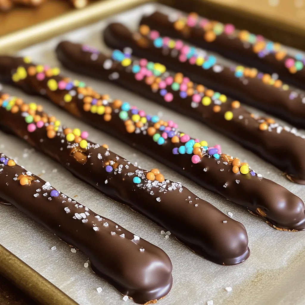 Place each dipped pretzel rod on the lined baking sheet. If you like, sprinkle a bit of sea salt on top. This adds a nice sweet and salty taste. Once all the rods are dipped, pop the baking sheet into the fridge. Let them chill for about 30 minutes. This helps the chocolate harden fully. When they are done, you can enjoy or gift them to someone special.