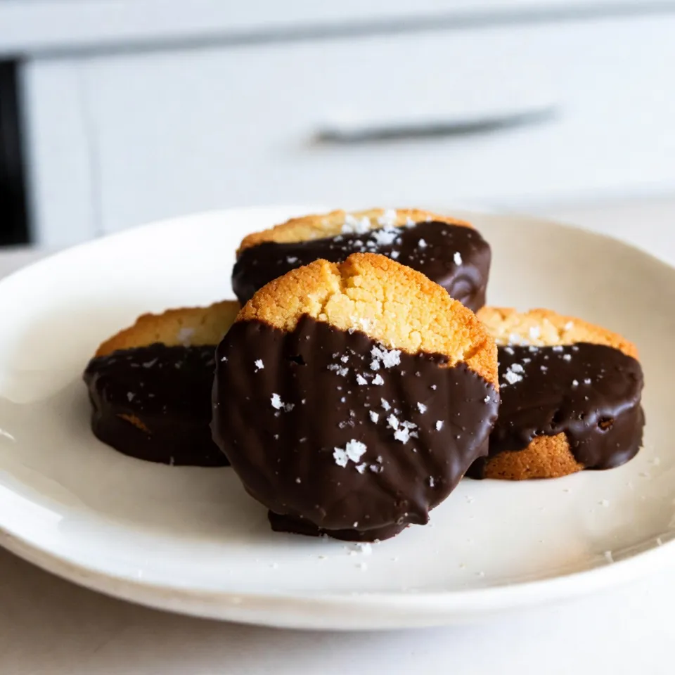 Once the cookies have cooled, dip each one halfway into the melted chocolate. Shake off any excess chocolate gently. Place the coated cookies back on the parchment paper. While the chocolate is still warm, sprinkle a few sea salt flakes on top. This adds a nice sweet-and-salty flavor. Let the chocolate set completely. You can leave them at room temperature or chill in the fridge for about 15 minutes.