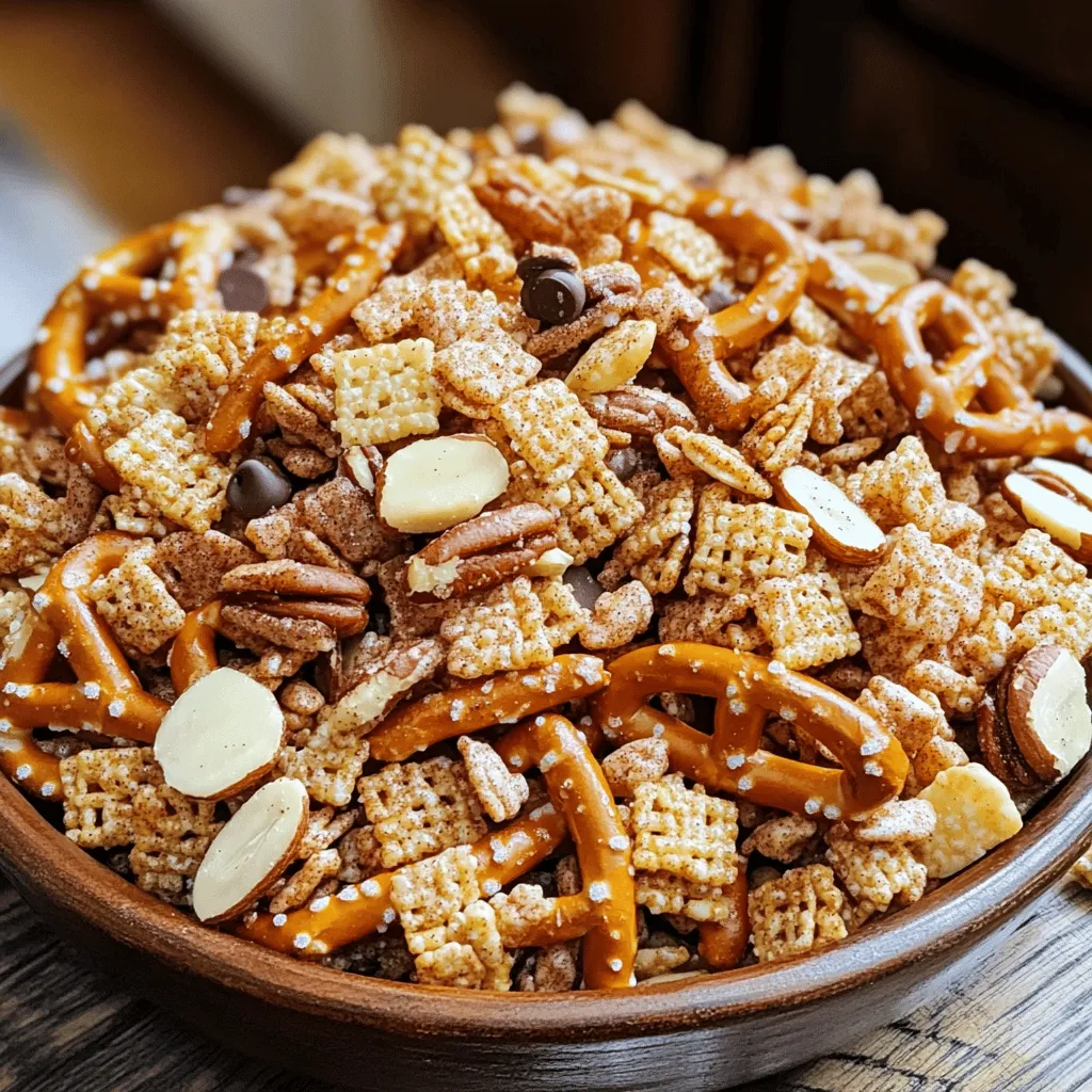 Start by gathering all your ingredients. You will need mini pretzels, rice cereal squares, cinnamon cereal, pecans, and sliced almonds. Measure each one carefully. This helps ensure the right balance of flavors. Preheat your oven to 350°F (175°C). This makes sure everything bakes evenly.