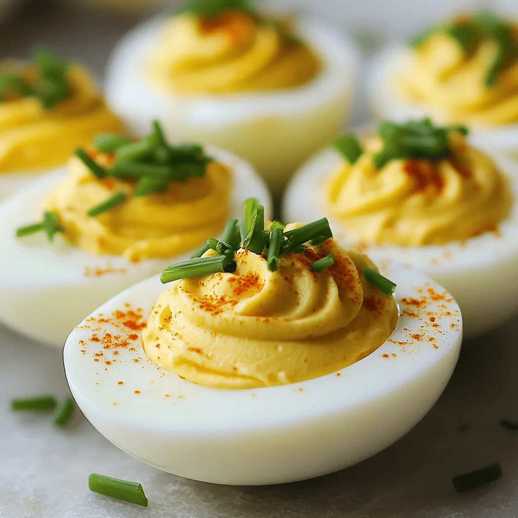 ![- 6 large eggs - 3 tablespoons mayonnaise - 1 teaspoon Dijon mustard - 1 teaspoon apple cider vinegar Classic deviled eggs start with large eggs. The eggs should be fresh for the best taste. You can boil them easily on the stove. The yolks become the base of the filling. Mayonnaise adds creaminess and flavor. I love using Dijon mustard for a slight tang. Apple cider vinegar brings brightness to the mix. - Salt and freshly ground black pepper - 1/4 teaspoon smoked paprika, plus more for garnish - 1 tablespoon fresh chives, finely chopped - 1 tablespoon dill pickles, finely diced Seasoning is key to great deviled eggs. Use salt and freshly ground black pepper to taste. Smoked paprika gives a lovely color and adds a smoky flavor. Fresh chives add a touch of onion flavor and color. Diced dill pickles give a nice crunch and tang. Try to balance all these flavors for the best result. For the full recipe, check out the details above. - Boiling Method: Start with 6 large eggs. Place them in a medium pot and cover with cold water. Set the pot over medium-high heat and bring it to a rolling boil. - Resting Period: Once boiling, cover the pot and remove it from heat. Let the eggs sit in the hot water for 12 minutes. This method makes the yolks creamy. - Cooling Process: After 12 minutes, move the eggs to an ice water bowl. Let them cool for about 5 minutes. This stops cooking and helps with peeling. - Peeling Tips: Tap each egg on a flat surface. Roll it gently to crack the shell. Peel under running water to help remove stubborn bits. - Mixing Ingredients: Slice each peeled egg in half lengthwise. Place the yolks in a bowl and set the whites aside. - Achieving the Right Consistency: Use a fork to mash the yolks. Add 3 tablespoons of mayonnaise, 1 teaspoon of Dijon mustard, and 1 teaspoon of apple cider vinegar. Season with salt, pepper, and 1/4 teaspoon of smoked paprika. Stir well until creamy. - Filling the Egg Whites: Spoon or pipe the yolk mixture into the egg whites. For a fancy touch, use a piping bag with a star tip. - Garnishing Tips: Dust the tops with smoked paprika and sprinkle with chopped chives. This adds color and flavor. You can find the full recipe and more tips in the [Full Recipe]. Enjoy your delicious deviled eggs! To get the best texture, balance your ingredients for creaminess. Use enough mayonnaise. It adds richness. The Dijon mustard gives a nice zing. Apple cider vinegar adds acidity, which brightens up the flavor. If the mixture is too thick, just add a little more mayo. Adjusting seasoning is key. Start with salt and pepper. Taste as you mix. Everyone has different preferences. Make it just right for you. A little smoked paprika adds depth. Plating can elevate your deviled eggs. Use a decorative platter to catch the eye. You can also arrange them in a circle. This makes a beautiful display. Add fresh greens or microgreens for color. Using decorative garnishes makes them stand out. A sprinkle of smoked paprika gives a pop. You might also use chives or tiny pickles on top. These touches make each bite more fun. One common mistake is overcooking the eggs. This leads to a greenish ring around the yolk. Follow the cooking times closely. It’s key to get creamy yolks. Inadequate cooling can also ruin your eggs. After cooking, plunge them into ice water. This stops the cooking right away. It also helps make peeling easier. A good peel means a better final look. For the full recipe, refer to the section above. {{image_4}} Deviled eggs are a blank canvas. You can add many flavors to make them unique. Here are two fun ideas: - Spicy Deviled Eggs with Sriracha: Mix in a bit of Sriracha for heat. Start with a teaspoon and adjust to taste. This will give your eggs a nice kick. - Herb-Infused Variations: Add fresh herbs like basil or parsley. They bring a fresh taste to the creamy filling. Use about 1 tablespoon of finely chopped herbs. If you want to adapt the recipe, there are simple swaps: - Low-Fat Alternatives: You can use Greek yogurt instead of mayonnaise. This adds creaminess without the extra fat. It also adds a tangy flavor. - Vegan Versions: For a vegan option, try using mashed avocado. It gives a rich taste and color. You can also use vegan mayo for a similar creamy texture. Different regions have their tasty takes on deviled eggs: - Deviled Eggs with Bacon: Add crispy bacon bits for a smoky flavor. This twist is popular in many Southern kitchens. Just mix in about 2 tablespoons of cooked bacon. - Mediterranean Deviled Eggs: Try adding feta cheese and olives. This gives a salty and savory taste. Use about 1/4 cup of crumbled feta for a creamy bite. Feel free to experiment with these ideas. You can make your classic deviled eggs special and fun. For the main recipe, check out the Full Recipe. To keep your deviled eggs fresh, place them in an airtight container. Use a layer of plastic wrap or foil to cover them. This helps to lock in moisture and flavor. Store them in the fridge right away. - Refrigeration Tips: Keep deviled eggs in the coldest part of the fridge. Avoid the door, as it has fluctuating temperatures. - How Long They Last: Leftover deviled eggs stay good for about 2 to 3 days. If you notice any changes in smell or texture, it's best to toss them. You may wonder if you can freeze deviled eggs. The answer is, it’s not the best idea. Freezing can change the texture of both the egg whites and the filling. - Can You Freeze Them?: If you must freeze them, separate the filling from the whites. This keeps the texture better. - Best Practices for Freezing: Place the filling in a freezer-safe bag. Store the egg whites in a separate container. Use them within a month for the best taste. When you want to enjoy your deviled egg leftovers, keep it simple. You can reheat them gently. - Ideal Methods for Enjoying Leftovers: The best way is to let them sit at room temperature for about 15 minutes. This brings back some of their original flavor. You can also use a microwave 