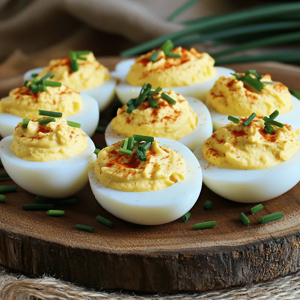 ![- 6 large eggs - 3 tablespoons mayonnaise - 1 teaspoon Dijon mustard - 1 teaspoon apple cider vinegar Classic deviled eggs start with large eggs. The eggs should be fresh for the best taste. You can boil them easily on the stove. The yolks become the base of the filling. Mayonnaise adds creaminess and flavor. I love using Dijon mustard for a slight tang. Apple cider vinegar brings brightness to the mix. - Salt and freshly ground black pepper - 1/4 teaspoon smoked paprika, plus more for garnish - 1 tablespoon fresh chives, finely chopped - 1 tablespoon dill pickles, finely diced Seasoning is key to great deviled eggs. Use salt and freshly ground black pepper to taste. Smoked paprika gives a lovely color and adds a smoky flavor. Fresh chives add a touch of onion flavor and color. Diced dill pickles give a nice crunch and tang. Try to balance all these flavors for the best result. For the full recipe, check out the details above. - Boiling Method: Start with 6 large eggs. Place them in a medium pot and cover with cold water. Set the pot over medium-high heat and bring it to a rolling boil. - Resting Period: Once boiling, cover the pot and remove it from heat. Let the eggs sit in the hot water for 12 minutes. This method makes the yolks creamy. - Cooling Process: After 12 minutes, move the eggs to an ice water bowl. Let them cool for about 5 minutes. This stops cooking and helps with peeling. - Peeling Tips: Tap each egg on a flat surface. Roll it gently to crack the shell. Peel under running water to help remove stubborn bits. - Mixing Ingredients: Slice each peeled egg in half lengthwise. Place the yolks in a bowl and set the whites aside. - Achieving the Right Consistency: Use a fork to mash the yolks. Add 3 tablespoons of mayonnaise, 1 teaspoon of Dijon mustard, and 1 teaspoon of apple cider vinegar. Season with salt, pepper, and 1/4 teaspoon of smoked paprika. Stir well until creamy. - Filling the Egg Whites: Spoon or pipe the yolk mixture into the egg whites. For a fancy touch, use a piping bag with a star tip. - Garnishing Tips: Dust the tops with smoked paprika and sprinkle with chopped chives. This adds color and flavor. You can find the full recipe and more tips in the [Full Recipe]. Enjoy your delicious deviled eggs! To get the best texture, balance your ingredients for creaminess. Use enough mayonnaise. It adds richness. The Dijon mustard gives a nice zing. Apple cider vinegar adds acidity, which brightens up the flavor. If the mixture is too thick, just add a little more mayo. Adjusting seasoning is key. Start with salt and pepper. Taste as you mix. Everyone has different preferences. Make it just right for you. A little smoked paprika adds depth. Plating can elevate your deviled eggs. Use a decorative platter to catch the eye. You can also arrange them in a circle. This makes a beautiful display. Add fresh greens or microgreens for color. Using decorative garnishes makes them stand out. A sprinkle of smoked paprika gives a pop. You might also use chives or tiny pickles on top. These touches make each bite more fun. One common mistake is overcooking the eggs. This leads to a greenish ring around the yolk. Follow the cooking times closely. It’s key to get creamy yolks. Inadequate cooling can also ruin your eggs. After cooking, plunge them into ice water. This stops the cooking right away. It also helps make peeling easier. A good peel means a better final look. For the full recipe, refer to the section above. {{image_4}} Deviled eggs are a blank canvas. You can add many flavors to make them unique. Here are two fun ideas: - Spicy Deviled Eggs with Sriracha: Mix in a bit of Sriracha for heat. Start with a teaspoon and adjust to taste. This will give your eggs a nice kick. - Herb-Infused Variations: Add fresh herbs like basil or parsley. They bring a fresh taste to the creamy filling. Use about 1 tablespoon of finely chopped herbs. If you want to adapt the recipe, there are simple swaps: - Low-Fat Alternatives: You can use Greek yogurt instead of mayonnaise. This adds creaminess without the extra fat. It also adds a tangy flavor. - Vegan Versions: For a vegan option, try using mashed avocado. It gives a rich taste and color. You can also use vegan mayo for a similar creamy texture. Different regions have their tasty takes on deviled eggs: - Deviled Eggs with Bacon: Add crispy bacon bits for a smoky flavor. This twist is popular in many Southern kitchens. Just mix in about 2 tablespoons of cooked bacon. - Mediterranean Deviled Eggs: Try adding feta cheese and olives. This gives a salty and savory taste. Use about 1/4 cup of crumbled feta for a creamy bite. Feel free to experiment with these ideas. You can make your classic deviled eggs special and fun. For the main recipe, check out the Full Recipe. To keep your deviled eggs fresh, place them in an airtight container. Use a layer of plastic wrap or foil to cover them. This helps to lock in moisture and flavor. Store them in the fridge right away. - Refrigeration Tips: Keep deviled eggs in the coldest part of the fridge. Avoid the door, as it has fluctuating temperatures. - How Long They Last: Leftover deviled eggs stay good for about 2 to 3 days. If you notice any changes in smell or texture, it's best to toss them. You may wonder if you can freeze deviled eggs. The answer is, it’s not the best idea. Freezing can change the texture of both the egg whites and the filling. - Can You Freeze Them?: If you must freeze them, separate the filling from the whites. This keeps the texture better. - Best Practices for Freezing: Place the filling in a freezer-safe bag. Store the egg whites in a separate container. Use them within a month for the best taste. When you want to enjoy your deviled egg leftovers, keep it simple. You can reheat them gently. - Ideal Methods for Enjoying Leftovers: The best way is to let them sit at room temperature for about 15 minutes. This brings back some of their original flavor. You can also use a microwave 