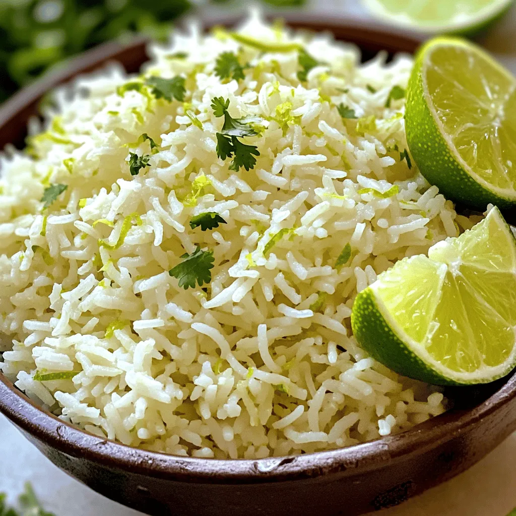To make coconut lime rice, you need just a few key ingredients. Here’s what you’ll need: - 1 cup basmati rice - 1 cup coconut milk (preferably full-fat for richness) - 1/2 cup water - 1 tablespoon fresh lime zest (from about 1 lime) - 2 tablespoons freshly squeezed lime juice - 1 tablespoon extra virgin olive oil - 1/2 teaspoon sea salt These ingredients come together to create a dish that is both rich and bright. The basmati rice gives a nice texture, while the coconut milk adds creaminess. Fresh lime zest and juice bring a zesty kick that makes this dish stand out. For an extra touch, consider these garnishes: - Fresh cilantro - Lime wedges Cilantro adds a fresh note, while lime wedges give you that zesty burst when served. Both make the dish even more appealing. You can easily swap out some ingredients if needed. Here are a few ideas: - Use a dairy-free alternative for coconut milk, such as almond milk or cashew cream, if you want a lighter taste. - If you don’t have basmati rice, you can try jasmine rice or even brown rice for a different flavor and texture. These substitutions can help you enjoy this delightful side dish no matter your dietary needs. First, rinse the basmati rice well. This step is key. Rinsing removes extra starch. It helps the rice cook fluffy. Place the rice in a bowl. Run cold water over it. Swirl the rice gently with your hand. Keep rinsing until the water runs clear. Next, it’s time to combine all the ingredients. In a medium-sized saucepan, add the rinsed rice. Pour in 1 cup of coconut milk and 1/2 cup of water. Add in the lime zest, olive oil, and sea salt. Use a spoon to mix everything well. Now, let's cook the rice. Place the saucepan over medium heat. Bring the mixture to a gentle boil. Watch it closely so it doesn’t boil over. As soon as it boils, reduce the heat to low. Cover the saucepan tightly with a lid. Let it simmer for about 15 minutes. The rice will absorb all the liquid during this time. After the 15 minutes, turn off the heat. Keep the lid on and let the rice steam. This step is crucial for fluffy rice. Let it sit for 5 more minutes. Now, fluff the rice gently with a fork. This helps separate the grains. Drizzle fresh lime juice over the rice. Mix lightly to blend in the flavors. For the full recipe, check the details above. Serve warm and enjoy the vibrant taste! To get fluffy coconut lime rice, start by rinsing the basmati rice. Rinsing removes excess starch. This step is key to achieving a light texture. Once rinsed, it’s time to cook. When cooking, pay close attention to simmering and steaming times. After bringing the mixture to a gentle boil, lower the heat. Cover the pan tightly and let it simmer for 15 minutes. After this, keep the lid on for another 5 minutes to steam. This will help the rice fluff up nicely. To boost the flavor of your coconut lime rice, consider adding extra ingredients. Chopped green onions or diced bell peppers can add a nice crunch. A pinch of cayenne pepper can add a kick. Adjusting seasoning is also important. After cooking, taste your rice. You can add more salt or lime juice to enhance the flavor. Just a small amount can make a big difference. Presentation matters! Serve the coconut lime rice in a lovely bowl. This showcases its fluffy texture and bright colors. Garnish with fresh cilantro for a pop of green. Pair the rice with grilled chicken or shrimp for a complete meal. You can also serve it alongside a colorful salad. This makes your dish not only tasty but also visually appealing. For the full recipe, check out the Coconut Lime Rice Delight. {{image_4}} You can use different types of rice for Coconut Lime Rice. Jasmine rice adds a lovely floral note. Brown rice gives more fiber and a nutty taste. It takes longer to cook, so be patient. Quinoa is a great grain alternative too. It cooks fast and has a unique texture. Quinoa also packs a protein punch, making it a popular choice. To enhance the dish, consider adding spices or herbs. Fresh cilantro or mint can brighten the flavor. You can also mix in vegetables like peas or bell peppers for color. If you want to make it heartier, add proteins like chicken or shrimp. These additions can turn this side into a full meal. Just ensure you balance the flavors to keep that coconut and lime essence. If you need a gluten-free option, Coconut Lime Rice fits the bill. All ingredients are naturally gluten-free. For a vegan twist, just use plant-based coconut milk, which is typically vegan-friendly. This dish is nutritious too! Coconut milk adds healthy fats while lime provides vitamin C. Each serving offers a tasty way to enjoy wholesome ingredients. Try the Full Recipe for a delicious experience. To store leftover coconut lime rice, first let it cool. Place it in an airtight container. This keeps the rice fresh and prevents it from drying out. I like to use glass containers. They are sturdy and help you see what’s inside. - Cool the rice completely before storing. - Use airtight containers for best results. Reheating coconut lime rice can be simple. You want to avoid dryness. The best methods are using a microwave or stovetop. - Microwave: Place the rice in a bowl. Add a splash of water. Cover with a damp paper towel. Heat for one minute. Stir and check the heat. Add more time if needed. - Stovetop: Heat on low in a saucepan. Stir often and add a bit of water. This keeps the rice moist. To maintain flavor, add a squeeze of fresh lime juice when reheating. This gives the rice a vibrant taste, just like when it was fresh. You can also freeze coconut lime rice for later. This is great for meal prep. To freeze, let the rice cool completely. - Use freezer-safe bags or containers. Remove as much air as possible. This helps prevent freezer burn. - Label the bags with the date to keep track. When ready to use, thaw the rice in the fridge overnight. You can also microwave it straight from the freezer. Just add a little water and heat until warm. This coconut lime