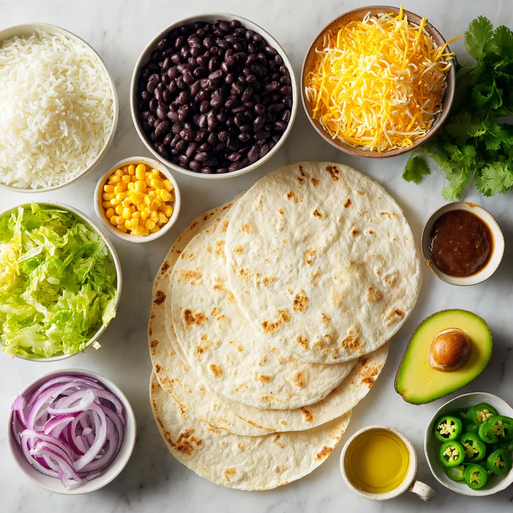 Gather these ingredients before you start cooking. The flour tortillas are the base of your melt. You can use white or brown rice, depending on your taste. Black beans add fiber and protein.