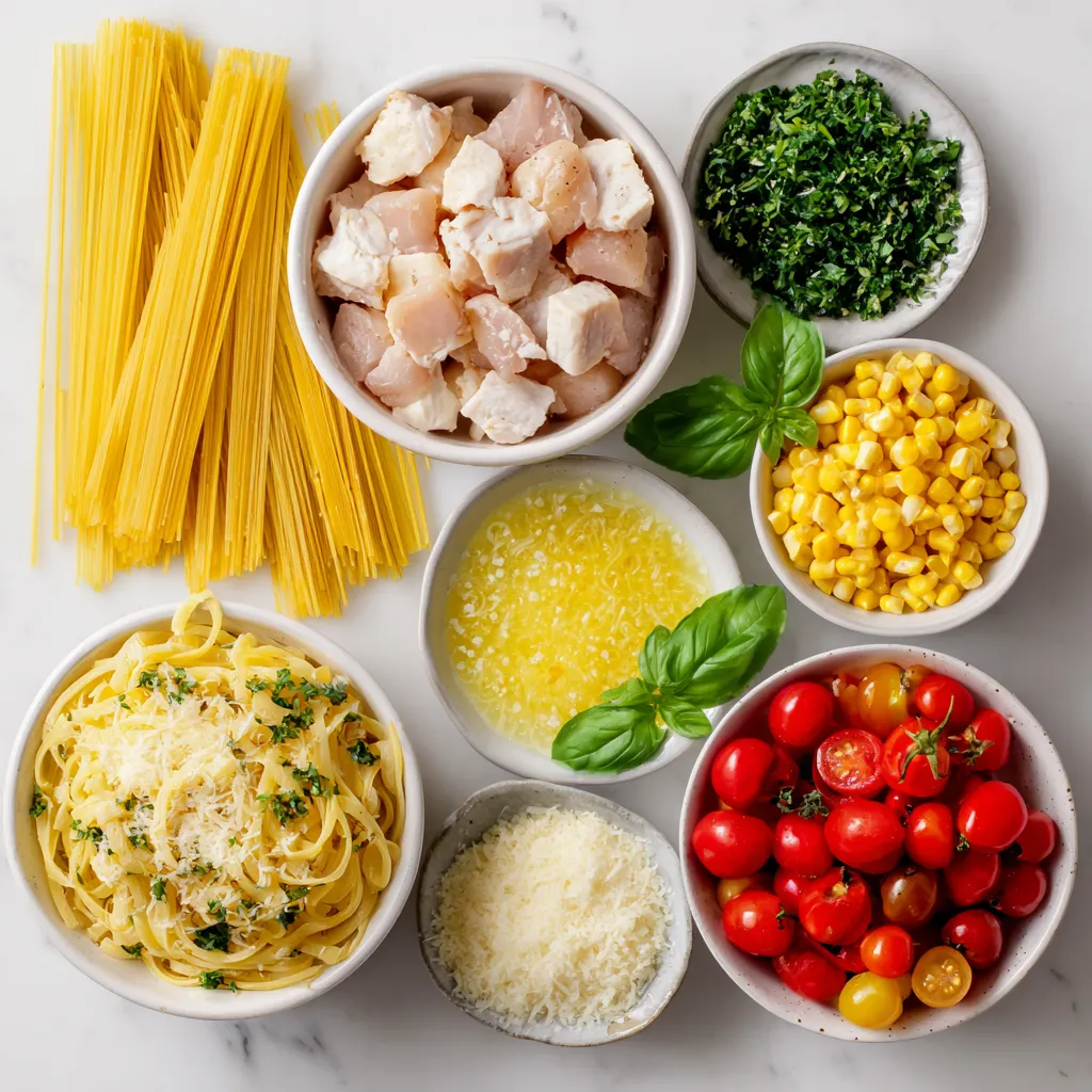These simple ingredients form the base of our delightful meal. The chicken adds protein, while the linguine provides a perfect texture.