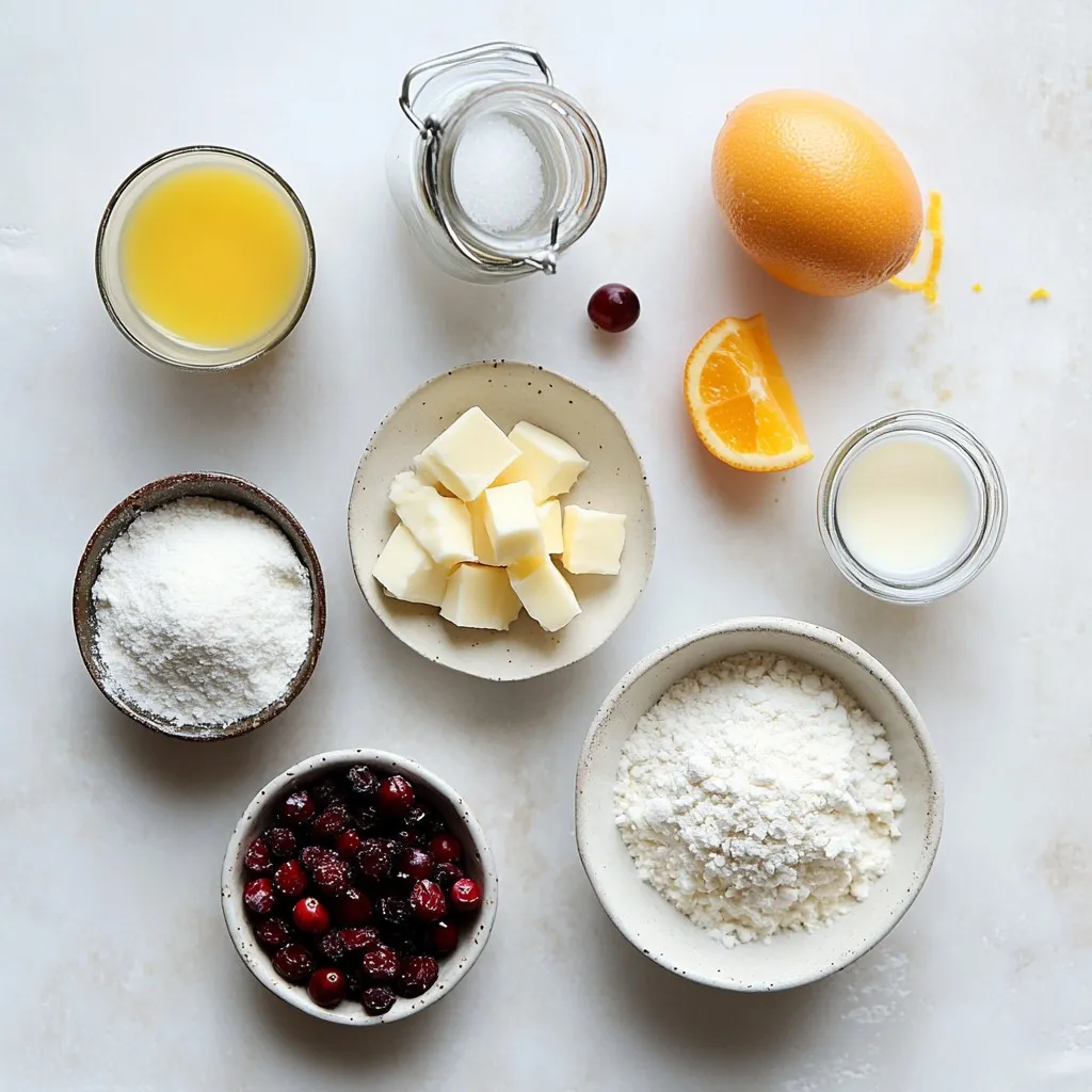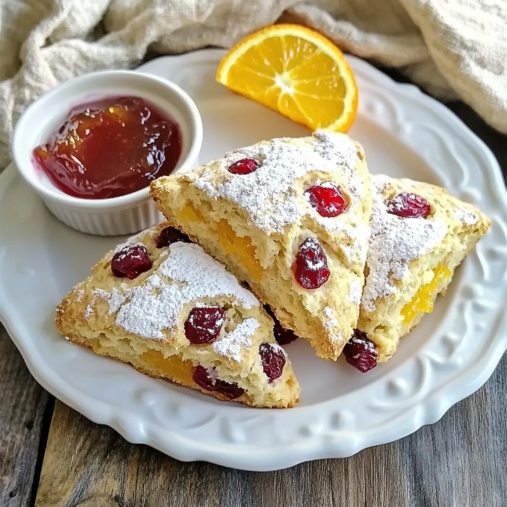 To make cranberry orange scones, gather these key items: - 2 cups all-purpose flour - 1/3 cup granulated sugar - 1 tablespoon baking powder - 1/2 teaspoon salt - 1/4 cup cold unsalted butter, cut into small cubes - 1/2 cup dried cranberries, chopped if large - Zest from 1 large orange, finely grated - 1/2 cup heavy cream - 1 large egg - 1 teaspoon pure vanilla extract - 1/4 cup freshly squeezed orange juice You can easily swap some ingredients based on your taste or needs: - Use whole wheat flour instead of all-purpose flour for a hearty texture. - Substitute coconut sugar for granulated sugar for a different sweetness. - Baking soda can replace baking powder; use 1/2 teaspoon and add 1 teaspoon of vinegar. - Replace heavy cream with almond milk for a lighter option. - For a dairy-free version, use vegan butter instead of cold unsalted butter. Choosing the right ingredients is key to great scones: - Flour: Look for unbleached all-purpose flour for better flavor. - Butter: Use high-quality unsalted butter for rich taste. Cold butter helps create flakiness. - Cranberries: Opt for plump, unsweetened dried cranberries for vibrant flavor. - Oranges: Choose organic oranges for zest to avoid pesticides. Freshly squeeze the juice for natural taste. - Eggs: Use fresh, organic eggs for the best texture and nutrition. These tips ensure you create the best cranberry orange scones every time! {{ingredient_image_2}} To make these cranberry orange scones, you start with simple steps. First, gather all your ingredients. Preheat your oven to 400°F (200°C). Line a baking sheet with parchment paper. This will help prevent the scones from sticking. 1. In a large bowl, mix the flour, sugar, baking powder, and salt. Whisk well until fluffy. 2. Add the cold butter cubes to the flour mix. Use a pastry cutter or your fingertips to blend until it looks like coarse crumbs. 3. Fold in the dried cranberries and the orange zest. Mix gently so everything is well distributed. 4. In another bowl, whisk together the cream, egg, vanilla, and orange juice until smooth. 5. Pour the wet mix into the dry ingredients. Stir just until moistened. A slightly sticky dough is perfect. 6. Lightly flour your surface. Turn out the dough and knead it gently a few times. Shape it into a disc, about 1 inch thick. 7. Cut the disc into 8 wedges with a sharp knife. Place them on the baking sheet, spaced about 2 inches apart. 8. Bake for 15 to 18 minutes. Look for a golden top and a clean toothpick when inserted. 9. Let the scones cool on the baking sheet for a few minutes. Then, transfer them to a wire rack to cool completely. - Do not overmix the dough. This makes the scones tough. - Use cold butter. This keeps the scones flaky. - Ensure the oven is preheated. An oven that is too cool may lead to uneven baking. - Space the scones apart. They need room to rise and bake evenly. To get the best texture for your scones, avoid overmixing. Mix until just combined. A slightly sticky dough is what you want. This helps keep your scones tender and light. Use cold butter for a flaky result. Cut it into the flour until it looks like small peas. This step is key for that perfect bite. Store your scones in an airtight container. This keeps them fresh for a few days. If you want to enjoy them later, freeze them. Wrap each scone in plastic wrap, then place them in a freezer bag. To reheat, pop them in a preheated oven at 350°F (175°C) for about 10 minutes. They'll taste just like fresh! When mixing the dough, use a gentle hand. Combine the wet and dry ingredients, but don’t overdo it. Stir just until the flour disappears. If you see dry spots, it’s okay. You can knead it lightly on a floured surface. This brings the dough together without toughening it. Remember, the goal is a tender scone, not a tough biscuit! Pro Tips Use Cold Butter: Ensure your butter is very cold to achieve the light and flaky texture that scones are known for. This helps create steam pockets as they bake. Don't Overmix: When combining the wet and dry ingredients, mix just until moistened. Overmixing can lead to dense scones instead of light and airy ones. Chill the Dough: If time allows, chill the shaped scone dough for about 15 minutes before baking. This helps them keep their shape and enhances the texture. Experiment with Add-ins: Feel free to customize your scones by adding nuts, chocolate chips, or different dried fruits to create your perfect flavor combination. {{image_4}} You can enhance your cranberry orange scones with nuts or spices. Adding 1/2 cup of chopped walnuts or pecans gives a lovely crunch. You might also try a pinch of cinnamon or nutmeg for warmth. These small changes make a big difference in taste. Experiment with flavors that you enjoy to make each batch unique! If you need a gluten-free option, you can use gluten-free all-purpose flour. Make sure it has xanthan gum for the best texture. Replace the heavy cream with a dairy-free alternative, like coconut cream. This swap keeps the scones rich and moist. You’ll still get that delightful orange and cranberry flavor in every bite. Feel free to replace dried cranberries with other dried fruits. Dried cherries or blueberries work well for a twist. You can even mix dried fruits for a fun flavor combo. Just keep the same amount to maintain balance in your scones. Each fruit brings its own sweetness and character, making your scones exciting every time! Cranberry orange scones shine when paired with warm drinks. A cup of fresh tea works wonders. Coffee also complements the bright flavors. For a special touch, try a lightly sweetened orange herbal tea. You may enjoy a glass of fresh orange juice, too. The bright citrus notes enhance the scones’ taste. Serve the scones warm for the best experience. A light dusting of powdered sugar adds charm. Place them on a pretty platter or a rustic wooden board. You can arrange fresh orange slices beside the scones for color. A small bowl of creamy butter or orange marm