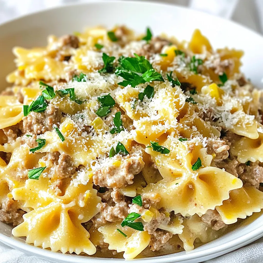 - Add the prepared bowtie pasta to the creamy beef sauce. Gradually mix in the reserved pasta water until you achieve your desired consistency for the sauce. Stir in the grated Parmesan cheese, mixing until the cheese has melted completely and is well incorporated into the sauce.