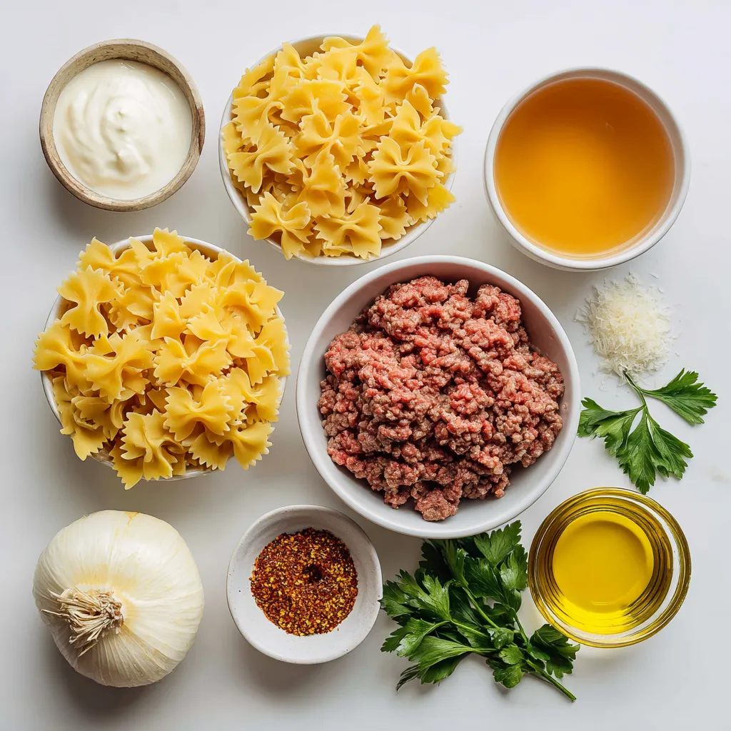 To make Creamy Garlic Beef Bowtie Pasta, you need a blend of fresh and pantry staples. First, you will need bowtie pasta, which gives a fun shape and texture. For protein, ground beef works best, bringing rich flavor. Aromatics like garlic and onion add depth to the dish, making it aromatic and savory.