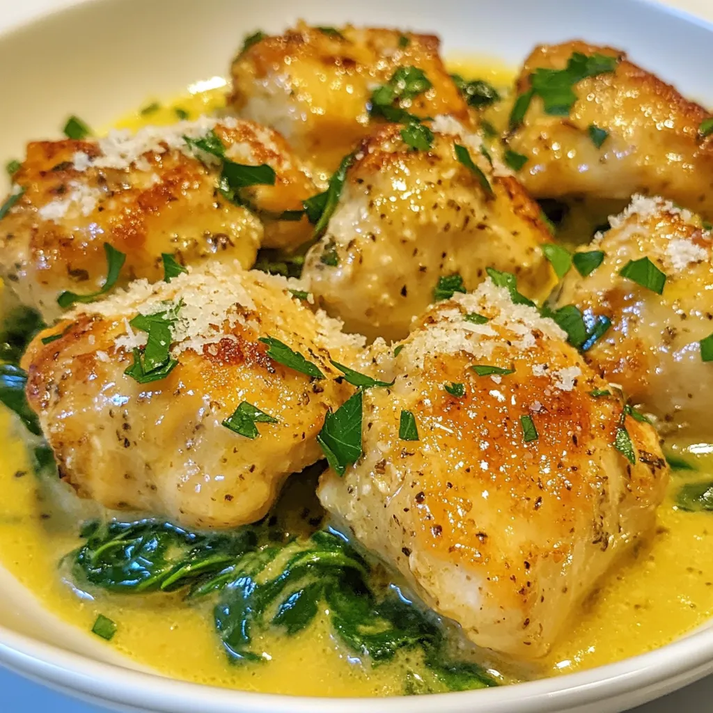 Now, it’s time to add the fun stuff! Toss in 1 cup of roughly chopped fresh spinach leaves. Cook for about 2 minutes until the spinach wilts and softens. Then, return the sautéed chicken to the skillet. Gently fold the chicken into the creamy sauce. Make sure each piece is coated well. Taste the dish and adjust the seasoning with salt and pepper if needed. Allow everything to cook together for another 2 minutes. This helps the flavors mix well. Serve warm, and enjoy your creamy garlic chicken bites!