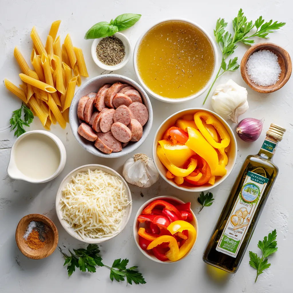 The main star is the kielbasa. This sausage gives a smoky flavor to the dish. I love using a mix of bell peppers. They add color and sweetness. Heavy cream makes the sauce rich and smooth. It blends well with chicken broth for a balanced taste. Onion and garlic bring out the savory notes. Italian seasoning ties it all together with aromatic herbs. Parmesan cheese adds a salty kick and creaminess to the sauce.