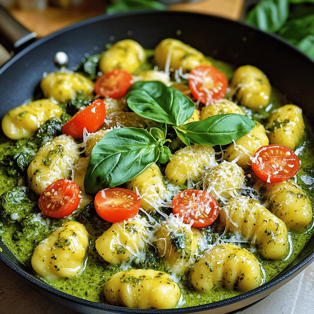 - 16 ounces potato gnocchi - 2 tablespoons olive oil - 4 cloves garlic, minced - 1 cup heavy cream - 1 cup freshly prepared basil pesto - 1 cup cherry tomatoes, halved - 1 cup baby spinach - 1/2 cup grated Parmesan cheese - Salt and black pepper to taste - Fresh basil leaves for garnish To make my creamy pesto gnocchi skillet, I focus on fresh ingredients. The potato gnocchi forms the base of this dish. I love using high-quality gnocchi for that soft, pillowy texture. Next, I add olive oil. It gives a rich flavor and helps cook the garlic. Garlic is key to this recipe. I use four cloves, minced, for a strong aroma and taste. Heavy cream follows, making the sauce rich and smooth. Fresh basil pesto is a must. I always opt for homemade pesto when I can. It brings a bright, fresh flavor. Cherry tomatoes add a burst of sweetness. Halving them helps release their juices. Baby spinach is a great way to sneak in some greens. It wilts quickly, adding color and nutrients. For a cheesy finish, I use grated Parmesan. It melts beautifully into the sauce. Lastly, I season with salt and black pepper. Fresh basil leaves make a lovely garnish. They provide a pop of color and extra flavor. With these ingredients, you will create a delicious and easy weeknight meal. Each bite is creamy, flavorful, and satisfying. To cook the gnocchi, start with a big pot of water. Add salt to the water. Bring it to a boil. Once boiling, add the potato gnocchi. Cook them until they float to the top, which takes about 2-3 minutes. This means they are done. Drain the gnocchi and set them aside. In a large skillet, heat 2 tablespoons of olive oil over medium heat. Once the oil is hot, add 4 cloves of minced garlic. Sauté the garlic for about 1 minute until it smells great. Be careful not to burn it. Next, pour in 1 cup of heavy cream. Bring this mixture to a gentle simmer. Stir in 1 cup of freshly prepared basil pesto. Keep stirring for 2-3 minutes, making sure it does not stick to the pan. Now it’s time to add some color and nutrients. Toss in 1 cup of halved cherry tomatoes and 1 cup of baby spinach. Cook until the spinach wilts, which takes about 2 minutes. Gently mix in the drained gnocchi. Stir until the gnocchi are well coated in the creamy sauce. Finally, add 1/2 cup of grated Parmesan cheese and season with salt and black pepper to taste. To make a great creamy pesto sauce, keep these tips in mind: - Use fresh basil pesto. It packs more flavor than jarred options. - Add the heavy cream slowly. This helps you control the sauce's thickness. - Stir constantly while cooking. This prevents the sauce from sticking and burning. You can enhance flavors by adding a pinch of red pepper flakes. This brings a subtle heat to the dish. A squeeze of lemon juice also brightens the sauce, making it taste fresh and vibrant. Garnishing your dish can elevate its look. Here are some ideas: - Top with extra grated Parmesan cheese. It adds richness and flavor. - Add fresh basil leaves for a pop of color and freshness. - Drizzle with high-quality olive oil before serving. This adds a nice shine. For sides, serve with a simple green salad. A crusty bread also pairs well, perfect for soaking up extra sauce. Watch out for these pitfalls while cooking: - Don’t overcook the gnocchi. They should float and be tender, not mushy. - Avoid high heat when cooking garlic. It can burn quickly and taste bitter. - Don’t skip seasoning. A little salt and pepper make a big difference in flavor. {{image_4}} You can make this dish lighter by using low-fat cream. Also, try substituting the gnocchi with zucchini noodles for a veggie twist. If you're gluten-free, look for gluten-free gnocchi. For dairy-free options, coconut cream works great instead of heavy cream. Nutritional yeast can replace cheese for a vegan choice. Adding protein can boost flavor and make this meal heartier. Grilled chicken or shrimp are great choices. Cook them in the pan before adding garlic. You can also toss in cooked sausage for more richness. For a veggie boost, add mushrooms, bell peppers, or broccoli. These options add texture and color, making your dish more appealing. You can serve this dish in many ways. For a fun twist, bake it in a casserole dish topped with breadcrumbs. This gives a crispy texture. You can also keep it vegetarian by ensuring any added proteins are meat-free. For a vegan meal, skip the cheese or use a dairy-free alternative. Serve it with a side salad for a complete meal. Store your creamy pesto gnocchi in an airtight container. Keep it in the fridge for up to three days. Make sure it cools down before you seal it. This helps prevent extra moisture buildup. If you have a lot left, divide it into smaller portions. This way, you can enjoy it later without thawing the whole dish. To reheat, use a skillet on low heat. Add a splash of cream or broth to keep it moist. Stir gently until it warms up. Avoid high heat, as this can break the sauce. You can also microwave it. Place it in a microwave-safe dish with a lid. Heat for one minute, then stir. Check and heat more if needed. You can freeze creamy pesto gnocchi for up to three months. Use a freezer-safe container or freezer bag. Make sure to remove as much air as possible. When ready to eat, thaw it overnight in the fridge. Reheat it gently, as mentioned above. Note that the texture may change slightly after freezing, but it will still taste great! Making this dish takes about 25 minutes. You’ll spend around 10 minutes prepping. Cooking takes about 15 minutes. It’s quick and perfect for a busy weeknight. Yes, you can use store-bought pesto. It saves time and can still taste great. However, homemade pesto can offer a fresher flavor. If you have time, I recommend trying your own. You can blend basil, garlic, nuts, and cheese for a tasty mix. This dish pairs well with many sides. Try a simple green salad with lemon dressing. Garlic bread is also a great choice. For drinks, serve with a light white wine or spar