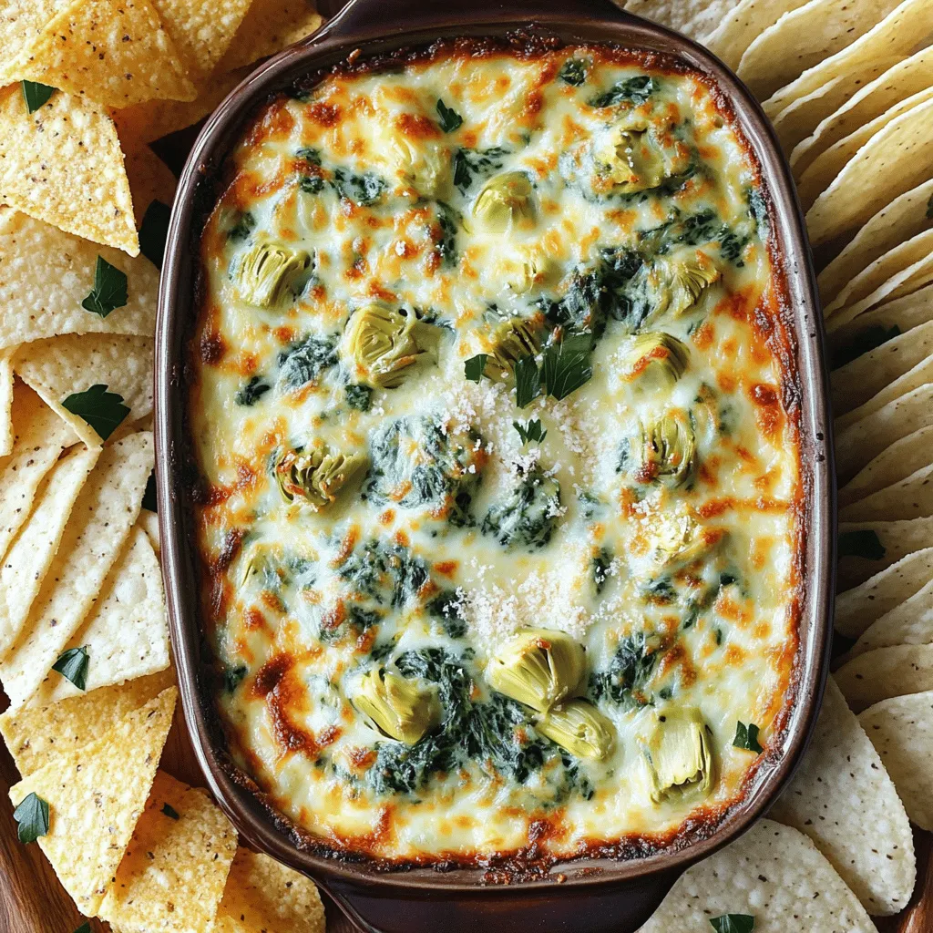 ![- 1 cup fresh spinach, finely chopped - 1 cup canned artichoke hearts, well-drained and chopped - 1/2 cup cream cheese, softened to room temperature - 1/2 cup sour cream - 1/2 cup mozzarella cheese, freshly shredded - 1/4 cup Parmesan cheese, finely grated - 2 cloves garlic, minced - 1 teaspoon fresh lemon juice - Salt and freshly ground black pepper to taste - 1/4 teaspoon red pepper flakes (optional) - Tortilla chips or freshly sliced baguette for serving The ingredients for creamy spinach artichoke dip come together easily. You can choose fresh or canned artichokes. I prefer fresh spinach for flavor, but both work well. Cream cheese gives the dip its base, making every bite rich and smooth. The sour cream adds tanginess. For that cheesy pull, I use mozzarella. Parmesan adds a salty bite that brightens the whole dish. I always add fresh garlic for depth. A splash of lemon juice lifts the flavors, making them pop. Salt and pepper balance the dish. If you like heat, use red pepper flakes. They add a nice kick without overwhelming the flavors. Serve with tortilla chips or a sliced baguette for dipping. Each bite of this dip is a creamy, cheesy delight. For the full recipe, check the section above. Preheating your oven to 350°F (175°C) is key for this dip. This step makes sure your dip cooks evenly. You want it to bubble and get a nice golden color. Skipping this step can lead to an uneven bake. In a large bowl, mix together the cream cheese, sour cream, mozzarella, and Parmesan. Use a spatula or a hand mixer to blend until smooth. This creates a rich and creamy base. The cream cheese must be soft for easy mixing. Make sure there are no lumps. A smooth texture makes the dip great for dipping. Next, gently fold in the chopped spinach and artichoke hearts. Add in the minced garlic, lemon juice, salt, pepper, and red pepper flakes if you like some heat. Stir carefully to mix everything well. This is where the magic happens. The flavors of spinach and artichokes blend to create a delicious combination. Now, spoon the mixture into a baking dish. Spread it evenly to create a uniform layer. Place the baking dish in the preheated oven and bake for 25 to 30 minutes. You want to see bubbling around the edges and a light golden top. This means your dip is ready. Once baked, let it cool for a few minutes before serving. This short wait allows the flavors to meld beautifully, making it taste even better. For the Full Recipe, visit the provided link. To get that smooth and creamy dip, mix your cheeses well. Start with softened cream cheese and sour cream. This helps avoid lumps. Use a spatula or hand mixer to blend everything until it's nice and smooth. When you add spinach and artichokes, fold them in gently. This keeps the dip fluffy and creamy. Want to kick up the flavor? Add more garlic! You can use three or four cloves if you love garlic. Fresh herbs like basil or parsley also boost taste. A sprinkle of cayenne pepper adds a fun kick. Experiment with Italian seasoning for a unique twist. Each addition brings new flavor layers to your dip. Serve your dip warm for the best experience. When it comes out of the oven, let it cool for a few minutes. This allows the flavors to blend well. Serve it hot with tortilla chips or sliced baguette. The warmth makes it extra inviting and tasty. For a lovely touch, sprinkle some extra Parmesan on top before serving. {{image_4}} You can make this dip lighter by swapping some ingredients. Use low-fat cream cheese and sour cream for a healthier twist. Greek yogurt is another great choice. It adds creaminess without the extra fat. You won't miss the full-fat versions. Plus, you still get that rich taste you love. Want to change up the flavor? Try adding different cheeses. Cheddar or gouda can give it a fun kick. You can also mix in spices like cumin or paprika. These simple tweaks can make your dip unique. Don’t be afraid to experiment. Each time, you can create a new favorite. For a vegan version, replace dairy products with plant-based alternatives. Use cashew cream or tofu for the cream cheese. You can also use coconut yogurt instead of sour cream. Nutritional yeast gives it a cheesy flavor. These swaps keep the dish creamy while being vegan-friendly. Enjoy delicious flavors without the dairy! For the full recipe, check out [Full Recipe]. Store leftover dip in an airtight container. This keeps the dip fresh and tasty. Place it in the fridge within two hours of serving. For longer storage, you can freeze it. Use a freezer-safe container and label it with the date. Make sure to leave some space for expansion when freezing. To reheat your dip, use an oven or a microwave. In the oven, preheat to 350°F (175°C). Place the dip in a baking dish and cover it with foil. Heat for about 15-20 minutes, or until warm. In the microwave, heat in short bursts of 30 seconds, stirring in between. This way, you keep the dip creamy and avoid a rubbery texture. The dip lasts about 3-4 days in the fridge. Make sure it is sealed well. If frozen, it can last up to 2 months. To enjoy the best flavor, eat it within this time. Always check for any off smell or change in texture before eating. Yes, you can make this dip ahead of time! Prepare the dip and store it in the fridge. Use an airtight container to keep it fresh. You can make it a day before your event. Just remember to bake it right before serving. If you want to reheat it, warm it in the oven until it's hot and bubbly. This dip pairs well with many snacks. Try serving it with: - Tortilla chips - Fresh vegetable sticks like carrots and celery - Sliced baguette - Pita chips These options add crunch and freshness. They also bring out the creamy flavor of the dip. You can bake this dip in a slow cooker! First, mix all the ingredients as usual. Then, place the mixture in the slow cooker. Cook it on low for about 2 to 3 hours. Stir it occasionally to keep it smooth. This method makes the dip perfect for parties, as it stays warm and