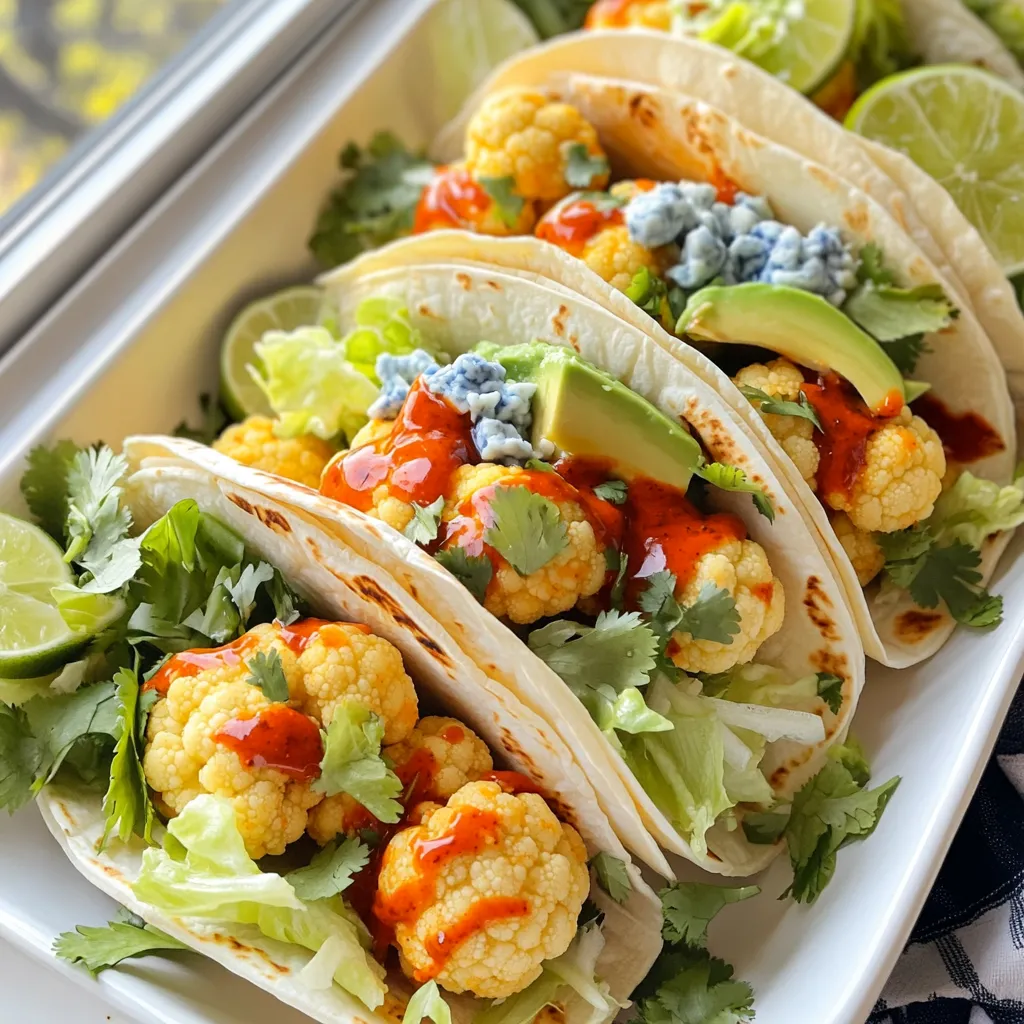 Take a warm tortilla. Fill it with the buffalo cauliflower mixture. Top it with shredded lettuce and sliced avocado. For extra flavor, sprinkle some crumbled blue cheese on top. This adds a creamy touch to your tacos.