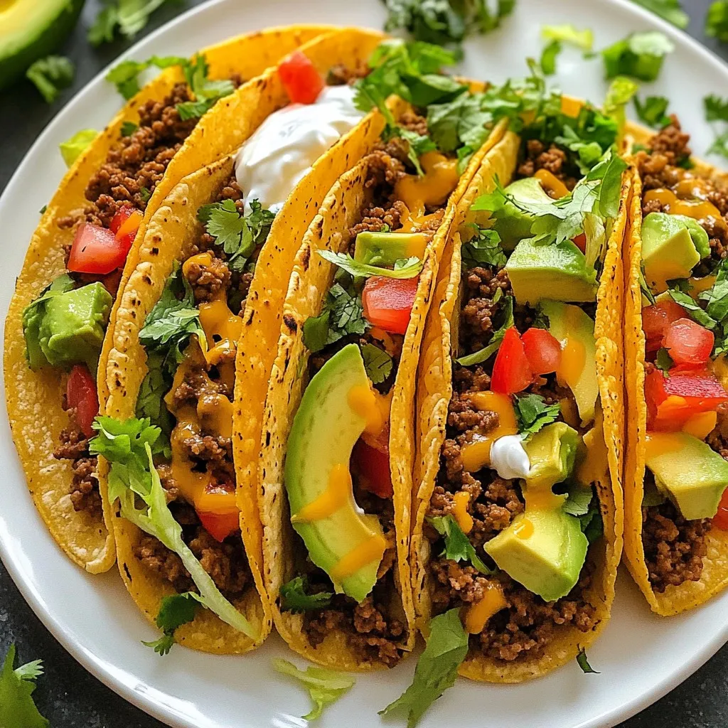 For crispy baked ground beef tacos, you need the following: - 1 lb ground beef - 1 small onion, finely chopped - 2 garlic cloves, minced - 1 tablespoon chili powder - 1 teaspoon ground cumin - 1 teaspoon smoked paprika - Salt and pepper to taste - 12 small corn tortillas - 1 cup shredded cheese (cheddar or Mexican blend) - 1 cup iceberg lettuce, finely shredded - 1 medium tomato, diced - 1 ripe avocado, diced - ½ cup sour cream - Fresh cilantro, chopped (for garnish) - Olive oil for brushing These ingredients combine to create a tasty and satisfying meal. If you have dietary needs, consider these swaps: - Use ground turkey or chicken for a leaner option. - Replace cheese with dairy-free cheese for a vegan choice. - Try lettuce wraps instead of tortillas for a low-carb meal. - Use gluten-free tortillas if gluten is a concern. These alternatives keep the dish delicious while fitting your needs. For the best taste, choose quality ingredients: - Select 80/20 ground beef for rich flavor and juiciness. - Opt for fresh, local produce for the best taste and nutrition. - Use organic olive oil for a healthier fat option. - Look for aged cheddar for a sharper flavor. Using quality ingredients makes a noticeable difference in your tacos. {{ingredient_image_2}} First, you need to preheat your oven to 375°F (190°C). This step helps the tacos bake evenly. While the oven heats, gather the ingredients. You want everything ready to go. In a large skillet, add 1 pound of ground beef over medium heat. Cook it until it turns brown. As it cooks, break it apart with a spatula. Once the beef is browned, drain any fat. Next, toss in the finely chopped onion and minced garlic. Sauté them for about 3-4 minutes. You want the onion to become soft and clear. Then, stir in 1 tablespoon of chili powder, 1 teaspoon of ground cumin, 1 teaspoon of smoked paprika, salt, and pepper. Mix and cook for 2-3 more minutes. This helps the spices blend well with the beef, giving it a great flavor. Now, let's prepare the corn tortillas. Brush both sides of each tortilla with olive oil. This step makes them crispier when baked. Lay the tortillas on a baking sheet. Spoon the beef mixture into each tortilla. Make sure to add a good amount of shredded cheese on top. Carefully fold each tortilla in half. Press the edges gently to keep the filling inside. Arrange them on the baking sheet without overlapping. Bake in the oven for about 15-20 minutes. You want the tortillas to turn golden and crispy. Once done, take them out and let them cool for a few minutes. This way, they are easier to handle. Finally, top each taco with shredded lettuce, diced tomatoes, and avocado. Add a scoop of sour cream and sprinkle cilantro for a fresh touch. Enjoy your crispy baked tacos! To make your tacos extra crispy, brush both sides of the corn tortillas with olive oil. This tiny step helps them crisp up in the oven. Make sure to bake them at 375°F (190°C) for about 15-20 minutes. Keep an eye on them to ensure they turn golden brown without burning. You can add more flavor to your beef by using different spices. Try adding cayenne pepper for heat or oregano for a fresh taste. If you want to change up the cheese, use pepper jack for a spicy kick or queso fresco for a milder flavor. You can also add black beans or corn to the beef mixture for a fun twist. One common mistake is overfilling the tortillas. If you pack them too tight, they might rip or not bake evenly. Another mistake is not preheating the oven. Always preheat to ensure the tacos bake properly. Lastly, be careful with the oil. Too much can make the tacos greasy instead of crispy. Pro Tips Use Fresh Ingredients: Fresh vegetables and herbs enhance the flavor and texture of your tacos. Opt for ripe avocados and crisp lettuce for the best results. Customize Your Spices: Adjust the spices to your taste. If you prefer more heat, add cayenne pepper or jalapeños to the beef mixture. Warm Your Tortillas: Slightly warming the tortillas before assembly makes them more pliable and helps prevent cracking when folding. Experiment with Fillings: Feel free to mix up the fillings! Try adding black beans, corn, or even grilled vegetables for a delicious twist. {{image_4}} If you want a meatless option, try lentils or black beans. They add protein and fiber. Cook them with the same spices as the beef. You can even add some bell peppers for extra flavor. Use them in place of ground beef. This keeps the dish tasty and healthy. Cheese can change the taco’s flavor. Try Monterey Jack or Pepper Jack for a kick. For a creamy touch, use queso fresco. You can also mix cheeses for more depth. As for sauces, salsa verde or chipotle mayo can spice things up. These options make your tacos more exciting and fun. Get creative with your fillings. Try adding roasted veggies like zucchini or bell peppers. For a twist, use pulled jackfruit for a fun texture. You can also include beans, corn, or even quinoa. Top it off with fresh herbs like cilantro or green onions for added freshness. Making your tacos unique makes them more enjoyable. To store leftover tacos, let them cool down first. Place them in an airtight container. If you have toppings like lettuce or avocado, store them separately. This keeps everything fresh. You can keep them in the fridge for up to three days. To freeze the tacos, wrap them in plastic wrap tightly. Then, place them in a freezer bag. They can stay in the freezer for up to three months. To reheat, remove the wrap and place them on a baking sheet. Bake at 350°F (175°C) for about 15 minutes. This will make them crispy again. Keep your ingredients fresh by storing them properly. Store ground beef in the coldest part of your fridge. Use it within two days. For spices, keep them in a cool, dark place. Toppings like cheese and sour cream last longer in the fridge if sealed well. Use fresh produce within a week for the best taste. Yes, you can use flour tortillas. Flour tortillas are softer and may not c