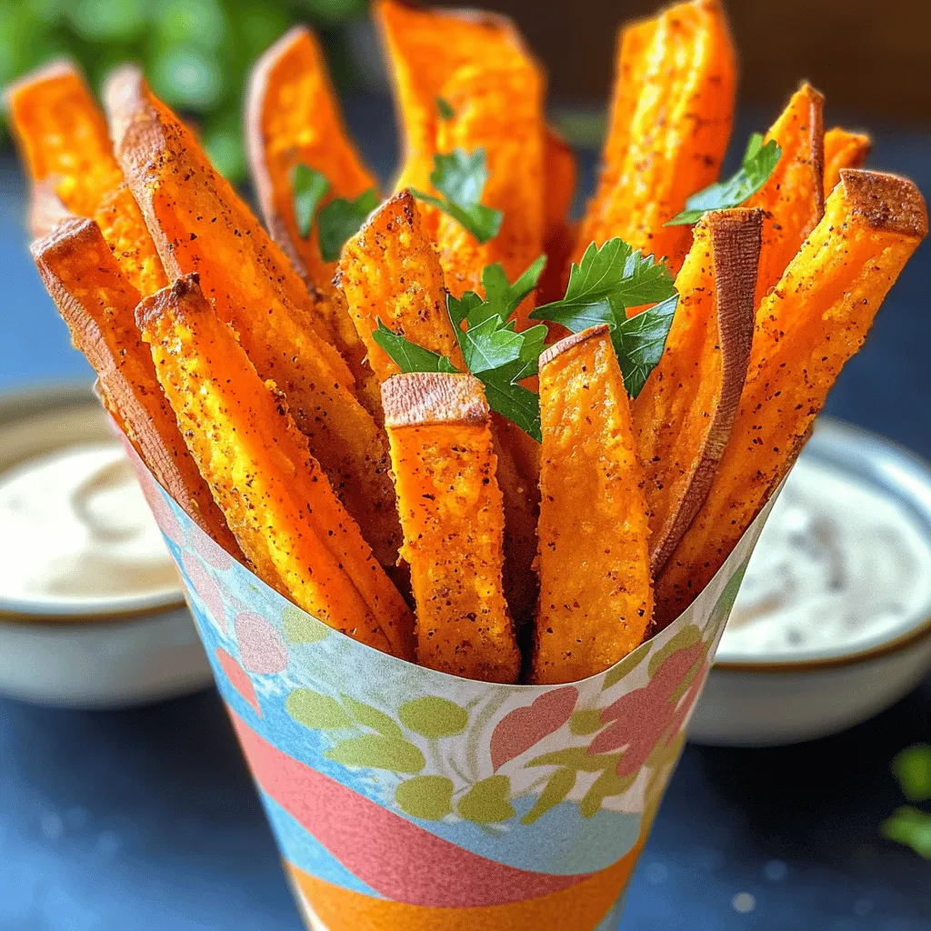 ![To make crispy baked sweet potato fries, you need simple ingredients. Here is the list: - 2 large sweet potatoes - 2 tablespoons olive oil - 1 teaspoon smoked paprika - 1 teaspoon garlic powder - 1 teaspoon onion powder - ½ teaspoon salt - ½ teaspoon black pepper - ½ teaspoon cayenne pepper (optional) - Fresh parsley for garnish These ingredients work together to create a tasty snack. Sweet potatoes give a sweet, earthy flavor. Olive oil helps them crisp up in the oven. The spices add depth and warmth. You can easily find these ingredients at your local store. For the full recipe, follow the steps to bring this dish to life. - Preheat oven to 425°F (220°C) - Line a baking sheet with parchment paper Start by preheating your oven. This helps cook the fries evenly. While the oven heats, line a baking sheet with parchment paper. This keeps the fries from sticking and makes cleanup easy. - Peel and slice sweet potatoes into fries Next, take your sweet potatoes and peel them. Use a sharp vegetable peeler for this task. After peeling, slice the sweet potatoes into long, thin shapes. Try to keep the fries the same size. This ensures they cook at the same rate. - Mix olive oil and spices for the marinade - Coat the sliced sweet potatoes evenly In a large bowl, mix olive oil with spices. Use smoked paprika, garlic powder, onion powder, salt, black pepper, and cayenne pepper if you like heat. Stir well until everything blends. Add your sliced sweet potatoes to the bowl. Toss them gently to coat each fry with the marinade. This will add great flavor. - Spread fries in a single layer on the baking sheet - Bake for 20 minutes, flip, and bake an additional 10-15 minutes Now, spread the fries on the baking sheet. Make sure they are in a single layer. This spacing is key for crispiness. Place the sheet in the oven and bake for 20 minutes. After that, use a spatula to flip the fries over. Bake them for another 10-15 minutes until golden brown. Keep an eye on them to avoid burning. To make the crispiest sweet potato fries, slice the potatoes evenly. Uniform thickness helps them cook at the same rate. Aim for about 1/4 inch thick pieces. This way, each fry will be golden and crunchy. When you place the fries on the baking sheet, give them space. Avoid overcrowding the pan. If they touch, they will steam instead of crisp up. Use two baking sheets if needed. Adding extra seasonings can boost the taste of your fries. Try adding cumin for a warm flavor or a pinch of cinnamon for sweetness. You can also use ranch seasoning for a tasty twist. If you want a healthier option, swap olive oil for cooking spray. This will cut down on calories without losing flavor. You can also bake the fries without oil for a lighter snack. Get fun with your presentation! Serve the fries in a mason jar or a colorful cone. This makes your snack look special and inviting. Dipping sauces also add a lot to the experience. Honey mustard is a perfect match, giving a sweet and tangy taste. Spicy mayo adds a nice kick. You can even mix ketchup with a bit of hot sauce for a fun dip. For the full recipe, check out the section above and enjoy making these crispy baked sweet potato fries! {{image_4}} You can change up your sweet potato fries by adding different seasonings. For a sweet twist, try cinnamon and sugar. This mix gives a fun, dessert-like flavor. If you like heat, add spicy jalapeño or chili powder. These spices will give your fries a nice kick. Experimenting with seasonings makes each batch unique! You can cook sweet potato fries in different ways to change the flavor. An air fryer is a great choice if you want extra crispy fries. Just follow the same steps as baking but adjust the time to about 15-20 minutes. For a smoky flavor, try grilling them. Grill until they are tender and have nice marks from the grill. If you're concerned about diets, there are easy swaps. Sweet potato fries are naturally gluten-free, so you can enjoy them without worry. For vegan-friendly fries, just use olive oil and the seasonings in the recipe. There’s no need for animal products here. Both variations taste amazing and fit many diets. For more ideas, check out the [Full Recipe]. To keep your leftover sweet potato fries fresh, store them in an airtight container. Place them in the fridge. They will last for about 3 days. When you want to eat them again, reheating is key. To get that crispy texture back, use the oven. Set it to 400°F (200°C). Spread the fries on a baking sheet and heat for about 10 minutes. This method keeps them crunchy and tasty. If you want to freeze uncooked fries, follow these steps. Start by slicing the sweet potatoes as you normally would. Next, spread the fries out on a baking sheet in a single layer. Freeze them for about 1 hour. Once they are frozen, transfer them to a zip-top bag. Remove as much air as you can before sealing. They can stay fresh in the freezer for up to 3 months. When you’re ready to cook the frozen fries, there’s an easy way to reheat them. Preheat the oven to 425°F (220°C). Spread the frozen fries on a baking sheet without thawing them first. Bake for 25 to 30 minutes, flipping halfway through. This method ensures they will come out crisp and delicious. Enjoy your crispy baked sweet potato fries! For the complete recipe, check out the Full Recipe. To make crispy baked sweet potato fries, start with dry sweet potatoes. Cut them into even pieces. This helps them cook evenly. Coat the fries well with olive oil and spices. Spread them out on the baking sheet. Don’t let them touch! Bake at 425°F (220°C) for 20 minutes. Flip them halfway to crisp all sides. This method lets air flow around the fries, which helps them get crispy. Yes, you can use other potatoes like russet or Yukon gold. These types will give you a different taste and texture. Russet potatoes are starchy and can get very crispy. Yukon golds are creamy and have a rich flavor. Just remember to cut them the same size for even cooki