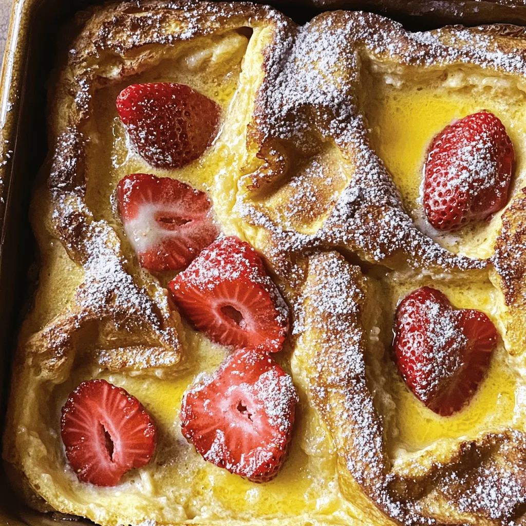 To make this tasty casserole, you need some key items: - 1 loaf of brioche or challah bread, cut into 1-inch cubes - 6 large eggs - 2 cups whole milk - 1 cup heavy cream - 1/2 cup pure maple syrup - 1 teaspoon vanilla extract - 1 teaspoon ground cinnamon - 1/4 teaspoon salt - 1 cup fresh strawberries, sliced (or any berries of your choice) - Butter, for greasing the baking dish - Powdered sugar, for dusting (optional) These ingredients create a rich and creamy base that fills each bite with flavor. The bread soaks in the egg mixture, adding softness and taste. You can tweak the recipe to fit your taste. Here are some ideas: - Other fruits like blueberries, raspberries, or bananas - Nuts for added crunch, like walnuts or pecans - Chocolate chips for a sweet twist - Different spices like nutmeg or ginger - Yogurt or sour cream for tanginess Feel free to mix and match! Customizing makes this dish even more fun and tasty. If you lack some ingredients, here are easy swaps: - Use almond milk or oat milk instead of whole milk for a dairy-free option. - Swap heavy cream with half-and-half if you want a lighter touch. - Try agave syrup instead of maple syrup for a different sweet flavor. - For gluten-free, use gluten-free bread, ensuring it’s sturdy enough to hold up. These substitutions keep the dish good while catering to your needs. Don't hesitate to experiment! For the full recipe, check out the detailed instructions. First, set your oven to 350°F (175°C). Grab a 9x13-inch baking dish. Grease it well with butter. This step helps prevent the casserole from sticking. Make sure every corner gets some butter. In a large bowl, crack six eggs. Add two cups of whole milk and one cup of heavy cream. Pour in half a cup of pure maple syrup. Next, add one teaspoon of vanilla extract and one teaspoon of ground cinnamon. Sprinkle in a bit of salt, about one-fourth teaspoon. Whisk all these ingredients together until smooth. It should look creamy and well-mixed. Now, take your loaf of brioche or challah bread. Cut it into one-inch cubes. Gently fold these cubes into your egg mixture. Use a spatula to coat each piece. Let this sit for about ten minutes so the bread can soak it up well. After ten minutes, fold in one cup of sliced strawberries. Make sure they spread evenly in the mix. Pour everything into your greased baking dish. Spread it out evenly with a spatula. Now, place it in the oven. Bake for 45 to 50 minutes. The top should turn golden brown. Finally, let it cool for five to ten minutes. Dust with powdered sugar if you'd like. Enjoy your lovely Easy Baked French Toast Casserole! For the full recipe, check [Full Recipe]. To get a creamy custard, mix eggs and milk well. Use whole milk for richness. Heavy cream adds more creaminess. Whisk until the mixture is smooth. Let the bread soak for at least 10 minutes. This helps it absorb the custard. The bread should feel soft but not mushy. You can prepare this dish a day before. Just mix the custard and soak the bread. Cover it and store in the fridge overnight. This lets the bread soak up all the flavors. In the morning, just pop it in the oven. It saves you time and effort! Serve your casserole warm for the best taste. Cut it into squares for easy serving. Top with fresh berries or a drizzle of maple syrup. A dusting of powdered sugar adds a nice touch. You could also add a dollop of whipped cream. This makes it look fancy and inviting! For the full recipe, check out the details above. {{image_4}} You can change the fruit in your casserole. I love using fresh strawberries. They add sweetness and color. You can also use blueberries, raspberries, or blackberries. Apples work well too. Cut them into small pieces and mix them in. For a tasty twist, add bananas. They become soft and sweet after baking. Want to amp up the flavor? Try adding spices like nutmeg or ginger. A pinch of each can give your casserole a warm taste. You can also use different extracts. Almond extract adds a nice touch, while orange zest can brighten the dish. Just remember, a little goes a long way! If you're looking for healthier choices, you can make your casserole low-fat. Use low-fat milk and cream. You can also swap the brioche for whole grain bread. For a gluten-free version, use gluten-free bread. It tastes great and keeps the dish light. Don't worry; it will still be delicious! For the full recipe, check out the delightful baked French toast casserole. Enjoy trying out these variations! To store leftovers, let the casserole cool completely. Then, cover it tightly with plastic wrap or foil. You can also place it in an airtight container. This keeps it fresh for up to three days in the fridge. If you have leftover slices, it’s best to separate them with parchment paper to avoid sticking. When you are ready to eat, preheat your oven to 350°F (175°C). Place the casserole in an oven-safe dish. Cover it with foil to prevent it from drying out. Heat it for about 20 to 25 minutes, or until it is warm all the way through. You can also microwave individual pieces for quick reheating. Just be sure to cover them to keep moisture in. If you want to keep the casserole longer, freezing is a great option. First, cool it completely. Then, cut it into portions and wrap each one in plastic wrap. Place the wrapped pieces in a freezer-safe bag or container. This keeps them fresh for up to three months. When you are ready to eat, thaw in the fridge overnight. Then, reheat as mentioned above. Enjoy a tasty meal even after some time! Yes, you can make this dish ahead of time! You can prepare it the night before. Just mix the egg base and soak the bread. Cover it and place it in the fridge. In the morning, bake it fresh. This helps the flavors blend well. For the best taste, use brioche or challah bread. These breads soak up the egg mixture well. They also give a soft texture and rich flavor. You can also try French bread or even sourdough. You’ll know it’s done when the top is golden brown