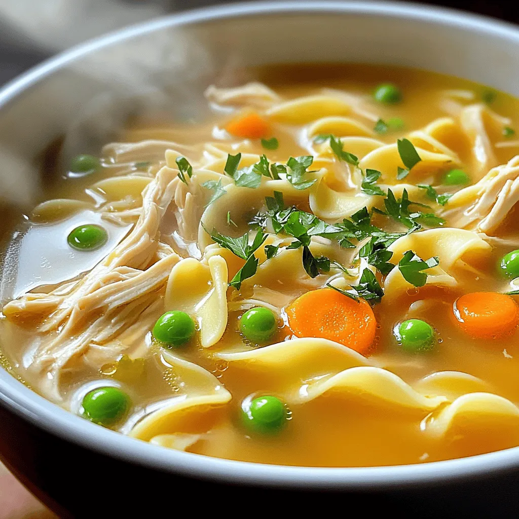![To make easy chicken noodle soup, gather these simple ingredients: - 1 tablespoon olive oil - 1 medium onion, finely chopped - 2 carrots, peeled and sliced into thin rounds - 2 celery stalks, diced into small pieces - 3 cloves of garlic, minced - 1 pound boneless, skinless chicken breasts - 6 cups chicken broth (homemade or low-sodium) - 1 teaspoon dried thyme - 1 bay leaf - 8 ounces egg noodles - 1 cup frozen peas - Salt and freshly ground black pepper to taste - Fresh parsley, chopped (for garnish) These ingredients work together to create a warm, hearty dish. The chicken adds protein, while the veggies give great flavor. The egg noodles soak up the broth, making each bite comforting. I always choose low-sodium broth for control over salt. Using fresh parsley at the end makes the dish pop with color. For the full recipe, you can check out the detailed steps to bring this soup to life. Sautéing Aromatics Start by heating 1 tablespoon of olive oil in a large stockpot over medium heat. Once the oil is hot, add the finely chopped onion, sliced carrots, and diced celery. Sauté these for about 5-7 minutes. You want them to become tender and smell great. Next, add 3 cloves of minced garlic and sauté for another 1-2 minutes. Stir it constantly to avoid burning the garlic. Cooking the Chicken Now, it’s time for the star of the show: the chicken. Carefully place 1 pound of boneless, skinless chicken breasts into the pot. Pour in 6 cups of chicken broth, then add 1 teaspoon of dried thyme and 1 bay leaf. Bring this mixture to a boil. Once it’s boiling, reduce the heat to low. Let it simmer for about 15-20 minutes. The chicken should reach an internal temperature of 165°F (75°C). Shredding the Chicken After cooking, carefully remove the chicken from the pot using tongs or a slotted spoon. Shred the chicken into bite-sized pieces using two forks. Once shredded, return the chicken to the pot to soak up all the flavors. Adding Noodles and Peas Next, stir in 8 ounces of egg noodles and 1 cup of frozen peas. Cook the soup for an additional 7-10 minutes. The noodles should be al dente and tender, ready to enjoy. Seasoning the Soup Taste your soup! Season it with salt and freshly ground black pepper, adjusting to your liking. Don’t forget to remove the bay leaf before serving. Tips for Serving Serve the soup hot in bowls. For a nice touch, sprinkle some freshly chopped parsley on top. This adds color and a burst of flavor. Enjoy this comforting bowl of easy chicken noodle soup! For complete details, check out the Full Recipe. Choosing the Right Broth Use homemade broth for the best flavor. If you don’t have time, low-sodium store-bought broth works too. It keeps the soup light and lets other flavors shine through. How to Properly Shred Chicken After cooking the chicken, let it cool slightly. Use two forks to pull the chicken apart. This keeps it moist and tender. You can also use your hands if you prefer. Ensuring Perfect Noodles Cook the noodles separately if you want them to stay firm. Overcooked noodles can turn mushy in the soup. If you add them straight to the pot, just keep an eye on the cooking time. Adding Fresh Herbs and Spices Fresh herbs like parsley or thyme brighten the soup. You can also add a squeeze of lemon juice for a touch of zest. Experiment with flavors to find your perfect mix. Substituting Ingredients Feel free to swap out chicken for turkey or use veggie broth for a vegetarian version. You can also add other veggies like spinach or corn for extra nutrition. Slow Cooker/Instant Pot Options For a slow cooker, add all the ingredients and cook on low for 6-8 hours. In an Instant Pot, cook on high pressure for 15 minutes, then shred the chicken. Both methods make great soup with less effort. For the complete recipe, check out the [Full Recipe]. {{image_4}} - Switching to Whole Wheat Noodles Whole wheat noodles add more fiber. They make the soup heartier. Plus, they keep you full longer. - Using Low-Sodium Ingredients Low-sodium chicken broth helps control salt intake. It is great for those watching their sodium levels. You still keep all the flavor without the extra salt. - Adding Spinach or Kale Spinach or kale boosts nutrition. They add vitamins and minerals. Toss them in just before serving for a fresh taste. - Mexican Chicken Noodle Soup Add cumin and lime juice for a twist. Include black beans and corn for extra texture. This gives your soup a bright, zesty flavor. - Creamy Chicken Noodle Soup Stir in some heavy cream or coconut milk. This makes the soup rich and smooth. It feels like a warm hug in a bowl. - Spicy Chicken Noodle Soup Use red pepper flakes or jalapeños to spice things up. This adds a kick that warms you from the inside. Perfect for chilly days or when you need a little heat. For detailed steps on how to make your soup, check the Full Recipe. Store your easy chicken noodle soup in an airtight container. This keeps it fresh and tasty. Let the soup cool down before sealing it. You can keep it in the fridge for up to four days. Just remember to reheat it well before serving. If you notice any off smell or change in color, it’s best to discard it. To freeze your soup, use freezer-safe containers. Leave some space at the top, as the soup will expand. It can last up to three months in the freezer. When you’re ready to eat it, let it thaw overnight in the fridge. Reheat the soup on the stove over low heat. Stir it often to keep it warm and to avoid burning. You can also use a microwave. Just heat it in short bursts and stir in between. This keeps the soup delicious and helps it warm evenly. For the best taste, add fresh herbs or a squeeze of lemon after reheating. For the full recipe, visit the link provided. Can I use rotisserie chicken? Yes, rotisserie chicken works great! It saves time and adds rich flavor. Just shred it and add it to your soup near the end of cooking. How do I make chicken noodle soup thicker? To thicken your soup, try adding more n