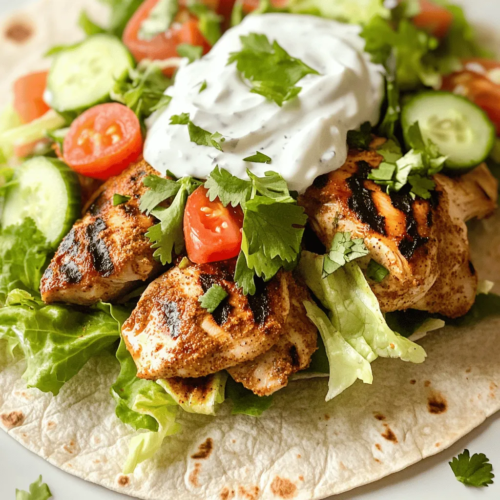 ![- 1 lb boneless, skinless chicken thighs - 4 large whole wheat tortillas or pita bread - 1 cup romaine lettuce, shredded - 1 large tomato, diced - 1 cucumber, diced - 3 tablespoons extra virgin olive oil - 1 tablespoon ground cumin - 1 tablespoon smoked paprika - 1 teaspoon ground turmeric - 1 teaspoon ground coriander - 1 teaspoon garlic powder - 1 teaspoon onion powder - Salt and freshly cracked black pepper, to taste - 1 cup creamy Greek yogurt - 1 tablespoon tahini - 1 tablespoon freshly squeezed lemon juice These ingredients create a rich and tasty chicken shawarma wrap. Chicken thighs are key for their juicy texture. Whole wheat tortillas or pita bread give your wrap a healthy base. Fresh veggies like lettuce, tomato, and cucumber add crunch and flavor. The marinade is full of spices like cumin and paprika that bring warmth and depth. Olive oil helps the spices cling well to the chicken. The sauce made with Greek yogurt, tahini, and lemon juice offers a creamy, tangy kick. For the full recipe, check the section above. Enjoy crafting your easy chicken shawarma wraps! To start, you need to make the marinade. In a bowl, combine: - 3 tablespoons extra virgin olive oil - 1 tablespoon ground cumin - 1 tablespoon smoked paprika - 1 teaspoon ground turmeric - 1 teaspoon ground coriander - 1 teaspoon garlic powder - 1 teaspoon onion powder - Salt and freshly cracked black pepper, to taste Whisk these ingredients together until they mix well. This step adds lots of flavor. Next, take 1 lb of boneless, skinless chicken thighs. Coat the chicken with the marinade, making sure every piece is covered. Cover the bowl with plastic wrap. You should refrigerate it for at least 30 minutes. For the best taste, let it sit for up to 2 hours. Now, it’s time to cook the chicken. Preheat your grill or a heavy skillet over medium-high heat. Once it’s hot, place the marinated chicken thighs on the grill. Cook each side for about 6-7 minutes. You want the chicken to be fully cooked and have a nice char. After cooking, remove the chicken from the heat. Let it rest for a few minutes. This helps keep the juices in. Then, slice the chicken into thin strips. Now, let’s assemble your wraps! Start by spreading sauce on the tortilla. For the sauce, mix 1 cup of creamy Greek yogurt, 1 tablespoon tahini, and 1 tablespoon freshly squeezed lemon juice in a bowl. Add a pinch of salt and pepper to taste. Once the sauce is on the tortilla, layer on the sliced chicken. Next, add a handful of shredded romaine lettuce, diced tomatoes, and diced cucumbers. These veggies add crunch and freshness. To finish, sprinkle with fresh cilantro or parsley. Carefully fold the sides of the tortilla inwards and roll it up tightly. For an extra crispy finish, grill the wrapped shawarma for 1-2 minutes. This makes the outside golden and crispy. Finally, slice the wrap in half diagonally and serve it right away. You can also serve any extra creamy dressing for dipping. Enjoy your Easy Chicken Shawarma Wraps! For the complete recipe, check out the [Full Recipe]. To get the best taste from your chicken shawarma, marinate the chicken for at least 30 minutes. If you have time, aim for 2 hours. This allows the flavors to soak in deeply. Want to spice up your marinade? Add a pinch of cayenne for heat. You can also toss in some smoked paprika for a richer flavor. Fresh herbs like thyme or mint will add a nice twist. Even a splash of vinegar can brighten the taste. When you assemble your wraps, wrap them tightly. Start by laying the chicken and veggies in the center. Fold the sides in, then roll from the bottom. This keeps everything inside. If you like a crispy wrap, grill it after rolling. Heat a skillet over medium heat. Grill each side for 1-2 minutes until golden. This extra step gives you a crunchy texture that contrasts with the juicy filling. {{image_4}} You can easily modify chicken shawarma wraps to fit your diet. If you want a gluten-free option, try using lettuce wraps. Just take large leaves of romaine or butter lettuce. They make a great, crunchy shell for your fillings. For a vegetarian option, consider using falafel or grilled veggies. Falafel adds a nice crunch and flavor. Grilled veggies like zucchini, bell peppers, and eggplant work well too. These options keep the meal tasty and satisfying. To make your wraps even better, think about adding toppings. Chopped olives and crumbled feta cheese can give a salty kick. You could also add sliced radishes for a nice crunch. Alternative sauces can enhance the dish too. Tzatziki sauce made with yogurt, cucumber, and garlic adds a cool and refreshing taste. You can mix it up by trying different sauces like hummus or spicy harissa. These additions help you create a wrap that suits your own taste perfectly. Don't forget to check the Full Recipe for more ideas! To keep your chicken shawarma wraps fresh, store them well. Wrap each shawarma tightly in plastic wrap or foil. This prevents air from getting in and keeps them from drying out. You can also place them in an airtight container. In the fridge, they will stay good for up to three days. After that, the taste and texture might change. When it's time to eat, reheating should keep the wraps tasty. I suggest using a skillet over low heat. This method warms the shawarma without making it soggy. Heat them for about 3-5 minutes on each side. You can also use an oven. Wrap them in foil and heat at 350°F for about 10 minutes. If you have extra chicken, use it in salads or grain bowls. It adds flavor and protein to any meal. The wraps are also great for lunch the next day. Just remember to store them well! For the full recipe, check out the detailed instructions above. You can marinate chicken shawarma for at least 30 minutes. For better flavor, marinate for up to 2 hours. This time allows the spices to soak into the meat. If you have more time, feel free to marinate it overnight. Just remember to keep it in the fridge to stay fresh. Yes, you c