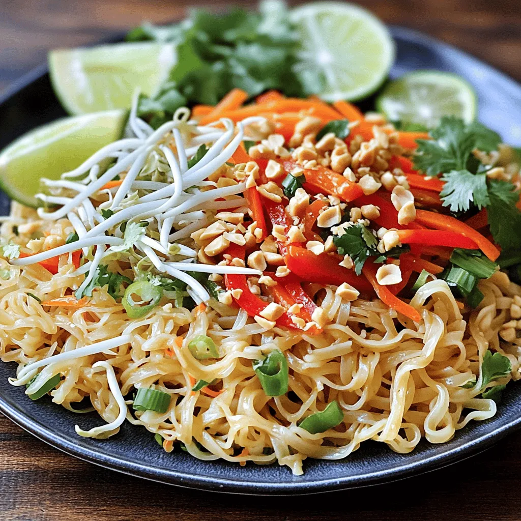 for more details! Start by cooking the rice noodles. Follow the package instructions. Make sure to cook them until they are al dente. This means they should have a slight bite. After cooking, drain the noodles and place them in a large bowl. Set them aside as you prepare the other ingredients. For the best texture, rinse the noodles with cold water. This helps stop the cooking process and keeps them from sticking together. In a large frying pan or wok, heat the vegetable oil over medium heat. First, add the minced garlic and sliced onion. Sauté them for about 2-3 minutes. You want the onion to become translucent and fragrant. Next, add the sliced red bell pepper and julienned carrot. Stir-fry these veggies for about 3-4 minutes. You want them to soften but still have some crunch. This adds great texture to your dish. If you want to use eggs, push the veggie mix to one side of the pan. Crack the eggs into the open space and scramble them. Cook until they are fully set. Once cooked, mix the eggs back into the veggie blend. Now, carefully add the cooked rice noodles to the pan. Gently toss everything together to combine it well. In a small bowl, mix the soy sauce, lime juice, and brown sugar. Pour this sauce over the noodle mixture and stir well. Cook for another 2-3 minutes to let the flavors meld. Finally, add fresh bean sprouts and chopped green onions. Cook for just one more minute. Your Easy Veggie Pad Thai is ready to serve hot, garnished with crushed peanuts and fresh cilantro. Enjoy it with lime wedges on the side for extra flavor! Fresh ingredients make all the difference in Easy Veggie Pad Thai. Use crisp vegetables for the best taste. Look for bright bell peppers, firm carrots, and fresh bean sprouts. The right soy sauce also boosts flavor. I prefer low-sodium soy sauce, which adds depth without too much salt. You can also try tamari for a gluten-free option. Stir-frying is key for this dish. Heat your pan well before adding oil to avoid sticking. Keep the heat high, and don’t overcrowd the pan. This helps all the veggies cook evenly and stay crunchy. Stir-fry each type of veggie separately if you want to control their doneness. Add them back together later for the best texture. How you serve your Pad Thai can make it more fun. Use a large plate or bowl to show off those colorful veggies. You can also layer your ingredients for a nice look. Pair it with spring rolls or a fresh salad to round out the meal. For drinks, a light iced tea or lemonade works great with this dish. For the full recipe, visit the Easy Veggie Pad Thai section. {{image_4}} To make this dish vegan, simply skip the eggs. You can add plant-based proteins instead. Tofu works well and adds great texture. Tempeh is another tasty choice. Both options soak up flavor and make your meal filling. If you don’t have all the ingredients, don’t worry. You can swap in what you have. For example, use zucchini instead of carrots. Snap peas can replace bell peppers. In winter, try adding Brussels sprouts or kale for a seasonal touch. Do you like heat? To make your Pad Thai spicier, add red pepper flakes or Sriracha. Start with a little, then taste as you go. If you prefer a milder dish, reduce the soy sauce. You can also add more lime juice for a zesty flavor without spice. For the full recipe, check out Easy Veggie Pad Thai. To keep your Easy Veggie Pad Thai fresh, let it cool first. Spread it out in a shallow dish. This helps the heat escape quickly. Avoid stacking it in a deep bowl. When it cools to room temperature, cover it tightly. Use plastic wrap or a lid. This keeps it from drying out. In the fridge, your Pad Thai lasts about 3-4 days. Make sure it is in an airtight container. For longer storage, you can freeze it. It stays good for about 1-2 months. To freeze, place it in freezer bags. Remove as much air as possible before sealing. When you're ready to eat, just thaw it overnight in the fridge. When reheating, I recommend using a pan or a wok. This helps keep the noodles from getting mushy. Add a splash of water or soy sauce to keep it moist. Heat on medium, stirring gently. You can also use a microwave, but do it in short bursts. Stir between heating to keep it even. This way, your Easy Veggie Pad Thai stays tasty and enjoyable! Many people make a few mistakes when making Pad Thai. First, overcooking the rice noodles is common. They should be al dente, not mushy. Second, using too much sauce can make the dish too salty. Start with a small amount and taste as you go. Lastly, don’t forget to use fresh vegetables. They add crunch and color, making your dish vibrant and healthy. Yes, you can make Easy Veggie Pad Thai ahead of time. Cook the noodles and veggies, then store them separately. You can mix them with sauce when you are ready to serve. This helps keep everything fresh and tasty. Just reheat in a pan on low heat until warm. You can serve Easy Veggie Pad Thai with many sides. Try spring rolls for a crunchy treat. A light cucumber salad adds freshness. If you want more protein, add tofu or edamame on the side. You can also serve it with a refreshing drink, like iced tea or lemonade. To make Easy Veggie Pad Thai gluten-free, use gluten-free soy sauce. Most rice noodles are gluten-free, but check the package to be sure. This way, everyone can enjoy this tasty dish without worry. Customizing Easy Veggie Pad Thai is easy. If someone doesn’t like a veggie, swap it for one they enjoy. You can also adjust the sauce to suit their taste. Start with less sauce, then add more later. If they don’t want eggs, skip them. This dish is flexible, so everyone can love it! Easy Veggie Pad Thai is a fun and tasty dish. You learned the key ingredients like rice noodles and fresh veggies. We went through the steps to make it right, from cooking noodles to sautéing vegetables. I shared tips to boost flavors and ideas for serving it up. You can even explore variations to suit your taste. In conclusion, this recipe is flexib