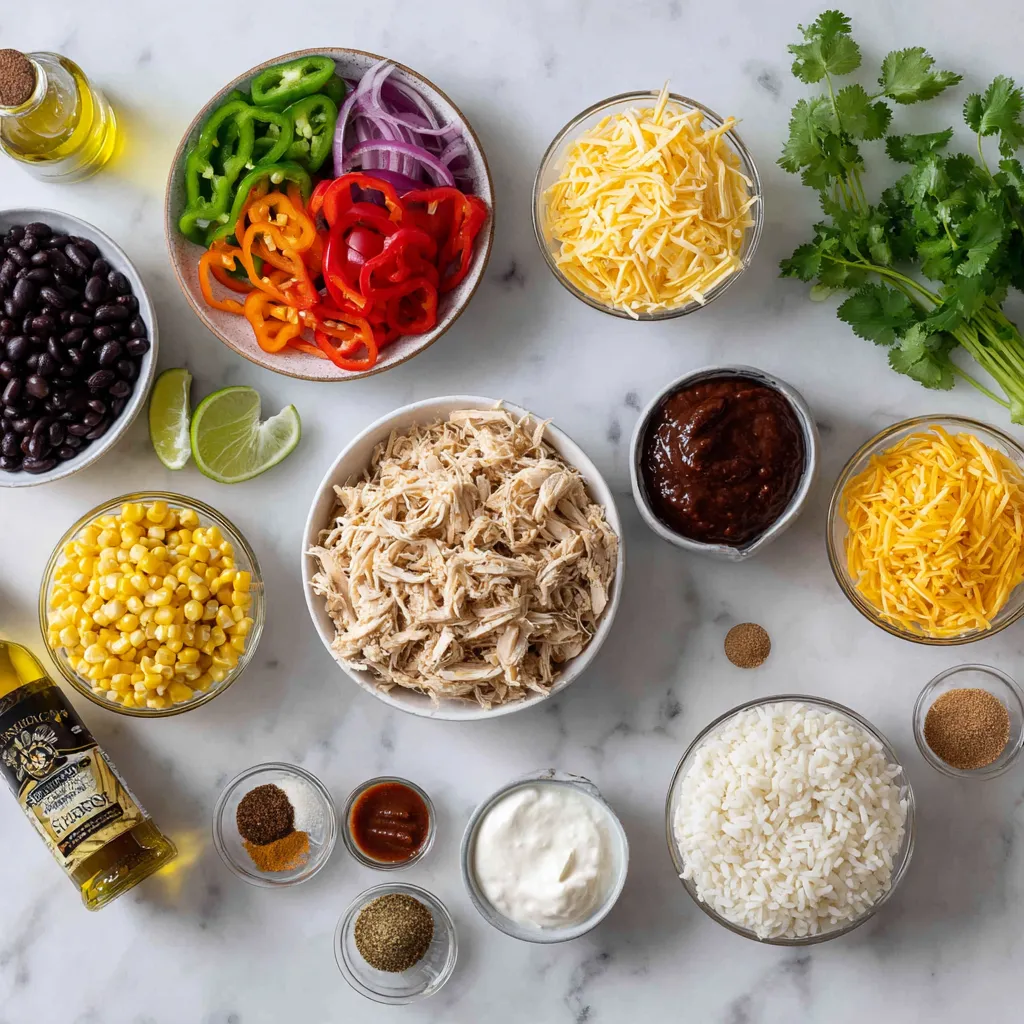 – Combine Ingredients: In a big bowl, mix 2 cups of shredded cooked chicken, the sautéed veggies, 2 cups of cooked brown rice, 1 can of rinsed black beans, 1 cup of corn, and 1 cup of salsa. Add 1 teaspoon of ground cumin, 1 teaspoon of chili powder, 1/2 teaspoon of garlic powder, and 1/2 teaspoon of onion powder. Stir until everything is well mixed and coated.