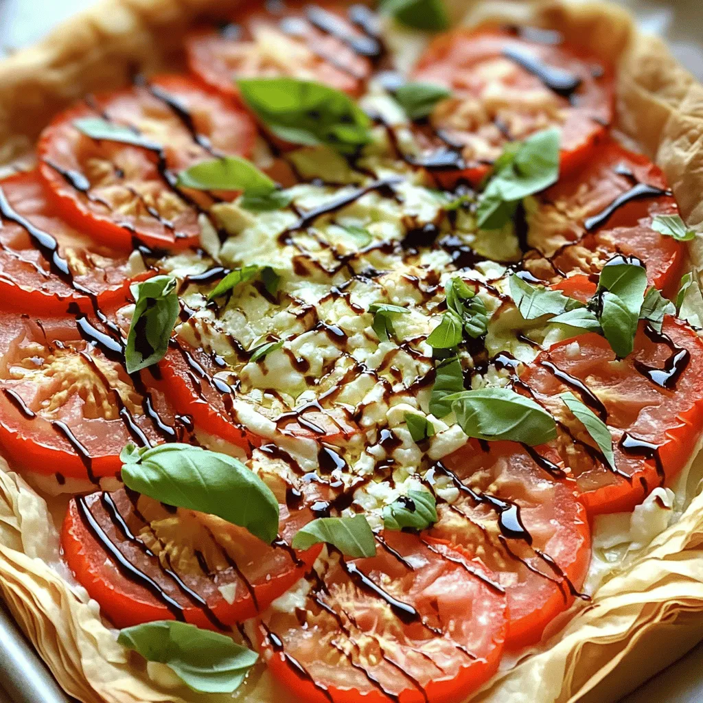 ![- 1 pre-made phyllo pastry sheet (about 8-10 sheets) or one ready-made pie crust - 4 medium ripe tomatoes, thinly sliced - 1 cup fresh basil leaves, roughly chopped - 1 cup ricotta cheese - 1 cup shredded mozzarella cheese - 2 tablespoons extra virgin olive oil, plus additional for brushing - 1 teaspoon garlic powder - Salt and freshly cracked black pepper to taste - Optional: Balsamic glaze for drizzling When I create this fresh tomato basil tart, I love to use simple, fresh ingredients. The star is the ripe tomatoes. They bring bright flavor and juicy texture. I choose tomatoes that are firm but not hard. Their color should be vibrant. Basil is another key player. Fresh basil adds a sweet and peppery taste. I prefer to roughly chop it to release its oils. This way, every slice of the tart bursts with flavor. For creaminess, I use ricotta cheese. It adds a rich and smooth layer. I mix it with garlic powder, salt, and pepper. This mix gives a nice seasoning base. Next, mozzarella cheese adds a lovely stretch. It melts beautifully and gives that gooey texture we crave. Together, they make the tart creamy and savory. I also use extra virgin olive oil. It not only adds flavor but helps the crust brown nicely. A drizzle before baking makes a big difference. Lastly, I sometimes add balsamic glaze. It gives a sweet and tangy touch. It’s optional, but I find it elevates the dish. Each ingredient plays a role in making this tart special. When you gather these items, you set the stage for a delightful meal. Check out the [Full Recipe] for a step-by-step guide to bring this tart to life! 1. Preheating the oven Start by preheating your oven to 375°F (190°C). This step is key to getting a nice, crispy crust. 2. Preparing the pastry If using phyllo pastry, layer 4-5 sheets in a tart pan. Brush a thin layer of olive oil between each sheet. This adds flavor and helps create a crunchy texture. If you opt for a pie crust, just place it in the tart pan and crimp the edges for a nice look. 3. Making the ricotta mixture In a mixing bowl, combine ricotta cheese, garlic powder, salt, and pepper. Use a spatula to mix until smooth. This mixture adds creaminess to the tart. 1. Layering tomatoes and cheese Spread the ricotta mixture evenly over the crust. Then, layer the sliced tomatoes on top. Overlap the slices slightly for a pretty design. After the tomatoes, sprinkle shredded mozzarella cheese over them. Finally, add the chopped basil for a fresh taste. 2. Drizzling olive oil Drizzle the remaining olive oil over the top of the tart. This helps the tart brown nicely and boosts flavor. 1. Baking duration and tips Place the tart in your preheated oven. Bake for 25-30 minutes. Look for a golden brown crust and bubbly cheese. This means it’s nearly ready! 2. Cooling period before slicing Once baked, remove the tart from the oven. Let it cool on a wire rack for a few minutes. This cooling time helps set the filling, making slicing easier. Check out the Full Recipe to get all the details you need! For the best results, set your oven to 375°F (190°C). This temperature helps the tart cook evenly and creates a nice, crisp crust. To check for doneness, look for a golden-brown crust and bubbly cheese. The cheese should be slightly browned, adding flavor and texture. If you see these signs, your tart is ready! Garnishing makes your dish pop. Slice the tart into wedges and serve on a rustic wooden board. Add fresh basil leaves on top for a vibrant touch. You can also drizzle balsamic glaze over the tart right before serving. It adds a sweet and tangy flavor that enhances the dish. One mistake is ending up with a soggy crust. To prevent this, always brush the pastry with olive oil or egg wash before adding toppings. Another common issue is uneven cheese melting. Spread the cheese evenly and avoid overloading one side. This ensures every bite is cheesy and delicious. {{image_4}} To make your Fresh Tomato Basil Tart even more exciting, try using different cheeses. Instead of ricotta, you can use goat cheese or feta. Both add a unique tang. For mozzarella, consider using provolone or a sharp cheddar. These swaps change the taste while keeping it delicious. You can also play with herbs and spices. Instead of basil, use fresh oregano or thyme for a new flavor. A pinch of red pepper flakes can add a little heat. Just remember, keep the balance so it doesn't overpower the fresh tomatoes. Seasonal vegetables can enhance your tart. In summer, add zucchini or bell peppers for a colorful twist. In fall, roasted butternut squash works well. These veggies bring new flavors and textures to your dish. Don't shy away from incorporating different flavors. For instance, a sprinkle of smoked paprika gives a lovely depth. You could even add sun-dried tomatoes for a rich, sweet touch. These tweaks keep the tart fresh and exciting all year round. If you need vegan or gluten-free options, it’s easy to adapt. For a vegan tart, swap the cheeses for cashew cream or tofu. These provide creaminess without dairy. Use gluten-free pie crust or phyllo pastry for a gluten-free option. These variations allow everyone to enjoy this dish. You can create a tart that fits any diet without losing flavor. Check out the Full Recipe for more ideas! To keep your fresh tomato basil tart tasty, store leftovers properly. First, let the tart cool completely. Wrap it in plastic wrap or place it in an airtight container. This helps keep flavors and moisture in. If you prefer, you can also use aluminum foil for wrapping. Store it in the fridge for up to three days for the best taste. When ready to enjoy your leftover tart, preheat your oven to 350°F (175°C). Place the sliced tart on a baking sheet for even heating. Bake for about 10-15 minutes until it's warm. This method keeps the crust crisp and the cheese melty. To avoid sogginess, don’t microwave it. Microwaving can make the crust soft and chewy, which isn’t ideal. Enjoy your delicious tart again! To 