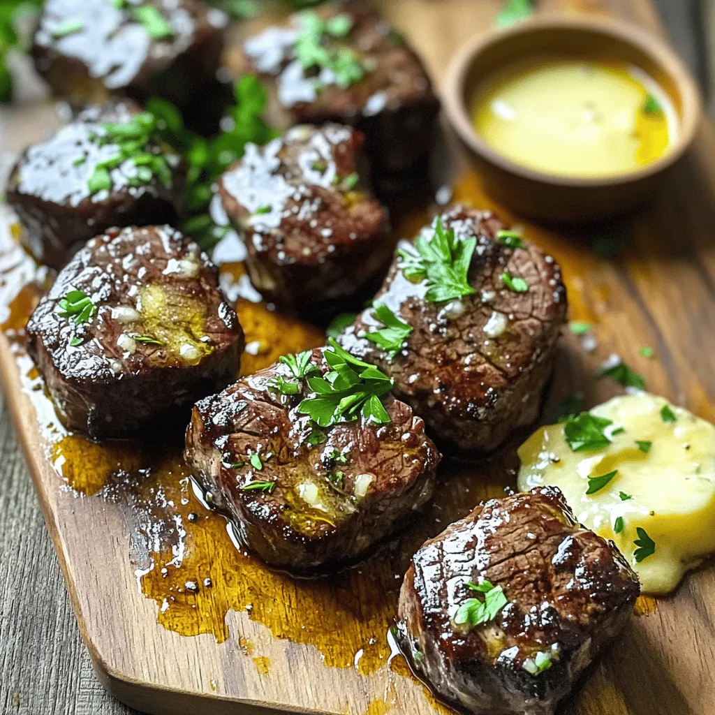 Lower the heat to medium. Add the remaining 2 tablespoons of butter into the skillet. Once it melts, stir in the minced garlic, rosemary, and thyme. Sauté this mix for 1-2 minutes until the garlic smells great. Then, add the steak bites back to the skillet. Toss them in the garlic butter for about a minute. This coats them in flavor and warms them up. Finally, take the skillet off the heat and serve the steak bites on a platter. Top with fresh parsley for extra color and taste.