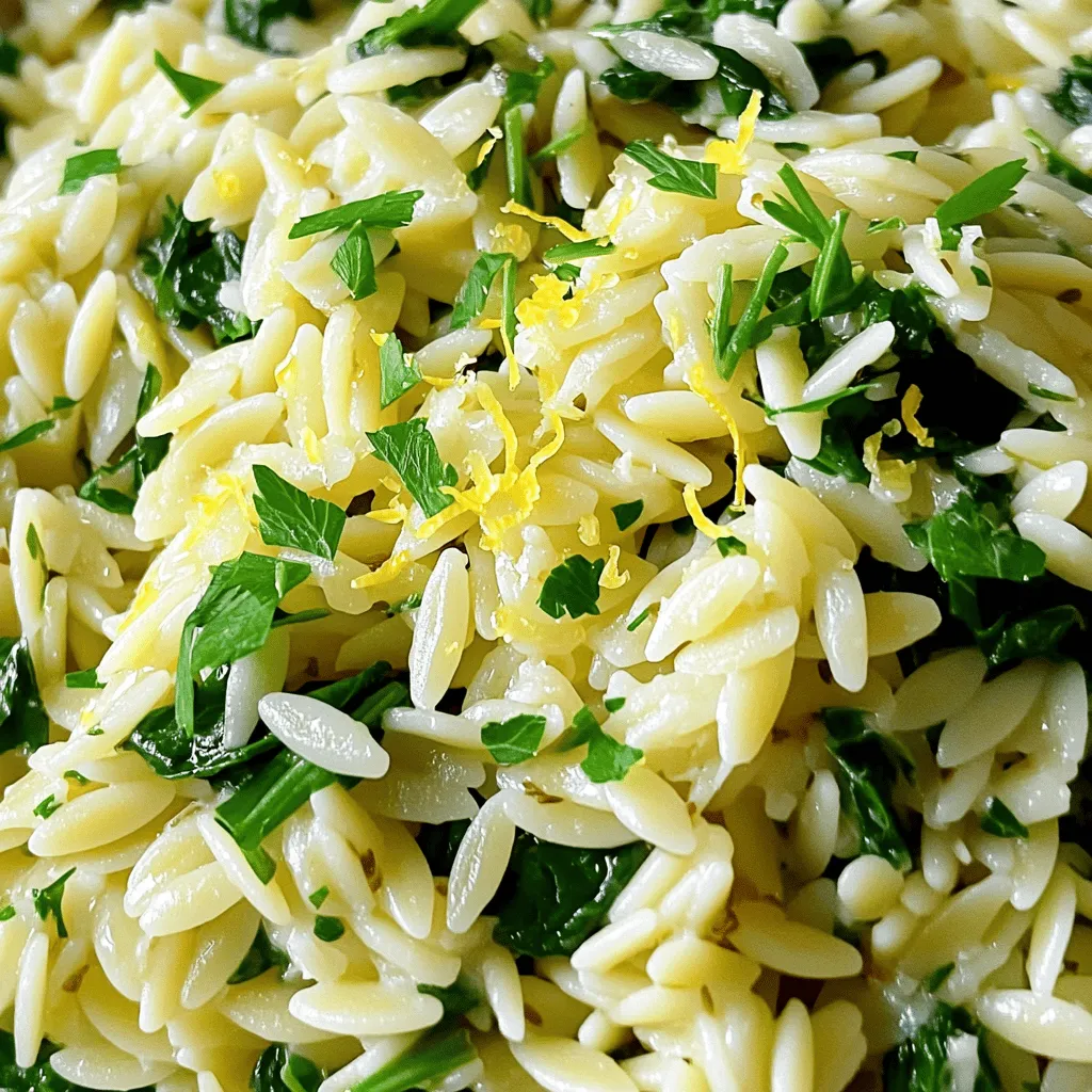 The star of this dish is orzo pasta. It’s small and cooks fast. I love how it soaks up flavors. The extra virgin olive oil adds a rich taste. Garlic is key here too; it brings a warm aroma. I prefer fresh garlic, as it packs a punch. The vegetable broth makes this dish savory and adds depth. Fresh spinach gives color and nutrients. Parmesan cheese gives that creamy finish. Lemon zest brightens everything up. A dash of salt and pepper helps balance the flavors.