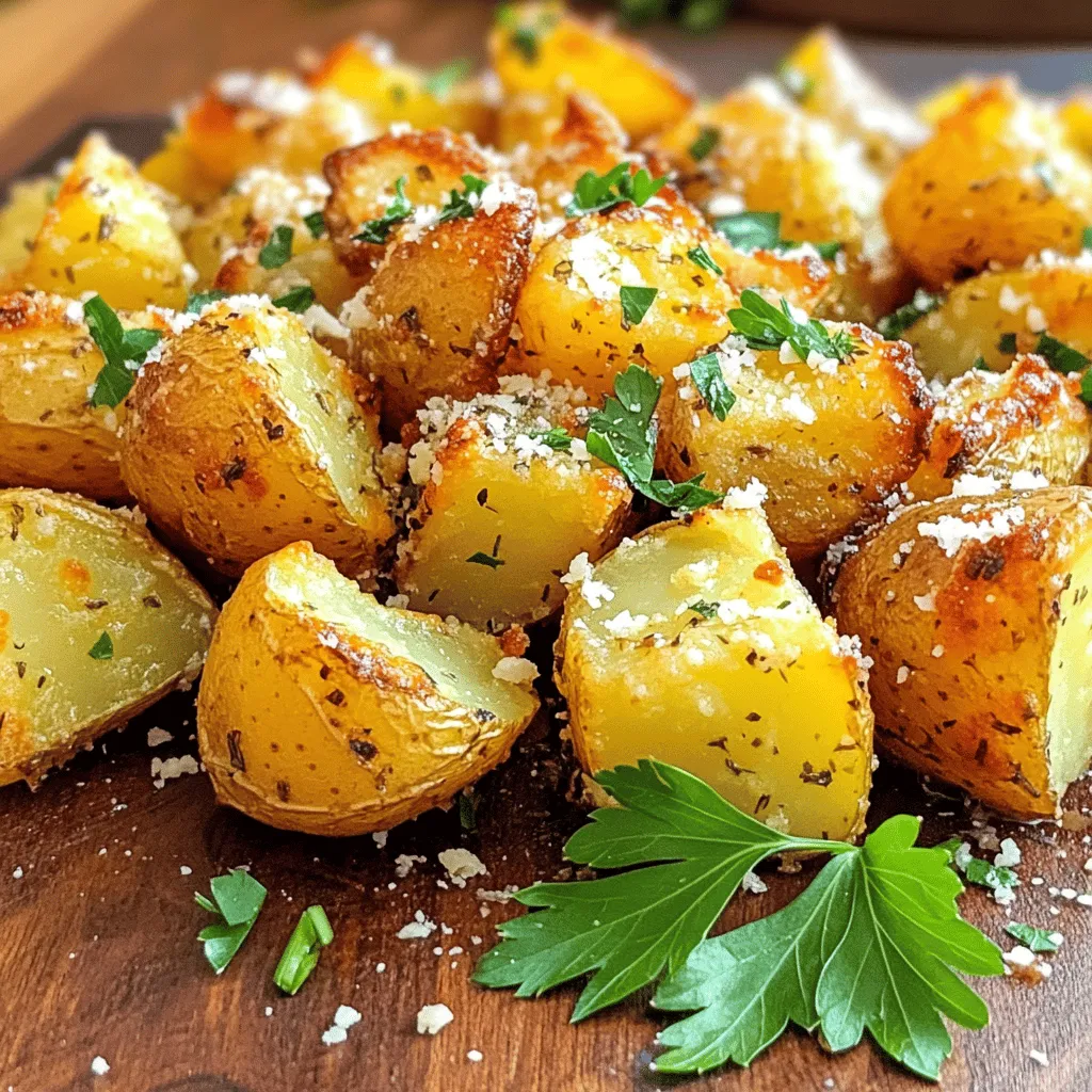 ![- 2 pounds baby Yukon gold potatoes - 4 tablespoons extra-virgin olive oil - 4 cloves garlic, finely minced To start, gather your primary ingredients. Baby Yukon gold potatoes taste great and roast well. The olive oil keeps everything moist and smooth. Garlic adds a bold flavor that makes these potatoes shine. - 1/2 cup freshly grated Parmesan cheese - 1 teaspoon dried Italian herbs - Salt and freshly ground black pepper Next, we need to season our potatoes. Freshly grated Parmesan cheese gives a rich, cheesy taste. Italian herbs, like oregano and basil, add a nice touch. Don’t forget to season with salt and black pepper for balance. - 2 tablespoons fresh parsley, finely chopped Lastly, for a pop of color and freshness, use chopped parsley. It brightens the dish and makes it more appealing. You can find the Full Recipe online to get all the details and cooking steps. - Preheat the oven to 425°F (220°C). - Prepare the baking sheet with parchment paper. First, I make sure my oven is hot. Preheating helps the potatoes cook evenly. Lining the baking sheet with parchment paper makes cleaning easier. It also helps the potatoes not stick. - Combine the potatoes with olive oil and seasonings. - Toss to coat the potatoes evenly. Next, I grab a large bowl. I add the halved baby Yukon gold potatoes. Then, I pour in the extra-virgin olive oil and minced garlic. I also add dried Italian herbs, salt, and pepper. This mix gives the potatoes their flavor. I toss everything until each piece is coated well. - Arrange the potatoes on the baking sheet. - Initial roasting and adding Parmesan cheese. - Final roasting until crispy and golden. Now, I spread the seasoned potatoes on the baking sheet. I make sure they have space between them. This helps them roast, getting crispy on the outside. I place the sheet in the oven for about 20 minutes. After that, I take it out and sprinkle Parmesan cheese on top. I put it back in the oven for another 15-20 minutes. I want the potatoes golden brown and crispy. When they are done, I take them out and sprinkle fresh parsley on top for color. You can find the full recipe in the previous section. To ensure even seasoning, always mix your ingredients well. When you combine the potatoes with olive oil and spices, make sure every piece gets coated. This step is key for flavor. Next, place the potatoes on the baking sheet with space between them. This spacing helps them roast evenly and get crispy. If they touch, they might steam instead of roast. For golden brown potatoes, roast them at a high temperature. I recommend 425°F (220°C). This heat gives the potatoes that nice crunch you want. Halfway through cooking, check them. If they look brown, they are getting close to being done. You can adjust the time based on your oven. When serving, think about the dish you use. A rustic wooden bowl adds a cozy touch. You can also use a decorative platter for a nice presentation. For garnish, sprinkle fresh parsley on top. This adds color and a fresh taste. Consider pairing these potatoes with grilled chicken or steak for a complete meal. They also go well with a fresh salad! For more detailed steps, check out the Full Recipe. {{image_4}} You can make Garlic Parmesan Roasted Potatoes even tastier. Adding fresh herbs like rosemary or thyme boosts flavor. They add a nice, earthy note. You can also infuse your potatoes with a bit of lemon zest. This gives a bright, fresh taste. Red pepper flakes can add a spicy kick. Just a pinch can make a big difference. If you want variety, try different cheeses. Cheddar or gouda can work well too. Each cheese brings a unique flavor. For a vegan option, use nutritional yeast. It has a cheesy flavor and is a great substitute for Parmesan. Cashew cheese is another tasty choice. You don’t have to stick with Yukon gold potatoes. Try red or fingerling potatoes for a new twist. They have different textures and flavors. Sweet potatoes are a fun alternative too. They add sweetness and a vibrant color to the dish. Each type of potato can change the taste and look of your meal. For the full recipe, check out the [Full Recipe]. To store leftover Garlic Parmesan Roasted Potatoes, let them cool first. Place them in an airtight container. You can keep them in the fridge for up to four days. When you want to reheat, use the oven or air fryer for best results. This keeps them crispy. Heat at 350°F (175°C) for about 10-15 minutes. Yes, you can freeze Garlic Parmesan Roasted Potatoes. To do this, let them cool completely. Spread them on a baking sheet and freeze for a few hours. Once frozen, transfer them to a freezer bag. This helps prevent them from sticking together. When you're ready to eat, thaw them overnight in the fridge. Reheat in the oven for best texture. Leftovers last about four days in the fridge. Check for signs of spoilage, like a bad smell or slimy texture. If you notice these signs, it’s best to throw them away. Enjoy your tasty Garlic Parmesan Roasted Potatoes while they're fresh! For the complete recipe, check the Full Recipe. Yes, you can make Garlic Parmesan Roasted Potatoes ahead of time. Cook the potatoes fully and let them cool. Then, place them in an airtight container. Store them in the fridge for up to three days. When you are ready to eat, reheat them in the oven. This method keeps them crispy. You can also prepare and season the potatoes a day before. Just wait to roast them until you are ready. Garlic Parmesan Roasted Potatoes pair well with many dishes. Here are some great options: - Grilled chicken - Roasted vegetables - Steak or pork chops - A fresh green salad These sides enhance the meal and add more flavor to your plate. To achieve that perfect crispy texture, follow these tips: - Use baby Yukon gold potatoes, as they roast well. - Make sure to space the potatoes on the baking sheet. This allows hot air to circulate. - Toss them in olive oil and seasonings before roasting. - Roast at a high temperature, around 425°F (220