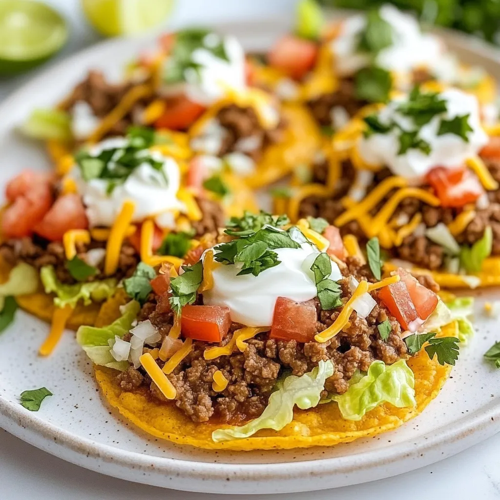 - 1 lb ground beef - 1 small onion, finely chopped - 2 cloves garlic, minced - 1 tablespoon chili powder - 1 teaspoon ground cumin - ½ teaspoon smoked paprika - Salt and freshly cracked black pepper to taste - 1 cup shredded romaine lettuce - 1 cup ripe tomatoes, diced - 1 cup shredded cheese (cheddar or a Mexican blend) - ½ cup sour cream - 8 tostada shells - 1 cup creamy refried beans - ¼ cup fresh cilantro, chopped - Lime wedges for serving To make these tostadas, gather all the main ingredients. Start with the ground beef, which gives a hearty flavor. Chop the onion and garlic finely. These two add a great base to the dish. Make sure you have your spices ready. Chili powder, cumin, and smoked paprika add depth and warmth. Next, get the toppings. Shredded romaine lettuce provides a nice crunch. Diced tomatoes brighten up the dish. Use shredded cheese for creaminess, and don’t forget the cool sour cream. Cilantro adds a fresh touch, while lime wedges give a zesty kick when squeezed on top. Now, you are ready to create a delicious meal that everyone will love! {{ingredient_image_2}} 1. Heat a large skillet over medium heat. Add a drizzle of cooking oil. 2. Add the finely chopped onion and minced garlic. Sauté until they are translucent, about 2-3 minutes. 3. Increase the heat to medium-high. Add the ground beef to the skillet. 4. Use a wooden spoon to break the meat into smaller pieces. Cook until the beef is browned, about 5-7 minutes. 5. Stir in the chili powder, ground cumin, smoked paprika, salt, and pepper. Cook for an additional 5 minutes. This helps the spices blend well with the meat. 1. Take your tostada shells and spread a layer of creamy refried beans on each one. 2. Spoon the cooked ground beef mixture over the beans evenly. 3. Add fresh shredded romaine lettuce and diced tomatoes on top of the beef. 4. Sprinkle a generous amount of shredded cheese over the veggies. 5. Top it all with a dollop of cool sour cream. 6. Finish each tostada with a sprinkle of fresh chopped cilantro for a burst of color. 7. Serve immediately with lime wedges on the side for added zest. These tostadas are not just tasty; they also look great! Arrange them on a platter for a fun meal. To achieve perfectly browned ground beef, start with a hot skillet. Heat a little oil in your pan, then add chopped onion and minced garlic. Sauté these until they soften and smell great, about 2-3 minutes. Next, raise the heat to medium-high. Add the ground beef, breaking it up with a wooden spoon. Cook until the beef turns a deep brown and is no longer pink, about 5-7 minutes. Stir often to cook evenly. For the best flavor, season the beef well. After browning, add chili powder, cumin, and smoked paprika. Sprinkle salt and pepper as needed. Cook for another 5 minutes to let the spices blend in. This step packs your beef with taste. Garnishing your tostadas makes them look great and inviting. Start by arranging them on a large platter. Use fresh cilantro leaves for a pop of color on top. Serve lime wedges in a small bowl at the center of the platter. This adds a bright touch and lets everyone squeeze lime on their tostadas. It's a small detail that gives big flavor. Pro Tips Perfectly Seasoned Beef: Always taste your ground beef mixture before serving. Adjust the seasoning with more salt, pepper, or spices to suit your preference. Crunchy Shells: For an extra crunch, bake the tostada shells in the oven at 375°F (190°C) for 5-7 minutes before assembling the toppings. Fresh Toppings: Use fresh ingredients for toppings like lettuce and tomatoes to enhance the flavor and texture of the tostadas. Customize with Extras: Feel free to add additional toppings like sliced jalapeños, avocado, or different types of cheese for a personalized touch. {{image_4}} You can easily change up the protein in your tostadas. Try using ground turkey or chicken for a lighter option. If you prefer a plant-based meal, go for lentils or crumbled tofu. These swaps will keep your tostadas tasty and fun. For cheese, you don’t have to stick to just one type. Use pepper jack for a spicy kick or a creamy queso fresco for a milder taste. Each cheese gives a unique flavor and texture to your dish. To boost the flavors in your tostadas, consider adding sliced jalapeños or a scoop of guacamole. Both options bring extra heat and creaminess. If you love fresh ingredients, top your tostadas with diced avocado or corn salsa. These toppings add a fresh touch and make your meal even more colorful. Explore different combinations to find what you love most! Each variation can make your tostadas a new experience every time you cook them. Store assembled tostadas carefully. Place any leftover tostadas in an airtight container. Keep the toppings separate to maintain their freshness. For best taste, use them within two days. - Tostada shells: Keep in a cool, dry place. They stay crisp for longer. - Ground beef: Store in a sealed container in the fridge. This keeps it flavorful. - Fresh toppings: Use separate containers for lettuce, tomatoes, and cheese. This helps avoid sogginess. Reheat tostadas carefully to keep them crunchy. The best way is to use an oven or toaster oven. Preheat it to 350°F (175°C). - Oven method: Place tostadas on a baking sheet. Heat for about 10 minutes until warm. - Microwave method: Heat for a few seconds, but this may make them soggy. To maintain crunchiness, avoid covering them while reheating. You want that perfect crisp! How do I make tostadas crispy? To make tostadas crispy, bake them in the oven. Preheat the oven to 400°F (200°C). Place the tostada shells on a baking sheet. Bake for about 5-7 minutes, until they are golden and crunchy. You can also fry them in hot oil for a few seconds per side. This gives them a great texture. Can I use a different protein instead of ground beef? Yes, you can use other proteins. Ground turkey or chicken works well. You can also try plant-based options like lentils or black beans for a 