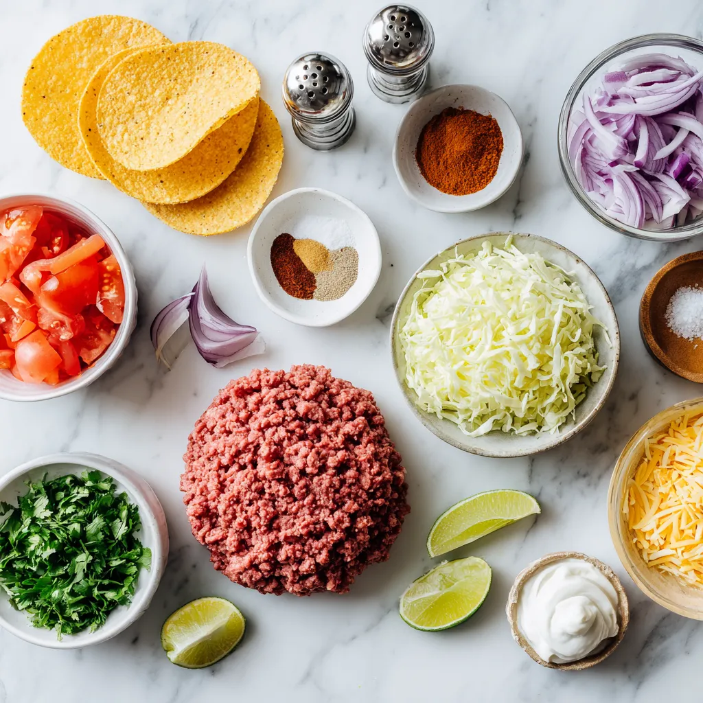 To make these tostadas, gather all the main ingredients. Start with the ground beef, which gives a hearty flavor. Chop the onion and garlic finely. These two add a great base to the dish. Make sure you have your spices ready. Chili powder, cumin, and smoked paprika add depth and warmth.
