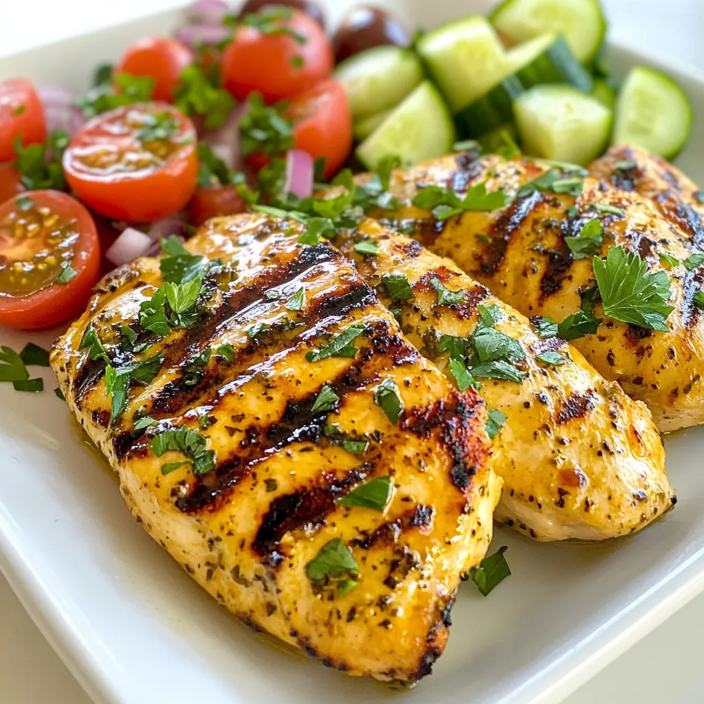 - Slice the grilled chicken into strips and arrange it beautifully on a serving platter. Serve the vibrant Mediterranean salad alongside the chicken. Drizzle any remaining marinade over the dish for an extra burst of flavor.