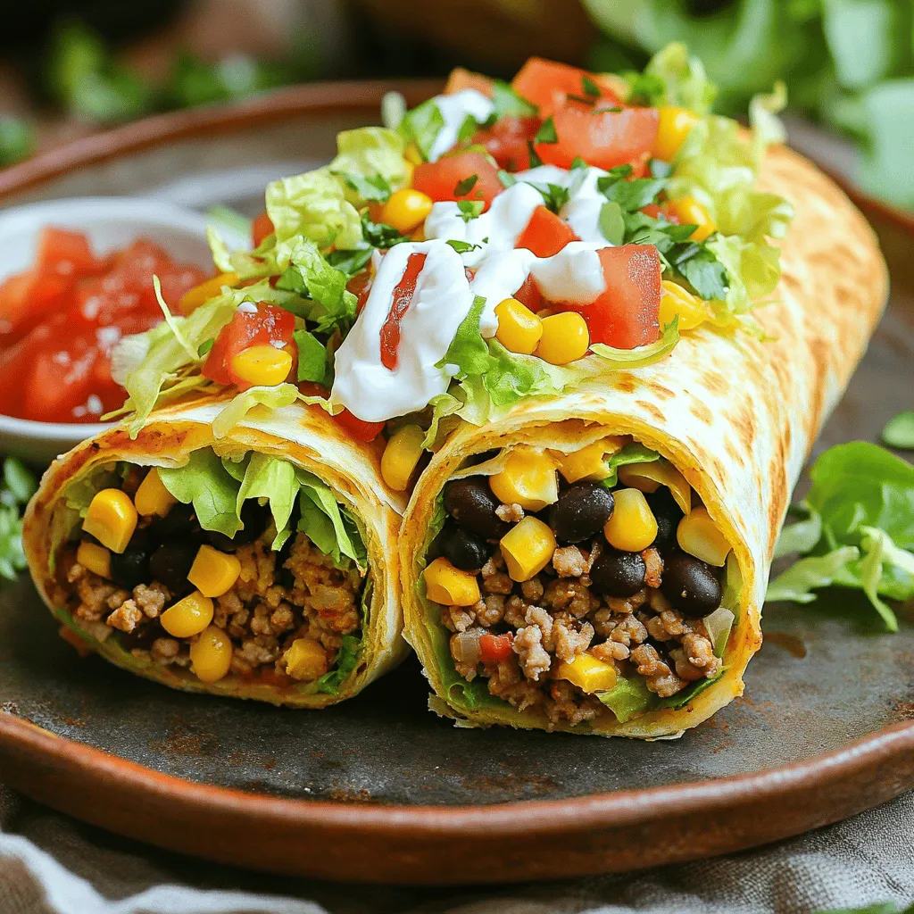 ![To make the Homemade Crunchwrap Supreme, gather these items: - 1 lb ground turkey or beef - 1 packet of taco seasoning - 1 cup black beans, drained and rinsed - 1 cup corn kernels (fresh or frozen) - 1 cup shredded cheddar cheese - 1 cup lettuce, finely shredded - 1 large tomato, diced - ½ cup sour cream - 4 large flour tortillas - 4 small tostada shells - 1 tablespoon olive oil - Salsa for serving Each Crunchwrap has around 500 calories. It includes protein from the meat and beans. The cheese adds calcium but also fat. Fresh veggies bring fiber and vitamins. If you want to cut calories, use less cheese or sour cream. This recipe feeds four, perfect for a family meal or a fun gathering. You can swap ground turkey for chicken or even tofu for a veggie option. Use black beans or pinto beans based on your taste. For cheese, try pepper jack for some heat. If you need a gluten-free option, use corn tortillas instead of flour. You can also replace sour cream with Greek yogurt for a healthier twist. Enjoy making it your own! Making a Homemade Crunchwrap Supreme is fun and easy. You start by cooking the meat. Then, you mix it with beans, corn, and cheese. Next, you assemble the wrap with layers of toppings. Finally, you cook the wrap until it’s crispy and golden. 1. Brown the Meat: Heat 1 tablespoon of olive oil in a skillet. Add 1 lb of ground turkey or beef. Cook it for 5-7 minutes until it’s browned. 2. Season the Meat: Drain any extra grease. Add 1 packet of taco seasoning. If needed, splash in some water. Cook for another 2-3 minutes. 3. Combine Ingredients: In a bowl, mix the seasoned meat with 1 cup of black beans, 1 cup of corn, and half of 1 cup of shredded cheese. Stir well. 4. Prepare the Tortilla: Lay out 1 large flour tortilla on a flat surface. 5. Assemble the Crunchwrap: Spoon the meat and bean mix into the center. Leave about 2 inches of space from the edges. 6. Add Tostada and Toppings: Place 1 small tostada shell on top of the mixture. Spread ½ cup of sour cream over the tostada. Add 1 cup of shredded lettuce, 1 diced tomato, and the rest of the cheese. 7. Fold the Crunchwrap: Fold the edges of the tortilla over the filling. Make pleats around the edge until it’s all enclosed. 8. Cook the Crunchwrap: Heat a non-stick skillet on medium heat. Place the crunchwrap seam-side down. Cook for 2-3 minutes until golden, then flip it and cook for another 2-3 minutes. 9. Serve: Cut each crunchwrap in half. Serve warm with salsa on the side. While I can't show pictures, I recommend you take photos of each step. It can help you track your progress. You can also find great visual aids in the [Full Recipe]. They can guide you through the cooking process with ease! To get that perfect crunchwrap texture, you want a good balance. Start with a large flour tortilla. This gives you room to fold. Use a small tostada shell inside. This will add a nice crunch. When you cook it, make sure your skillet is hot. A hot skillet helps create a nice, crispy outside. Flip it gently to avoid spills. Let it brown evenly on both sides for the best result. Flavorful meat is key to a great crunchwrap. I like to use ground turkey or beef. Sauté it in olive oil until browned. After that, add taco seasoning. This is where the magic happens. Follow the packet instructions for best results. If the meat seems dry, add a splash of water. This helps the seasonings stick and blend. Mix in black beans and corn for added taste and texture. Making ahead can save you time. You can prepare the meat mixture a day before. Just store it in an airtight container. When you are ready, assemble your crunchwraps. This way, you can enjoy a fresh meal with less work. You can also freeze the assembled crunchwraps. Just make sure to wrap them well. When you are ready to eat, heat them up in the skillet. This keeps them nice and crispy. For more details, check the Full Recipe. {{image_4}} You can easily make a tasty veggie crunchwrap. Just replace the meat with veggies. Use a mix of black beans, corn, and diced peppers. You can add mushrooms for a nice texture. To keep it creamy, use extra sour cream or a plant-based option. This way, you get all the flavor without meat! Want to spice things up? Add some jalapeños to the filling. You can use fresh slices or pickled ones. If you like heat, toss in some hot sauce or pepper flakes. A dash of chipotle seasoning in the meat gives a smoky kick. This adds a new level of flavor! Don’t stick to just one topping. Try different sauces like guacamole or zesty salsa. You can also add sliced olives or diced onions for crunch. Consider using different cheeses, like pepper jack, for extra flavor. Mix and match to create your perfect crunchwrap. For the full recipe, check out the Ultimate Crunchwrap Supreme. To keep your leftover Crunchwrap Supreme fresh, wrap it tightly in plastic wrap or foil. Place it in an airtight container. This way, it stays safe from air and moisture. Store it in the fridge for up to three days. To enjoy it later, make sure you don’t leave it out too long. Reheating your Crunchwrap is easy. Start by taking it out of the fridge. Place it in a skillet over medium heat. Cover it with a lid. Heat for about 3-4 minutes on each side. This method keeps it crispy. You can also use the microwave if you're in a hurry. Just place it on a microwave-safe plate. Heat it for about 1-2 minutes until warm. If you want to save your Crunchwrap for later, freezing is a great option. Wrap each Crunchwrap in plastic wrap, then in foil. This helps protect it from freezer burn. You can freeze them for up to three months. When you’re ready to eat, let it thaw in the fridge overnight. Then, reheat it as described above. Enjoy your homemade Crunchwrap Supreme whenever you crave it! For the full recipe, check out the Ultimate Crunchwrap Supreme . To make your Crunchwrap Supreme gluten-free, use gluten-free tortillas. You can find them at most grocery stores. Make sure the taco seasoning is al