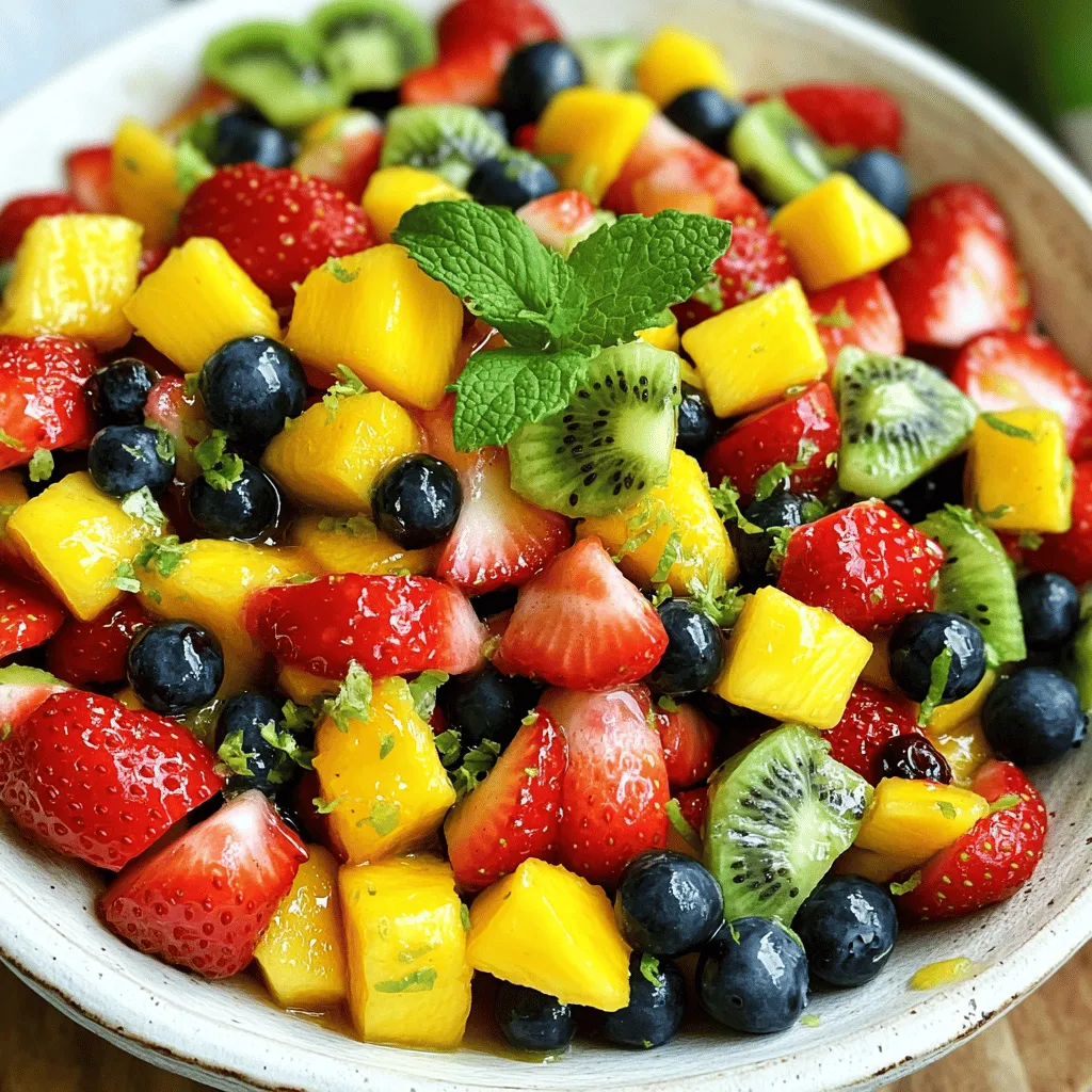 ![- Strawberries - Blueberries - Kiwi - Mango - Pineapple When making honey lime fruit salad, choose bright and fresh fruits. Fresh strawberries add sweetness, while blueberries offer a burst of flavor. Kiwi adds a tangy kick, and mango brings a tropical twist. Pineapple adds juicy texture and sweetness. Each fruit shines in this salad. - Pure honey - Freshly squeezed lime juice - Lime zest The honey and lime mixture brightens the salad. Use pure honey for a rich flavor. Fresh lime juice offers a zesty taste, and lime zest adds a fragrant note. Mix these ingredients well to create a smooth dressing. This blend enhances the fruits and ties everything together. - Fresh mint leaves for decoration Fresh mint leaves add a pop of color and a refreshing aroma. They make the salad look beautiful and inviting. Just sprinkle them on top before serving. This final touch makes the dish feel special and fun. For the full recipe, check out the details above. Start by cleaning the fruits well. Rinse strawberries in cold water and hull them. Slice them into thin pieces. For blueberries, just rinse them off and set them aside. Peel the kiwi and dice it into small chunks. Next, peel the mango and cut it into cubes. Finally, chop the pineapple into bite-sized pieces. Using fresh fruits makes the salad taste better and look bright. Fresh fruits add flavor and nutrition to your dish. Grab a small bowl and add two tablespoons of pure honey. Next, squeeze two tablespoons of fresh lime juice into the bowl. Then, use a zester to add the zest from one lime. Using a whisk, mix these three ingredients together. You want the honey to blend smoothly with the lime juice and zest. This dressing brings a sweet and tangy flavor to your fruit salad. Now, pour the honey lime dressing over the bowl of fruits. Use a large spoon to gently toss everything together. Be careful! You want to coat the fruits without bruising them. After mixing, let the salad rest for about 10 minutes. This time helps the flavors blend together. Just before serving, stir the salad again. If you wish, add a bit more honey to sweeten it. Enjoy this refreshing dish served in bowls or on a platter. When picking fruits, go for seasonal options. They taste best and are often cheaper. Seasonal fruits are ripe and ready to eat. Off-season fruits can be harder and less sweet. Always check for ripeness. Squeeze the fruit gently; it should feel slightly soft. Look for bright colors, which show freshness. Avoid fruits with bruises or dark spots. To make your salad even better, adjust the sweetness. If you want it sweeter, add more honey. A little goes a long way. You can also add a small pinch of salt. It may seem odd, but salt brings out the natural sweetness. Just a touch can make a big difference. How you serve the fruit salad matters. You can use bowls for individual servings or a platter for a group. A platter looks nice and allows everyone to help themselves. To make it more appealing, use fresh mint leaves. They add color and a fresh scent. Just sprinkle a few on top right before serving. For a full guide on making this dish, check the [Full Recipe]. {{image_4}} You can mix in many fruits for more flavor. Try adding bananas for creaminess. Apples give a nice crunch. You can also use grapes or pomegranate seeds. These fruits add color and taste. They can also change the texture, making it fun to eat. Adding nuts or seeds brings a crunchy twist. Chia seeds are a great choice. They add fiber and healthy fats. Walnuts or almonds give a rich, nutty flavor. Just sprinkle them on top before serving. This will make your salad even more satisfying. You can turn your fruit salad into a meal. Adding protein makes it hearty. Greek yogurt is a tasty option. It adds creaminess and protein. Cottage cheese is another great choice. Both give a nice balance to the sweetness of the fruits. You can serve it in a bowl or mix it right in. Enjoy your Honey Lime Fruit Salad Delight! For the full recipe, check the section above. To keep your Honey Lime Fruit Salad fresh, use airtight containers. These containers help lock in moisture and flavors. Glass or plastic containers work well. If you don’t have these, a bowl covered tightly with plastic wrap can also be a good option. To prevent browning in fruits like apples or bananas, use lemon juice. You can also add extra lime juice to the salad. The acidity slows down oxidation. Keep your fruit salad in the fridge to stay crisp and tasty. For the best taste, eat the salad within three days. After this, the fruits may lose their texture. If you store it properly, it can last up to five days. However, the fresher, the better! Enjoy it while it's full of flavor. For the full recipe, check out the earlier section. Yes, you can use other sweeteners. Some good options are maple syrup and agave nectar. Each sweetener has a unique flavor. Maple syrup adds warmth, while agave is mild. Adjust the amount based on your taste. Use the same amount of these sweeteners as honey. This keeps the balance of flavors intact. You can prepare this salad ahead, but keep some tips in mind. Cut the fruits and store them separately. This helps keep them fresh. Mix the honey lime dressing and store it in the fridge. Combine everything just before serving. This keeps the fruits from getting mushy and preserves the crunchiness. Certain fruits may not mix well with lime. Avoid bananas, as they brown quickly and can turn mushy. Apples may also not hold up well with lime juice. Citrus fruits like oranges can overpower the salad. Stick to fruits that stay fresh and vibrant for the best taste. This blog post showed you how to create a delightful fruit salad. We covered the best fresh fruits like strawberries and mangoes, and the sweet honey-lime dressing. You learned how to prepare and combine the ingredients for a tasty dish. We shared tips on choosing fruits, enhancing flavors, and presentation tricks. In the end, you can make this salad your own by adding nuts