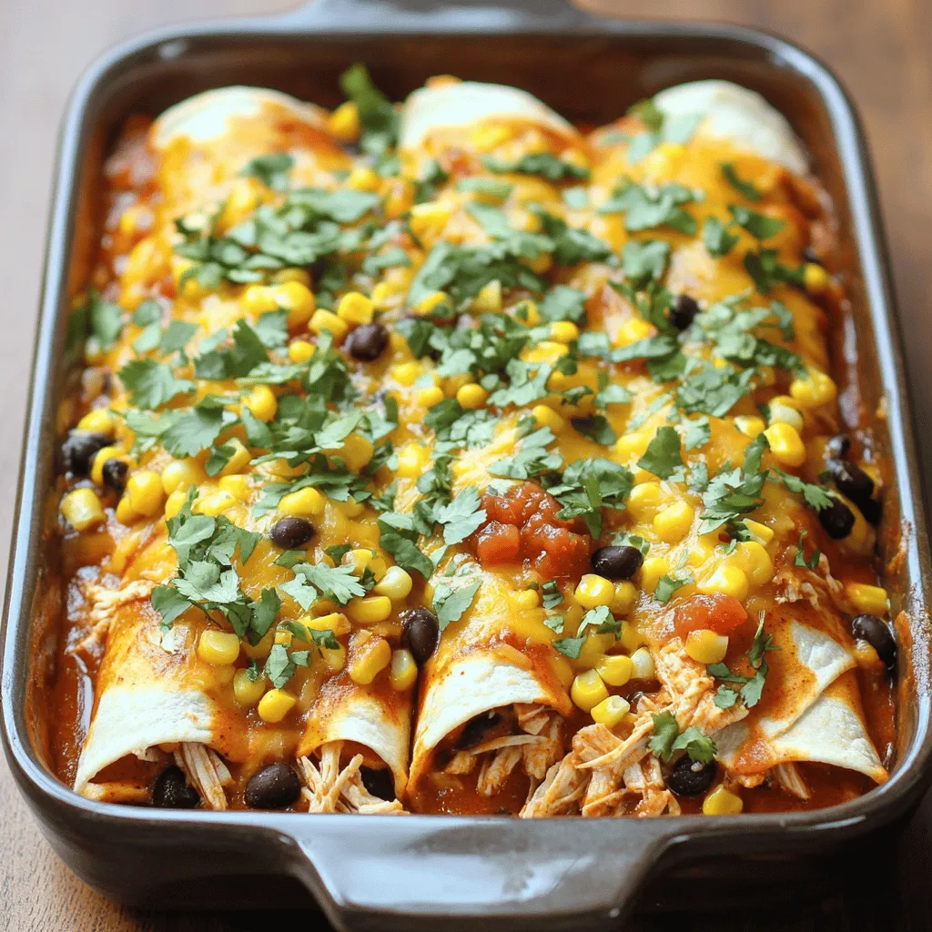 ![- 2 cups cooked chicken, shredded - 1 cup canned black beans, rinsed and drained - 1 cup fresh or frozen corn kernels The main ingredients create the heart of the chicken enchiladas. First, shredded chicken offers a tender and juicy base. I love using rotisserie chicken for ease. Black beans add protein and fiber, making the meal hearty. Corn brings sweetness and a pop of color. Each ingredient plays a role in making this dish satisfying. - 1 small red onion, finely chopped - 2 cloves garlic, minced - 1 teaspoon ground cumin - 1 teaspoon chili powder Aromatics and seasonings elevate the flavor. The red onion adds a sweet, savory taste. Garlic brings depth and aroma that fills your kitchen. Cumin provides a warm, earthy note. Chili powder adds a gentle kick. These elements create a rich base for the enchiladas. - 8 small corn tortillas - 2 cups shredded cheese (cheddar or Mexican blend) - ¼ cup fresh cilantro, chopped (for garnish) Tortillas hold everything together. I prefer corn tortillas for their authentic flavor. They warm up nicely, making them easy to roll. Cheese melts beautifully, creating a creamy topping. I recommend using a blend for extra flavor. Fresh cilantro adds brightness and a fresh touch. Together, these elements create a delightful finish to your enchiladas. For the full recipe, check out the Spicy Chicken Enchiladas. - Preheat your oven to 350°F (175°C). - Sauté red onion and garlic until fragrant. Start by heating a drizzle of oil in a large skillet over medium heat. Add the finely chopped red onion. Sauté for about 3-4 minutes until the onion turns soft and clear. Then, add the minced garlic and cook for another minute. This step makes your kitchen smell amazing and sets the stage for great flavor. - Combine chicken, black beans, corn, onion-garlic mixture, salsa, cumin, and chili powder. In a big mixing bowl, add the shredded chicken, rinsed black beans, and corn. Pour in the sautéed onion and garlic mixture, along with your choice of salsa. To spice it up, add cumin and chili powder. Mix everything well. This filling is packed with protein and flavor, making your enchiladas both tasty and hearty. - Warm tortillas and fill with chicken mixture. - Roll and arrange in baking dish. Now, warm the corn tortillas in a dry skillet or microwave. This makes them soft and easy to roll. Take about ¼ cup of the chicken mixture and place it in the center of each tortilla. Sprinkle a little cheese on top, then roll them up tightly. Place the rolled tortillas seam-side down in a greased 9x13 inch baking dish. This step is where the magic begins! - Cover with salsa and cheese, bake with foil, then uncovered. Pour any remaining salsa over the top of the enchiladas. Sprinkle the rest of the cheese evenly on top. Cover your baking dish with aluminum foil to keep the moisture in. Bake in the preheated oven for 20 minutes. After that, remove the foil and bake for another 10 minutes. You want the cheese to melt and bubble. Once done, let the enchiladas cool for a few minutes. Garnish with fresh cilantro before serving. This adds a fresh flavor and a lovely touch. Enjoy your homemade chicken enchiladas! For more detailed steps, check out the Full Recipe. - Ensure tortillas are pliable to prevent cracking. Warm them in a skillet or microwave. - Use a mix of cheeses for more flavor. Try combining cheddar and pepper jack. - Serve with sour cream and additional cilantro for extra zest. - Integrate sides like rice or refried beans to complete the meal. - Overfilling tortillas can make them hard to roll. Stick to ¼ cup of filling. - Not letting them cool before serving can lead to a messy plate. Give them a few minutes. {{image_4}} You can make your chicken enchiladas even better for you. - Swap out cheese for a low-fat version. This change cuts calories. - Use whole wheat tortillas for extra fiber. This option boosts nutrition. Want to spice things up? Add some fun flavors! - Add jalapeños for extra heat. This will make your dish lively! - Experiment with different salsas. Try mild, medium, or spicy. Each adds a unique taste. Need to adjust for dietary needs? No problem! - Make it vegetarian by using black beans only. This keeps it hearty and filling. - Use corn tortillas for gluten-free options. They work perfectly in this dish. Feel free to explore these variations and make the recipe your own! To keep your chicken enchiladas fresh, store them in an airtight container. This helps prevent moisture loss and keeps flavors intact. Place them in the fridge where they can stay good for about 3-4 days. Label the container with the date, so you remember when you made them. If you want to save some for later, freezing is a great option. Wrap each enchilada tightly in foil before placing them in a freezer bag. This protects them from freezer burn. They can last for up to 3 months in the freezer. When you're ready to eat, simply thaw them overnight in the fridge. For the best taste and texture, reheat your enchiladas in the oven. Preheat your oven to 350°F (175°C). Place the enchiladas in a baking dish, cover with foil, and heat for about 20-25 minutes. Remove the foil for the last 5 minutes to crisp up the cheese. Enjoy them warm! Chicken enchiladas last about 3-4 days when stored properly. Keep them in an airtight container to maintain freshness. Always check for any signs of spoilage before eating leftovers. Yes, you can assemble chicken enchiladas ahead of time. Just prepare them and place them in the fridge before baking. This is a great way to save time, especially on busy days. You can add many tasty toppings to your enchiladas. Some options include: - Avocado - Guacamole - Green onions - Olives Feel free to get creative with your toppings. They can add color and flavor. You can easily customize this recipe. Adjust the spices to fit your taste. Add your favorite vegetables to the filling, like bell peppers or spinach. This makes the dish more personal and fun. Yes, you can use a s
