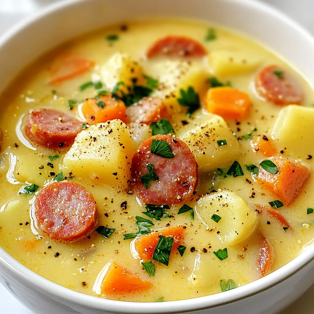 - 1 lb kielbasa sausage, sliced into bite-sized pieces - 4 medium potatoes, peeled and diced into cubes - 1 large onion, finely chopped - 3 cloves garlic, minced - 4 cups chicken broth, low-sodium preferred - 1 cup heavy cream - 2 tablespoons olive oil - 2 carrots, peeled and diced Kielbasa sausage is the star of this soup. Its smoky flavor gives the dish depth. I love how the sausage browns and adds richness to the broth. Next, we have potatoes and vegetables. Potatoes add heartiness, while carrots bring sweetness. They create a perfect base for the soup. You will also need broth and cream. I prefer low-sodium chicken broth. It allows me to control the salt level. Heavy cream provides a rich, dreamy texture. It makes the soup creamy and comforting. - 1 teaspoon dried thyme - 1 teaspoon smoked paprika - Salt and freshly ground black pepper to taste - Fresh parsley, chopped for garnish Seasonings are key to making this soup stand out. Dried thyme adds an earthy flavor. Smoked paprika gives the dish a hint of warmth. I always check the salt and pepper to balance the flavors perfectly. Lastly, fresh parsley is a must for garnish. It adds a pop of color and freshness. Each bowl looks inviting with a sprinkle on top. Enjoy this hearty soup with crusty bread or a side salad for a complete meal! {{ingredient_image_2}} 1. Heat 2 tablespoons of olive oil in a large pot over medium heat. 2. Add 1 large, finely chopped onion and 3 minced garlic cloves. 3. Sauté for about 5 minutes. The onion should be soft and clear. 4. Next, add 1 pound of sliced kielbasa sausage. Cook it for 5 to 7 minutes. 5. Stir often until the sausage is brown and fragrant. 1. Now, add 2 diced carrots and 4 peeled, cubed potatoes to the pot. 2. Stir everything together for about 3 minutes. This will soften the veggies. 3. Pour in 4 cups of low-sodium chicken broth. 4. Season with 1 teaspoon of dried thyme, 1 teaspoon of smoked paprika, salt, and black pepper. 5. Increase the heat to bring it all to a boil. Once boiling, lower the heat. 6. Let it simmer uncovered for around 20 minutes. The potatoes should be tender. 1. After the potatoes cook, use a potato masher to mash half of them in the pot. 2. This gives the soup a creamy texture while keeping some chunks. 3. Stir in 1 cup of heavy cream and mix well. 4. Heat it through for another 5 minutes, but don't let it boil. 5. Taste the soup and adjust the seasoning if needed. 6. Serve hot, garnished with fresh parsley for a pop of color. To ensure perfect potato texture, use medium-sized potatoes. They cook evenly and blend well. Dice them into small cubes for faster cooking. This helps them soften without losing shape. Adjusting seasonings to taste is key. Start with the basics: salt and pepper. After simmering the soup, taste it. If it feels flat, add more salt or a pinch of paprika. This brings out the flavors. For garnishing ideas, fresh parsley works wonders. It adds a pop of color and freshness. Chop it finely and sprinkle it on top just before serving. Serving pairings can enhance your meal. This soup goes great with crusty bread. A simple side salad can also balance the richness. Enjoy the warmth and comfort of each bite! Pro Tips Choose the Right Kielbasa: Opt for a high-quality kielbasa for the best flavor. Smoked varieties add a depth of taste that enhances the soup. Adjust the Creaminess: For a lighter soup, you can substitute half of the heavy cream with milk or use a plant-based cream alternative. Enhance the Flavor: Adding a splash of white wine or a tablespoon of Dijon mustard can elevate the overall flavor profile of the soup. Storage Tips: This soup can be stored in the refrigerator for up to 3 days. Reheat gently to avoid curdling the cream. {{image_4}} You can change the kielbasa for turkey or chicken kielbasa. This swap makes the soup lighter. The flavor remains rich and satisfying. If you prefer, you can even use a plant-based sausage for a vegetarian twist. You can also add different vegetables to the soup. Think about diced bell peppers, corn, or even green beans. Each choice adds texture and flavor. Mixing vegetables gives you options for seasonal produce too. Adding cheese can boost the creaminess of the soup. Try sharp cheddar or a sprinkle of Parmesan. This adds a depth of flavor that many will love. Fresh herbs, like dill or chives, can brighten the dish. They work well with the hearty kielbasa. You can also play with spice variations. Adding a pinch of cayenne pepper gives heat. You might enjoy a dash of Italian seasoning for a different flavor profile. Small adjustments can make a big difference in taste. To store leftovers of Kielbasa Potato Soup, let it cool first. Pour the soup into an airtight container. This helps keep it fresh. Place it in the fridge. It stays good for about three days. When you reheat, warm it gently on the stove. Stir well to mix the flavors back together. You can freeze Kielbasa Potato Soup too. Allow it to cool completely before freezing. Use freezer-safe containers or bags. Leave some space for it to expand. It can last up to three months in the freezer. When ready to eat, thaw it in the fridge overnight. Reheat on the stove until hot. Stir it well to bring back the creamy texture. Enjoy the comfort of this soup anytime! Yes, you can make Kielbasa Potato Soup in a slow cooker. Start by sautéing the onion and garlic in a pan, then add them to the slow cooker. Next, add the sliced kielbasa, diced potatoes, carrots, chicken broth, and seasonings. Cook on low for about 6-8 hours or on high for 3-4 hours. Add the cream in the last 30 minutes of cooking. To make this soup dairy-free, replace the heavy cream with coconut milk or a dairy-free cream alternative. You can also use a nut-based milk, like almond or cashew milk. Ensure that the broth is also dairy-free. This will keep the soup creamy while fitting your diet. Kielbasa Potato Soup pairs well with crusty bread or a fresh side salad. A simple green salad with vinaigrette